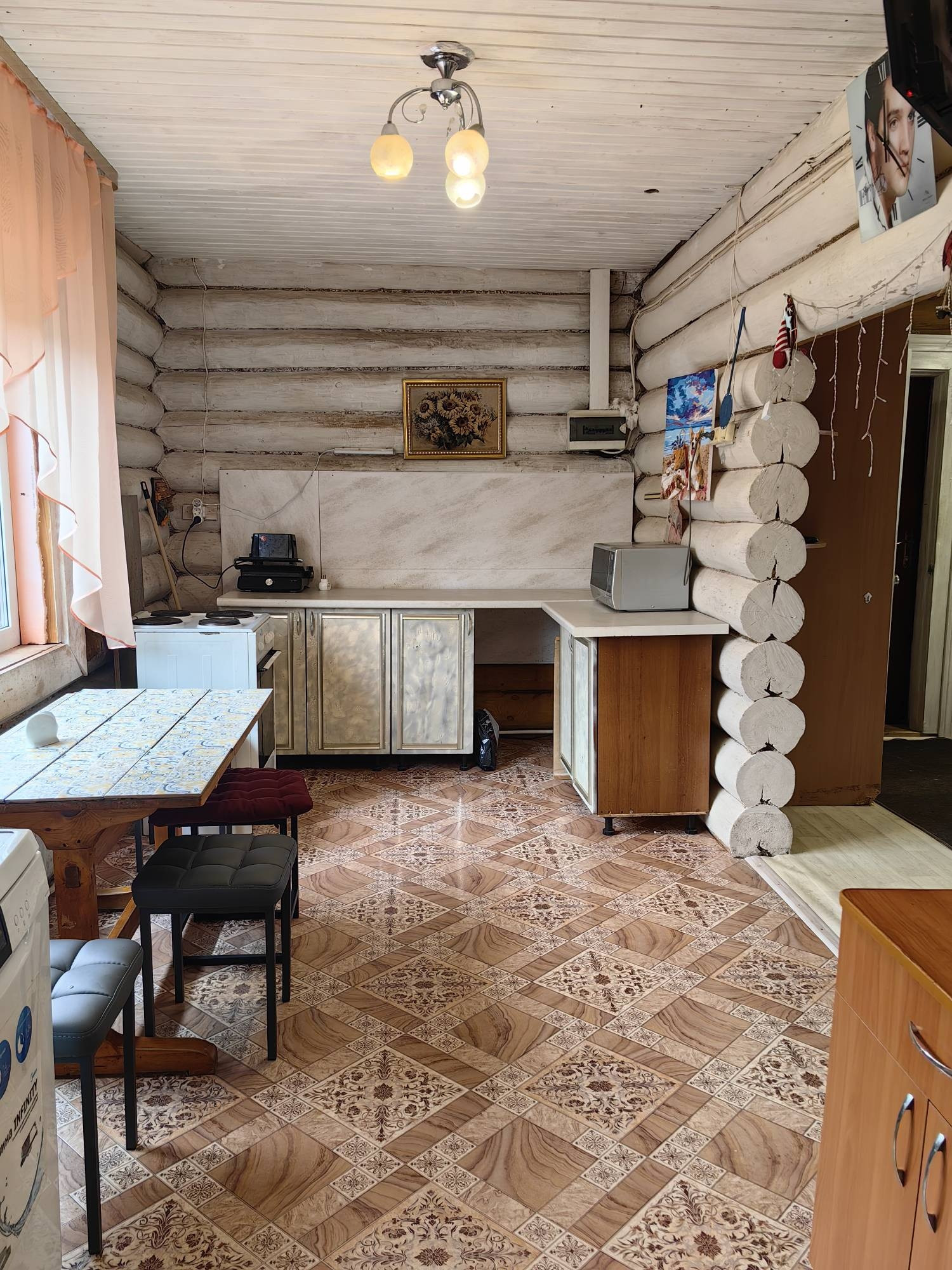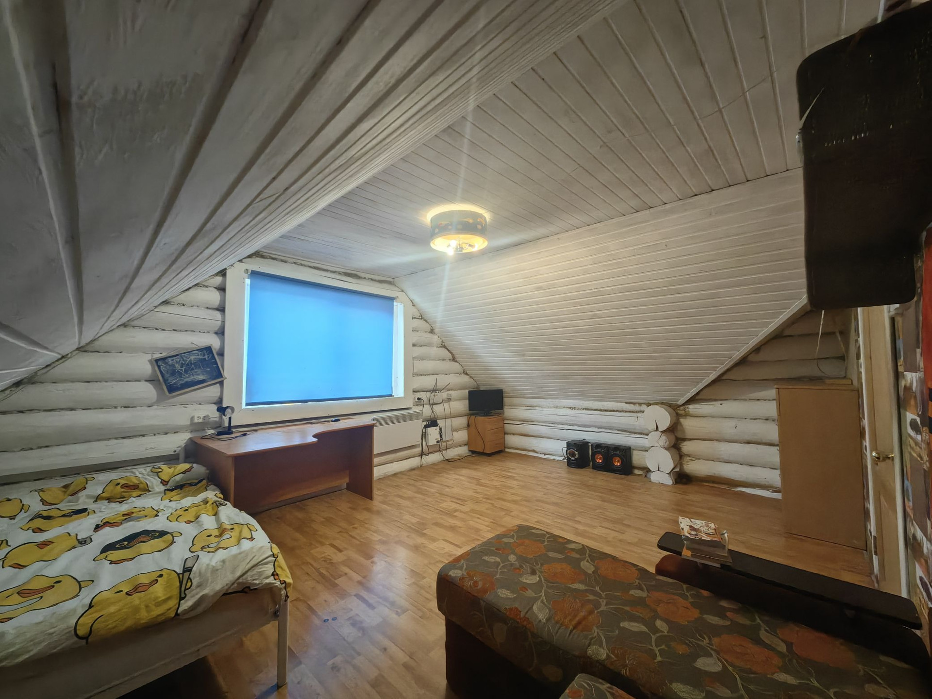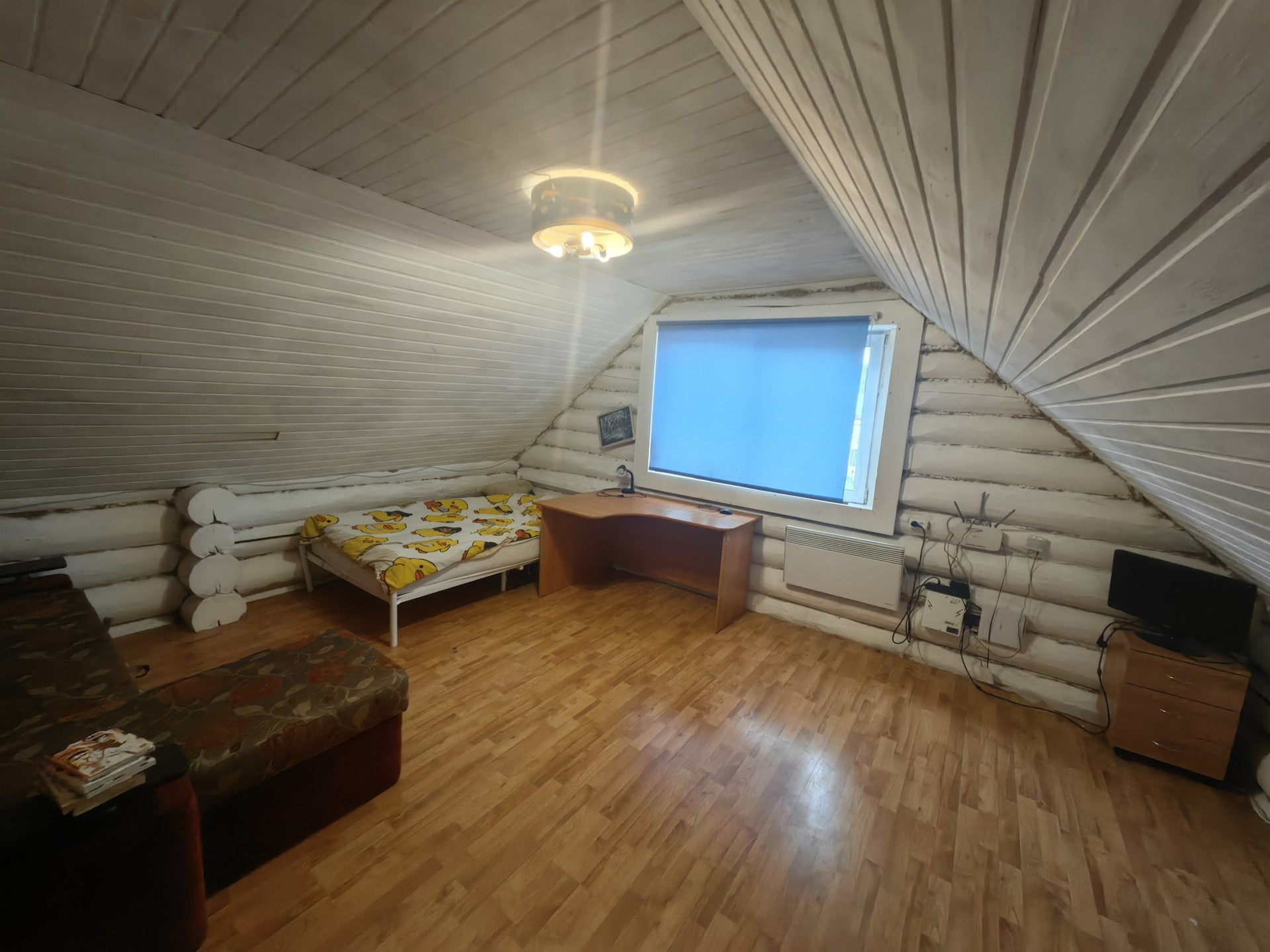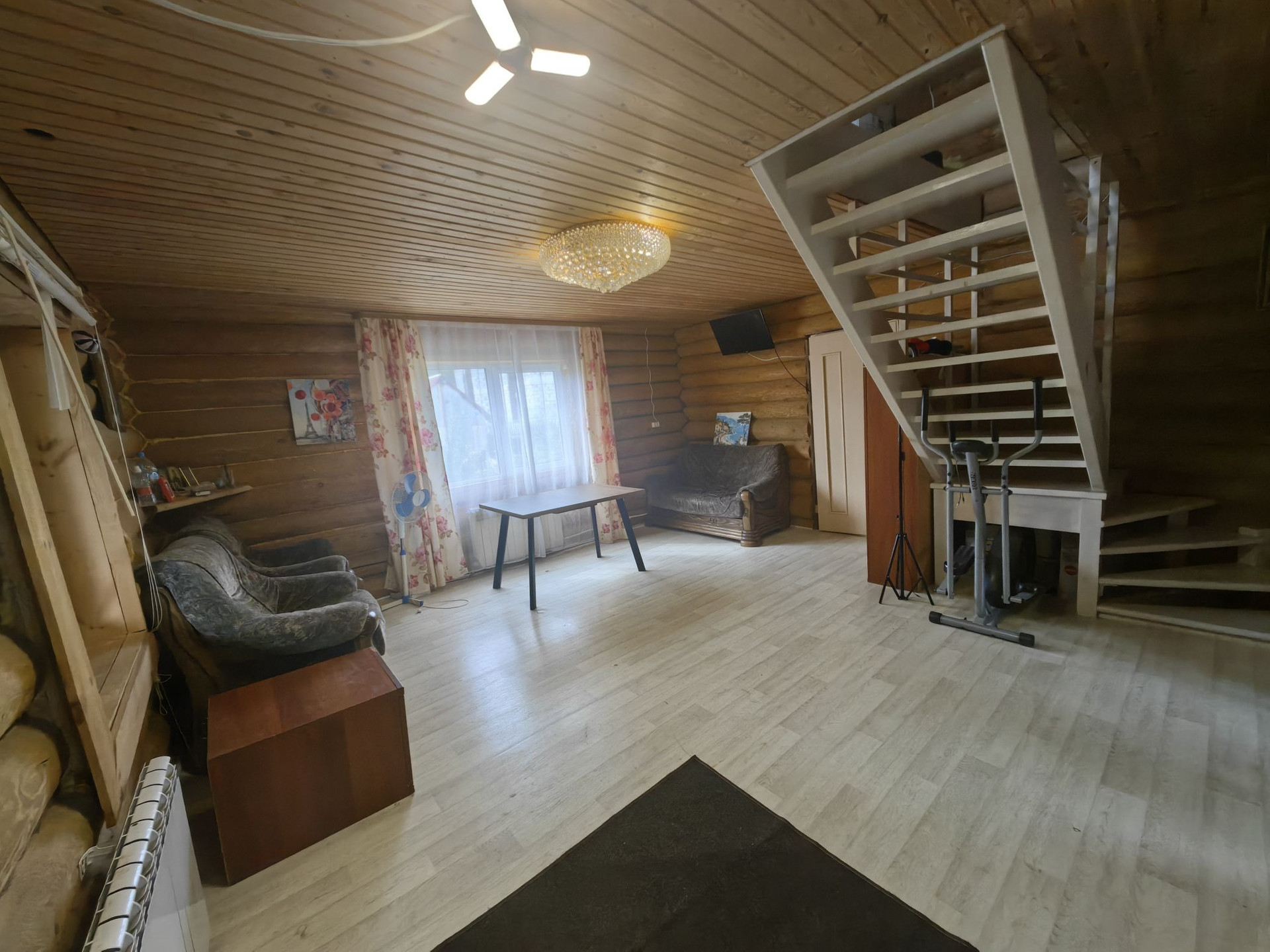 Площадью 110кв.м., первый этаж гостиная комната, спальня, кухня, сан узел, второй этаж две спальни, балкон. Дом из бревна, очень теплый, отопление электро, установлен твердотопливный котёл, низкие коммунальные платежи,