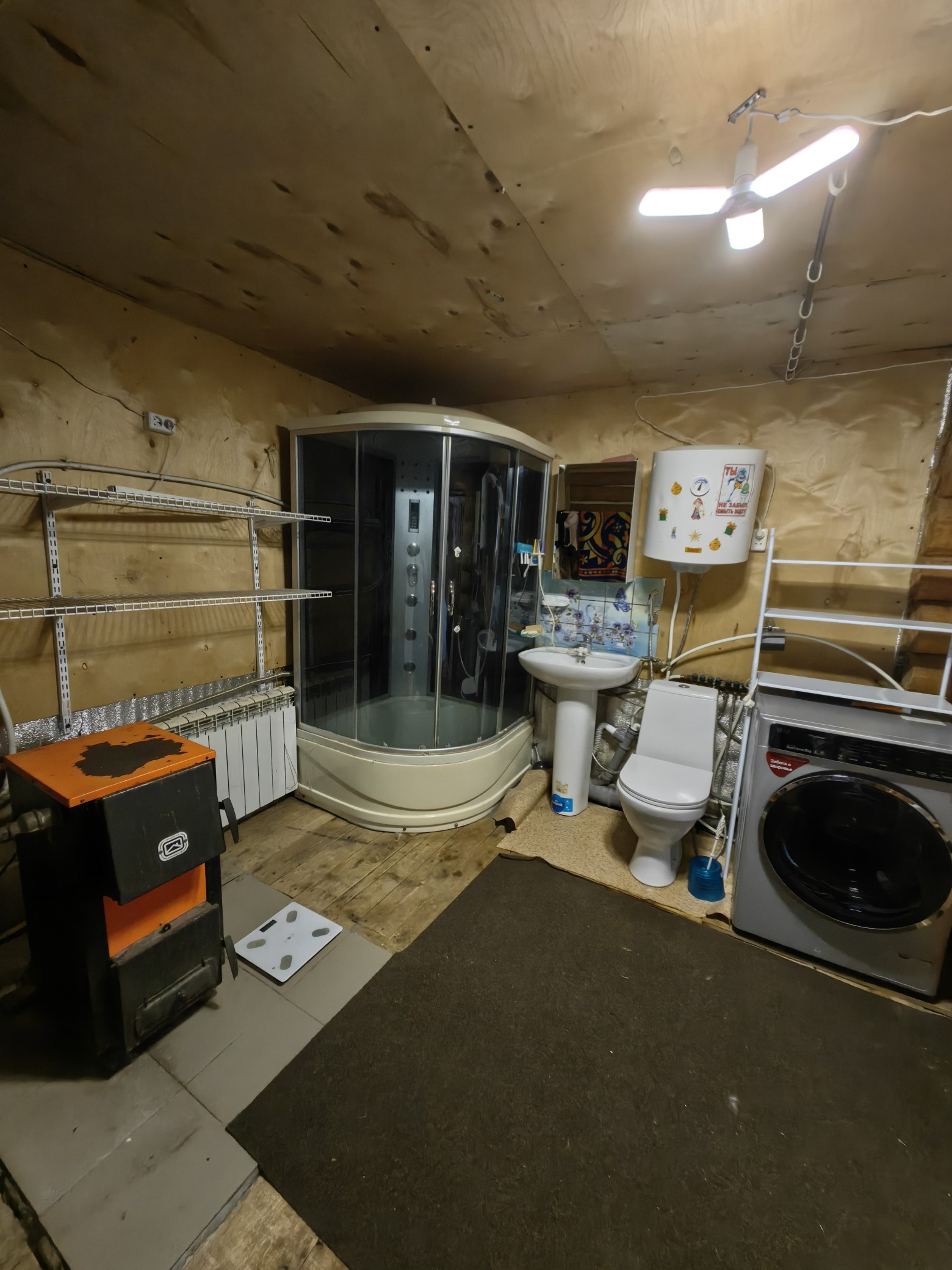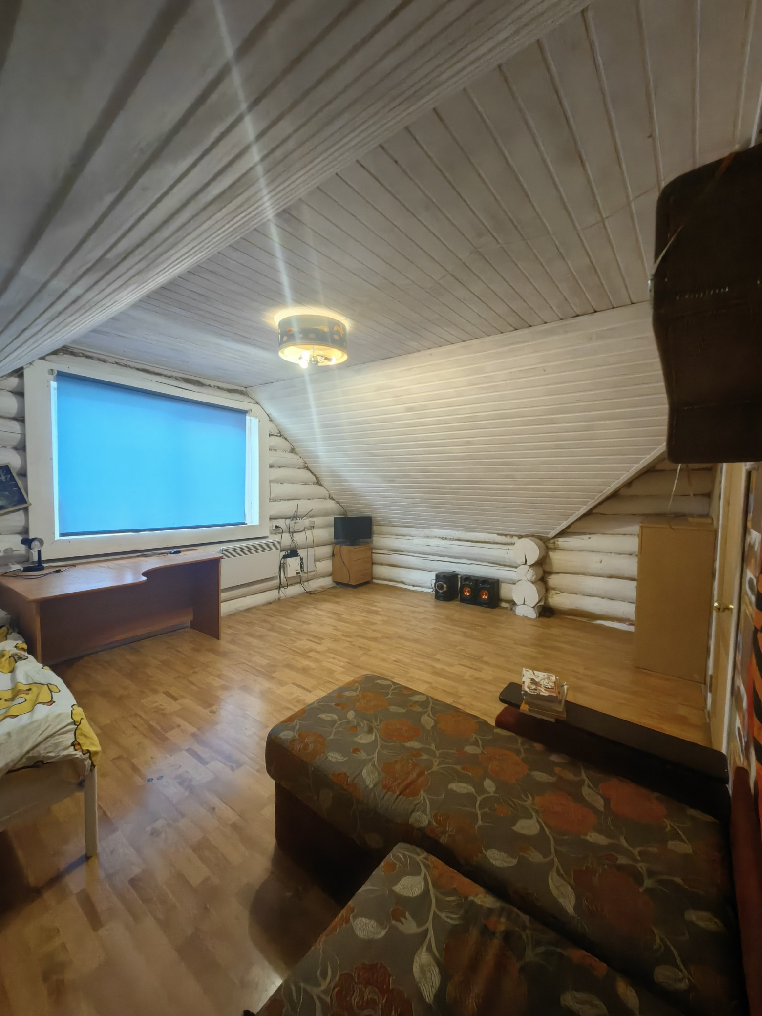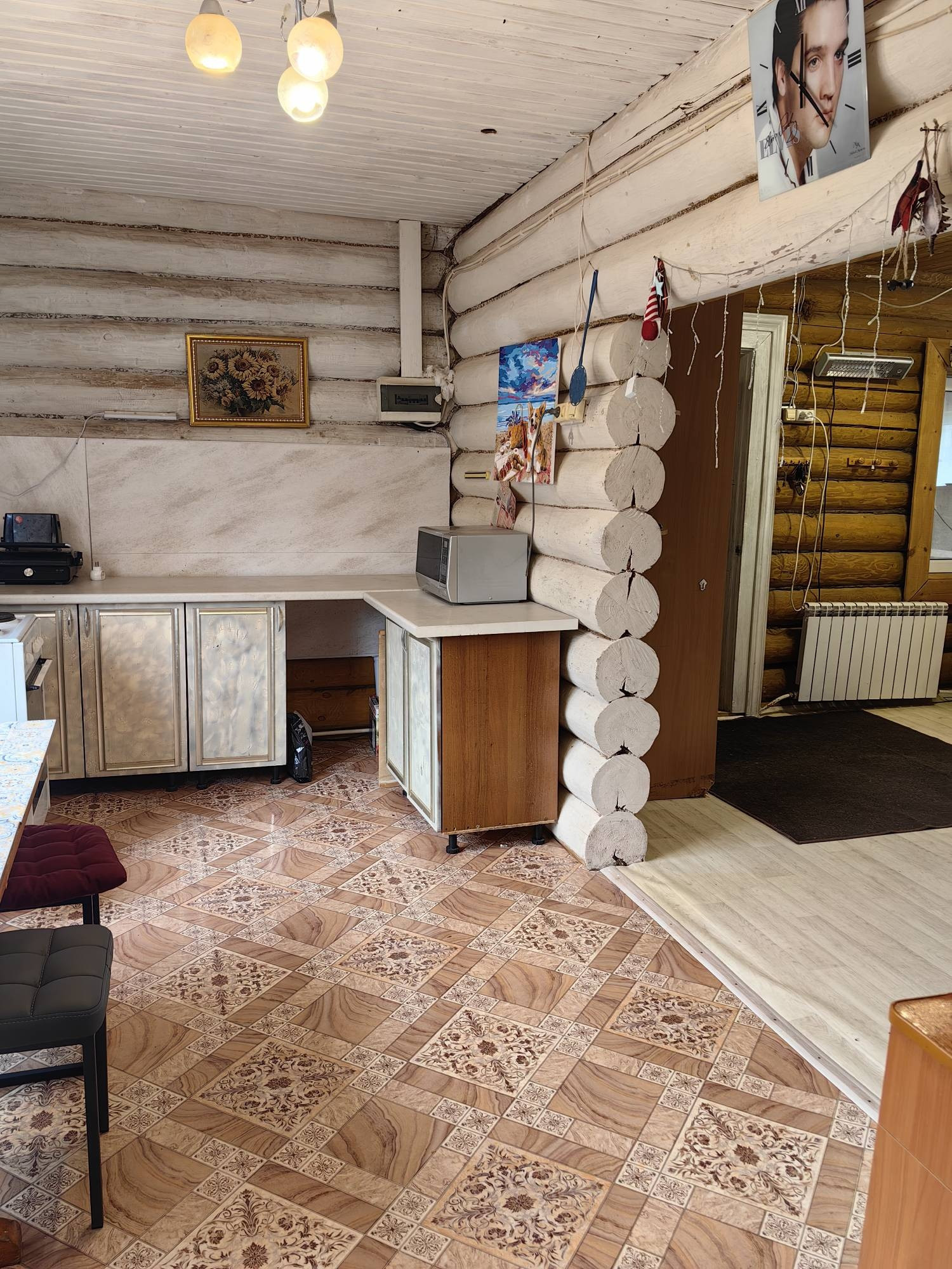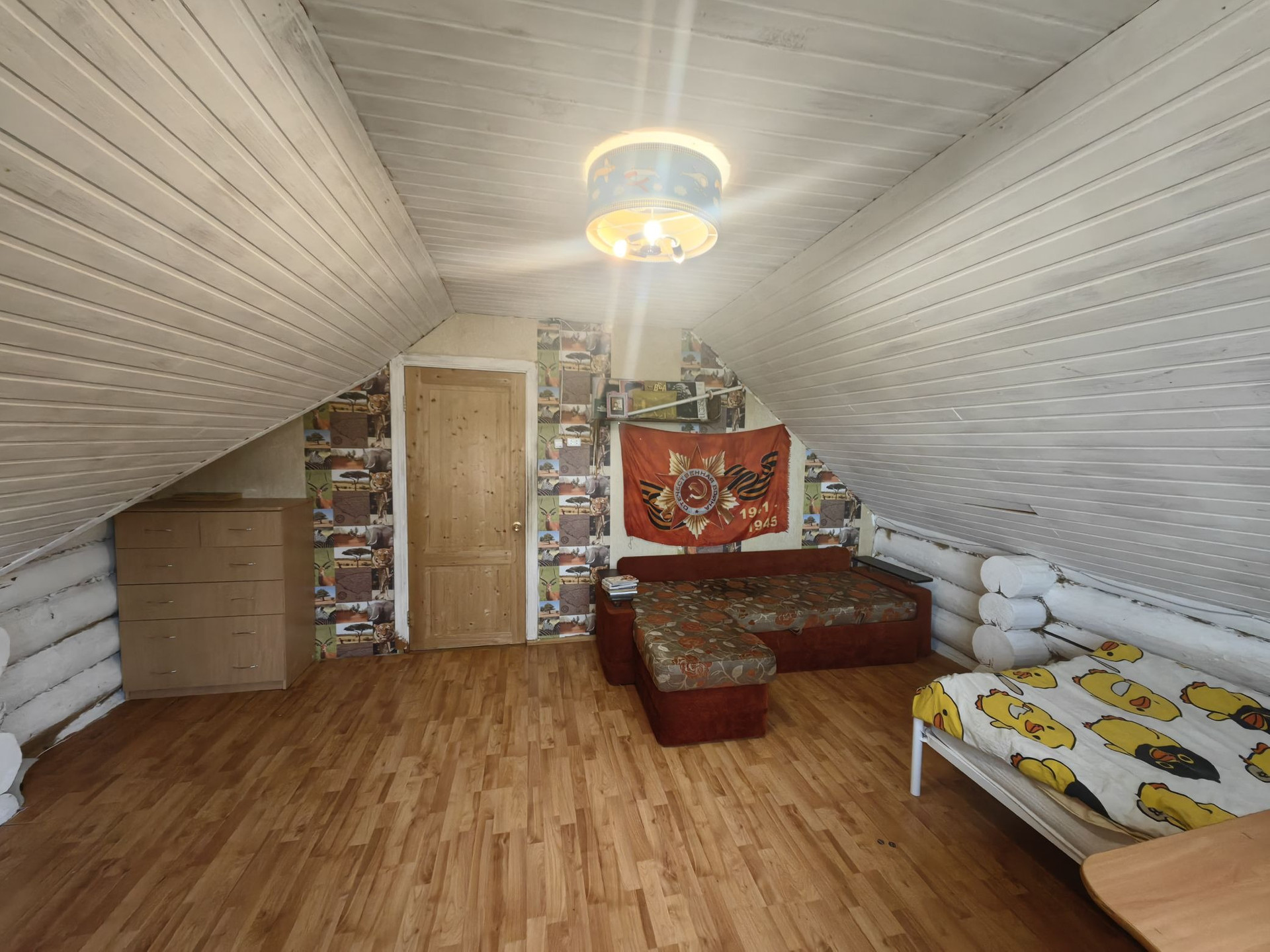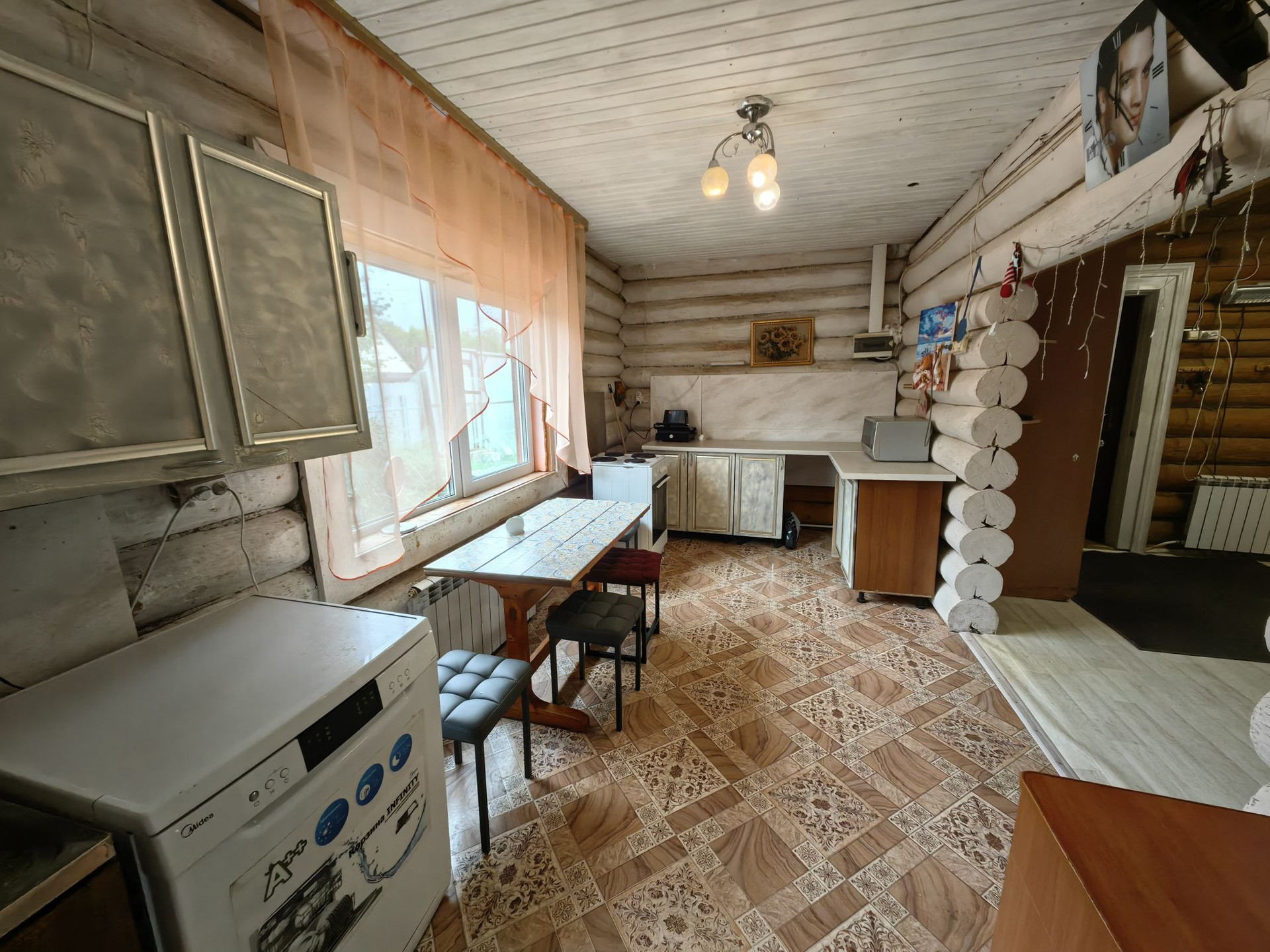 Площадью 110кв.м., первый этаж гостиная комната, спальня, кухня, сан узел, второй этаж две спальни, балкон. Дом из бревна, очень теплый, отопление электро, установлен твердотопливный котёл, низкие коммунальные платежи,