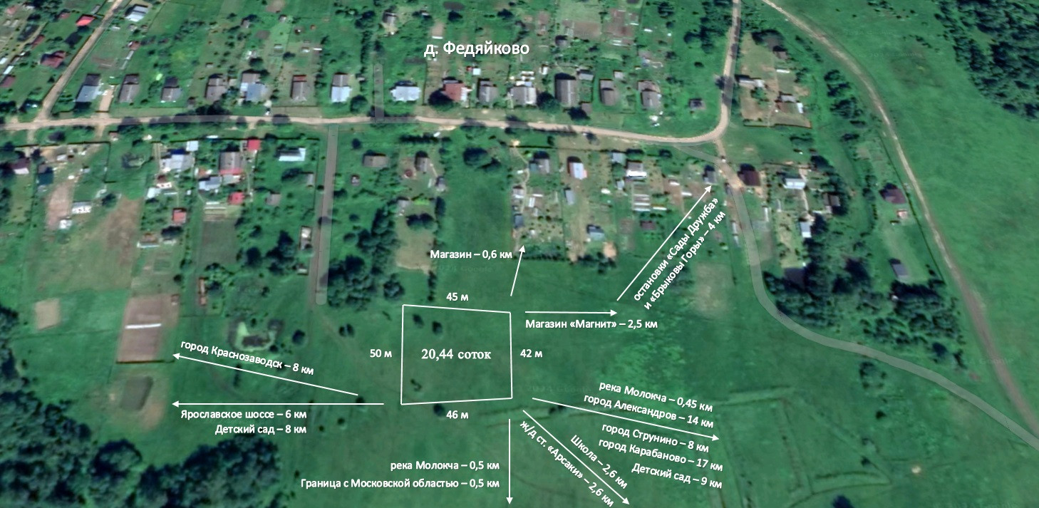 - транспортная доступность также порадует: на машине от Москвы (МКАД) 93 км по Ярославскому шоссе (1 час и 30 минут) или 108 км по Щелковскому шоссе; своим ходом можно добраться от Ярославского вокзала до ж/д станции Арсаки, а также автобусной остановки, которая находится в часе ходьбы от участка;