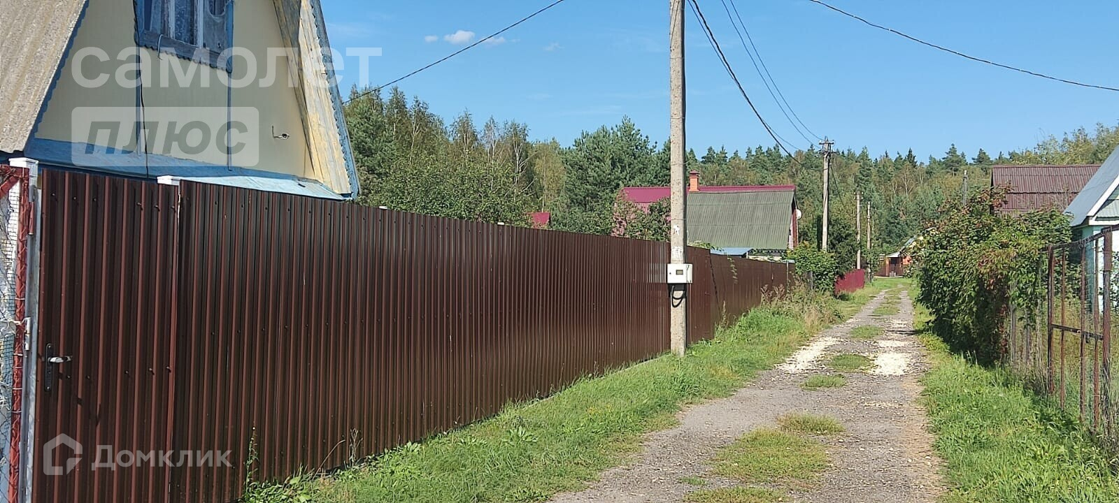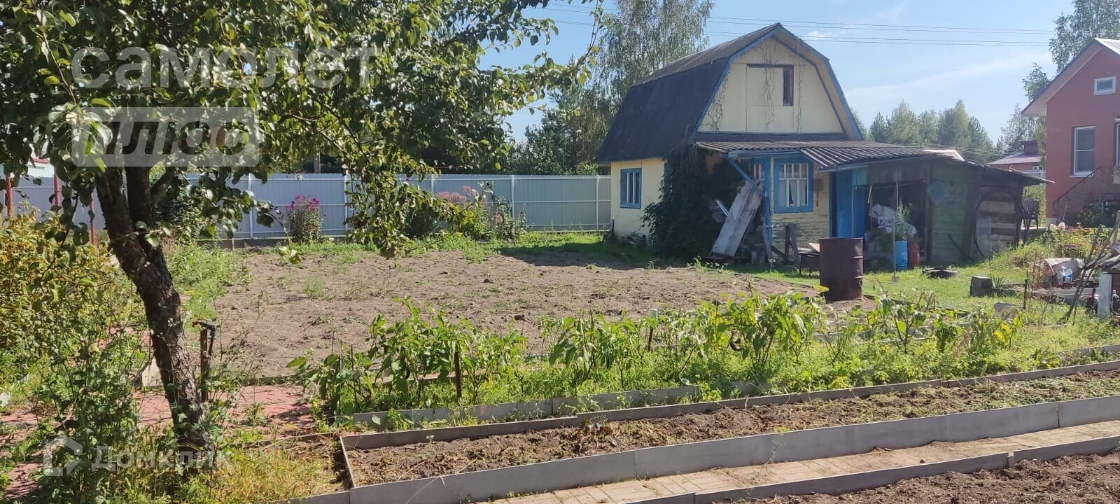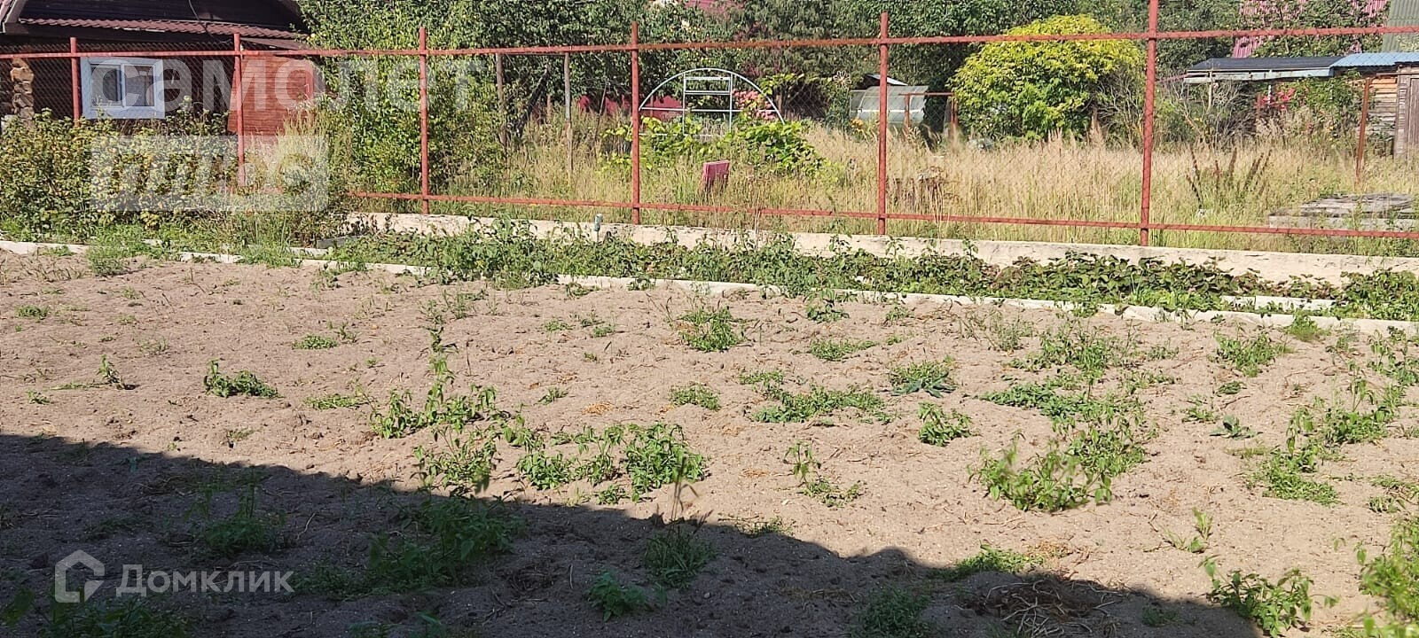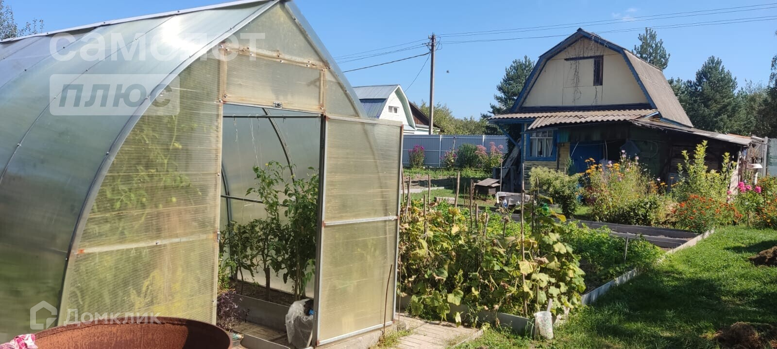 Участок огорожен со всех сторон, перед фасадом забор из профнастила, по фронтальной части рабица в рамах из металлических уголков. На участке две большие теплицы.