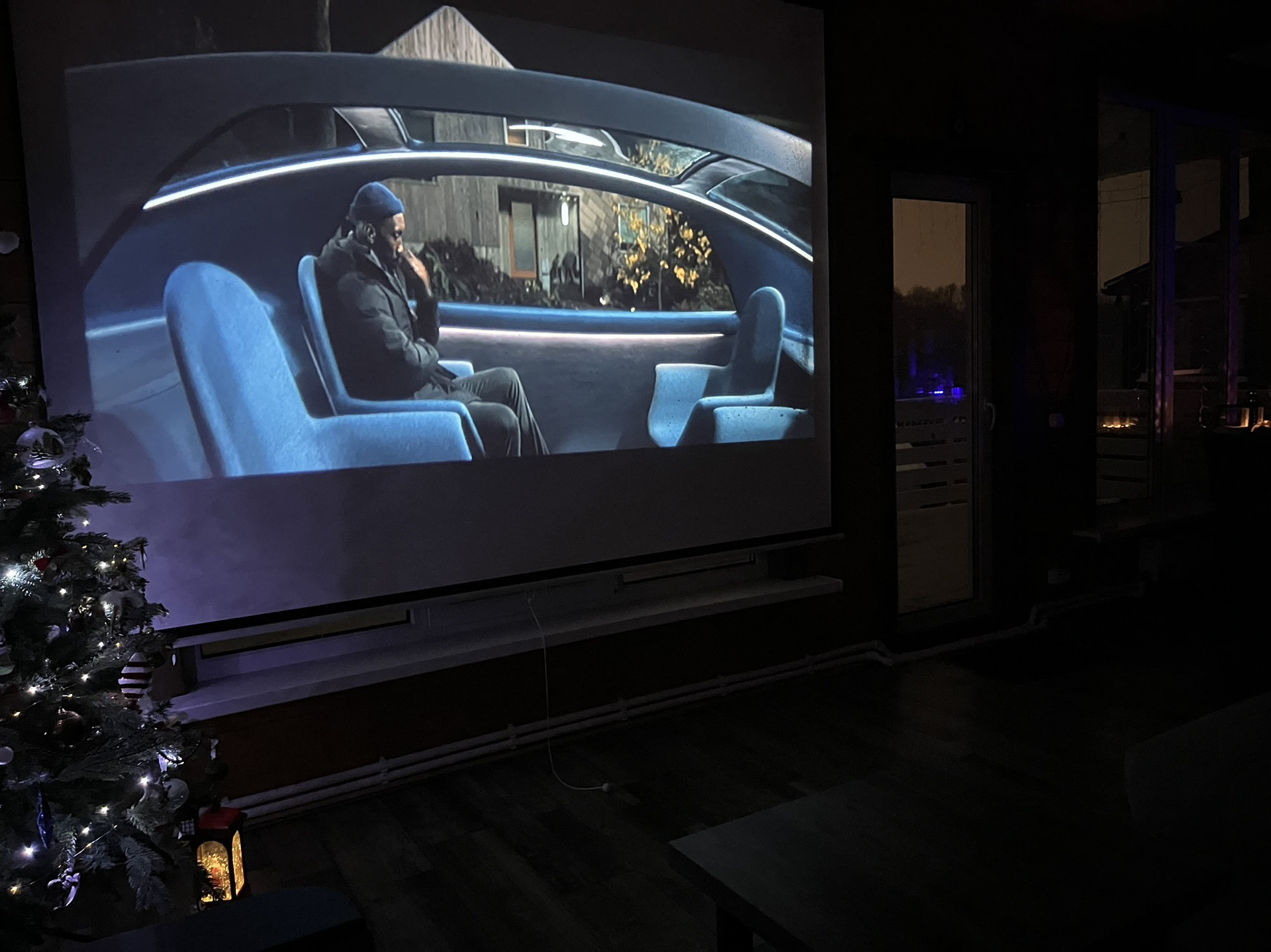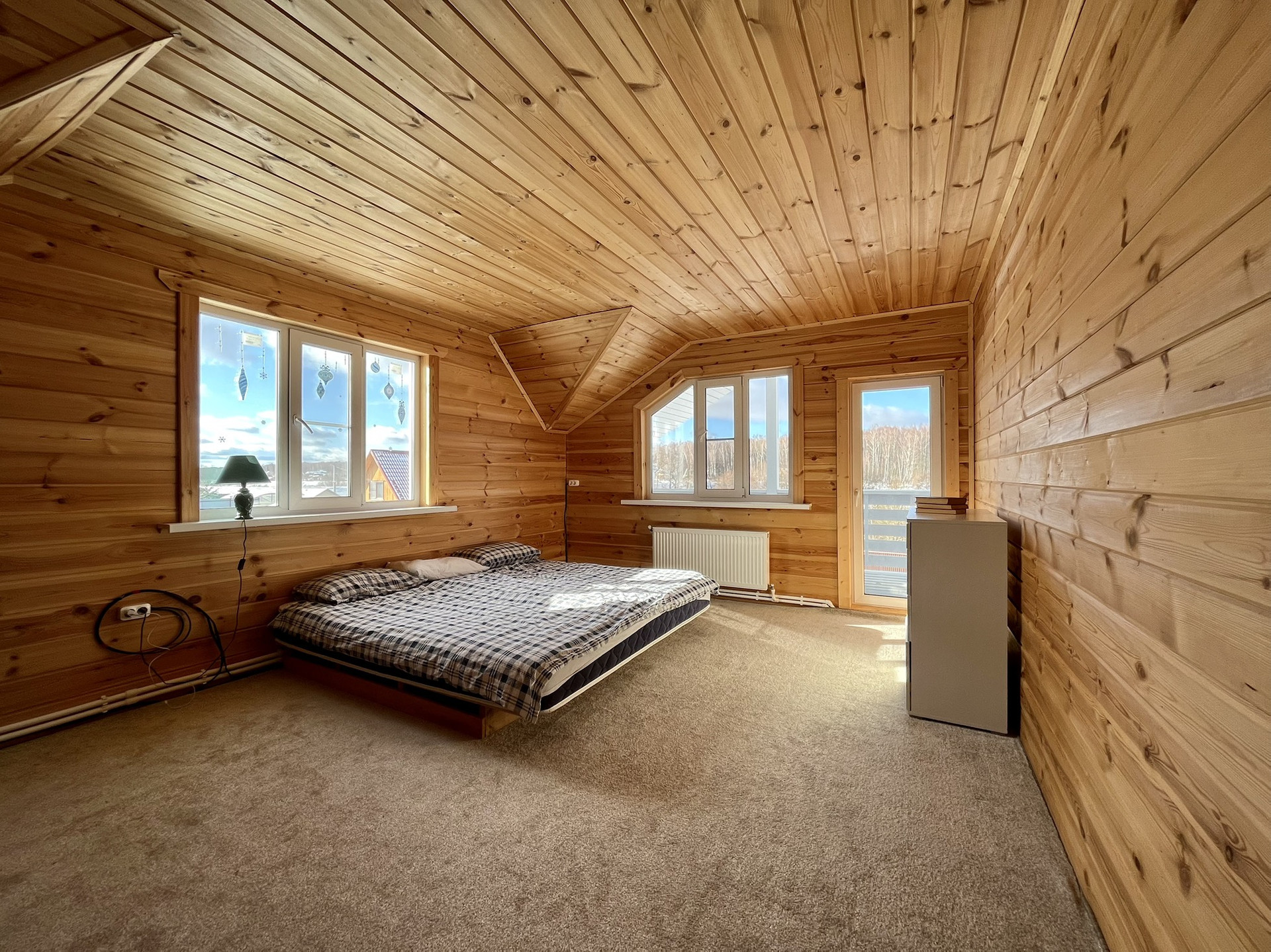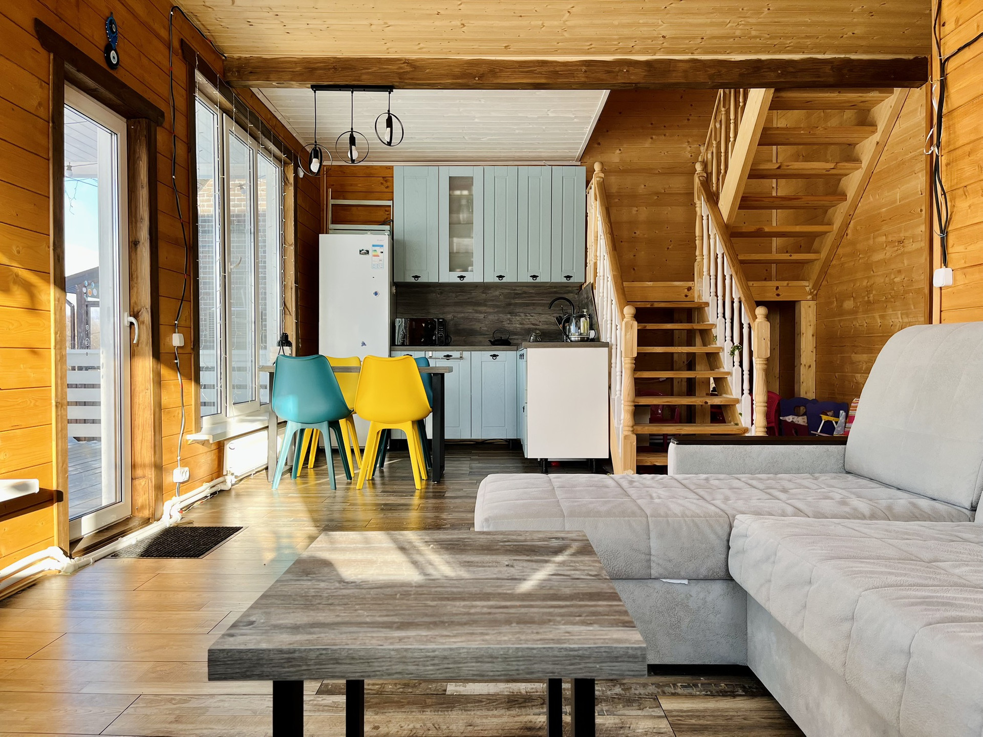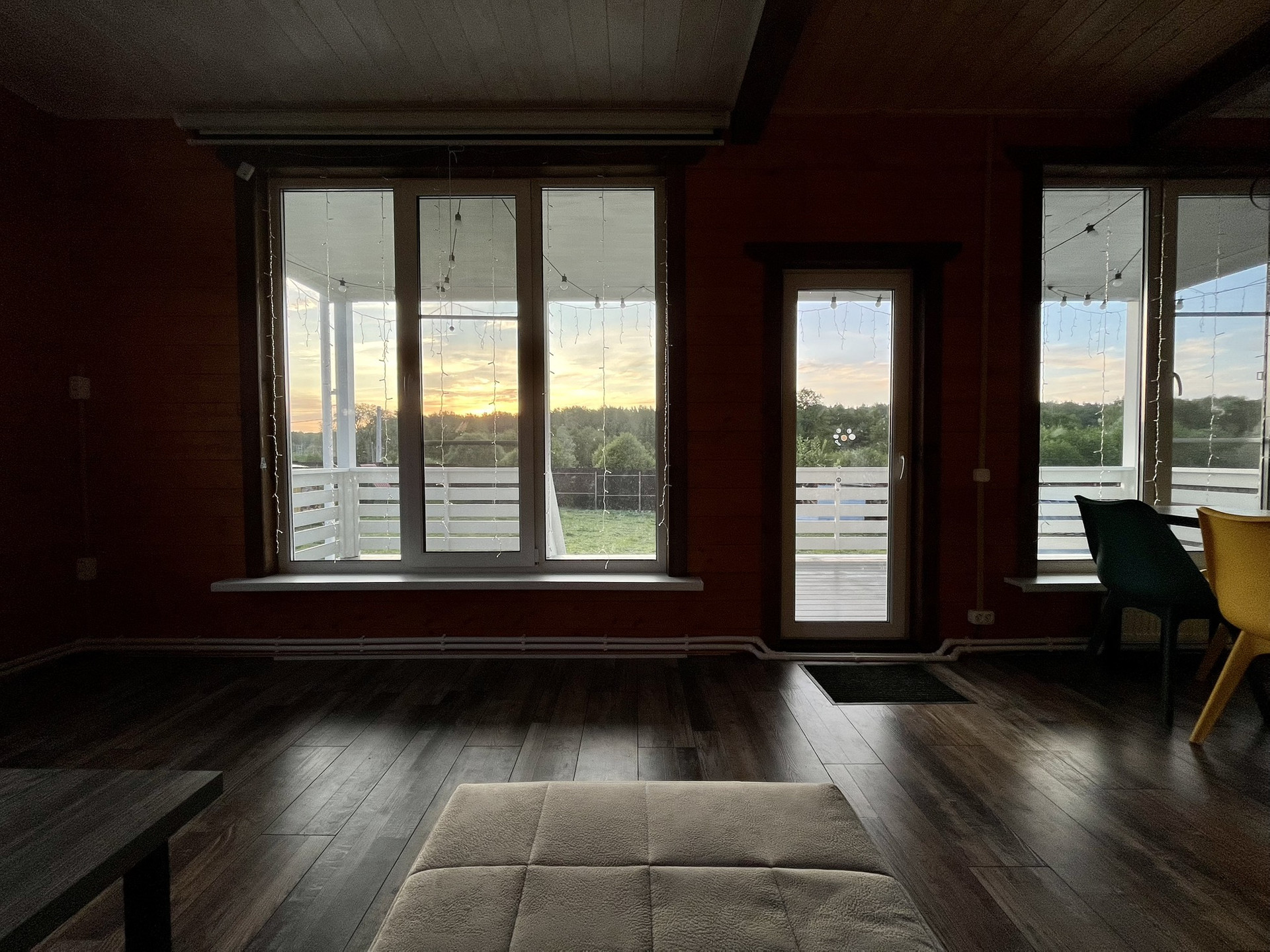 На первом этаже огромная терраса 20м, над ней во всю длину балкон. Из огромных панорамных окон открывается прекрасный вид на лес, а вечером можно опустить экран во всё окно для просмотра фильмов всей семьёй на проекторе