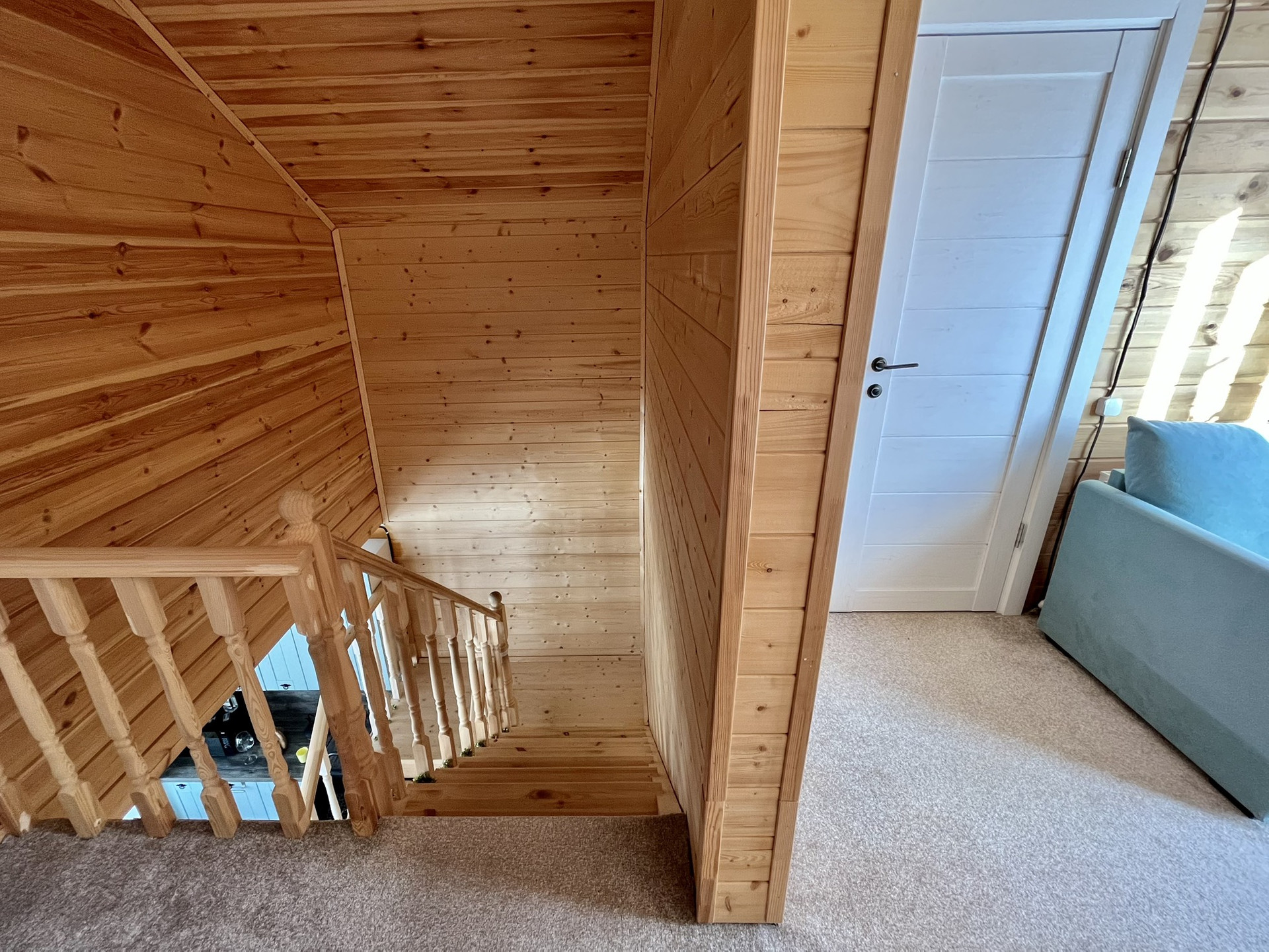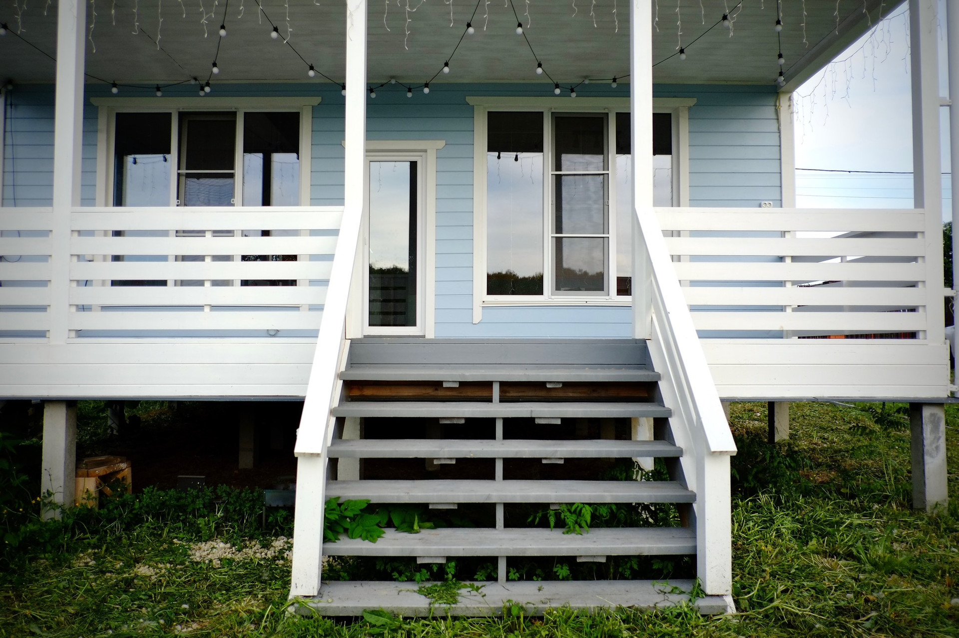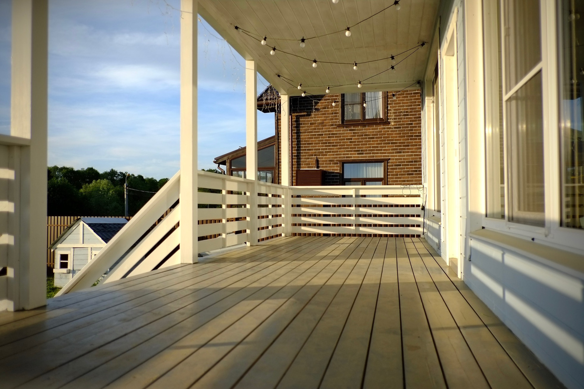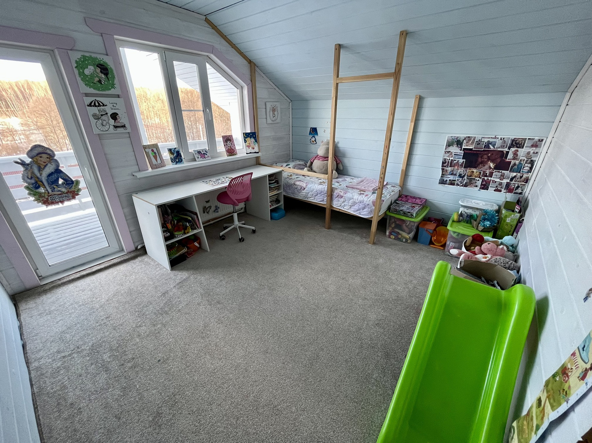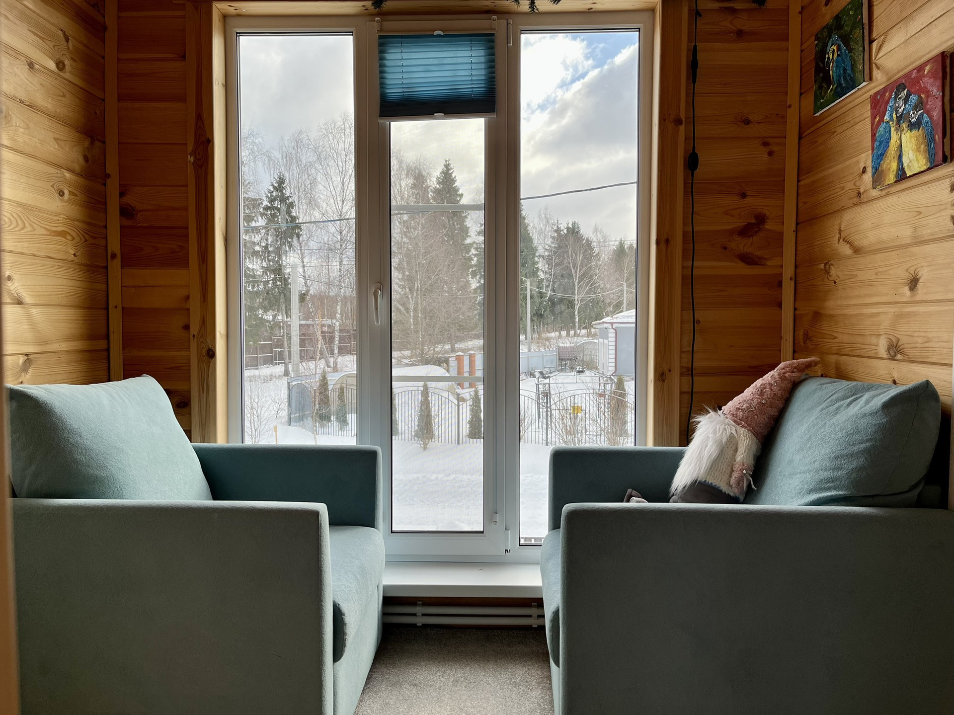 На первом этаже огромная терраса 20м, над ней во всю длину балкон. Из огромных панорамных окон открывается прекрасный вид на лес, а вечером можно опустить экран во всё окно для просмотра фильмов всей семьёй на проекторе