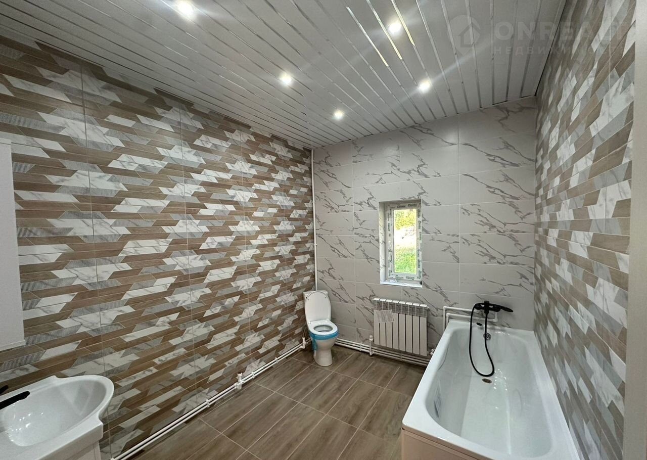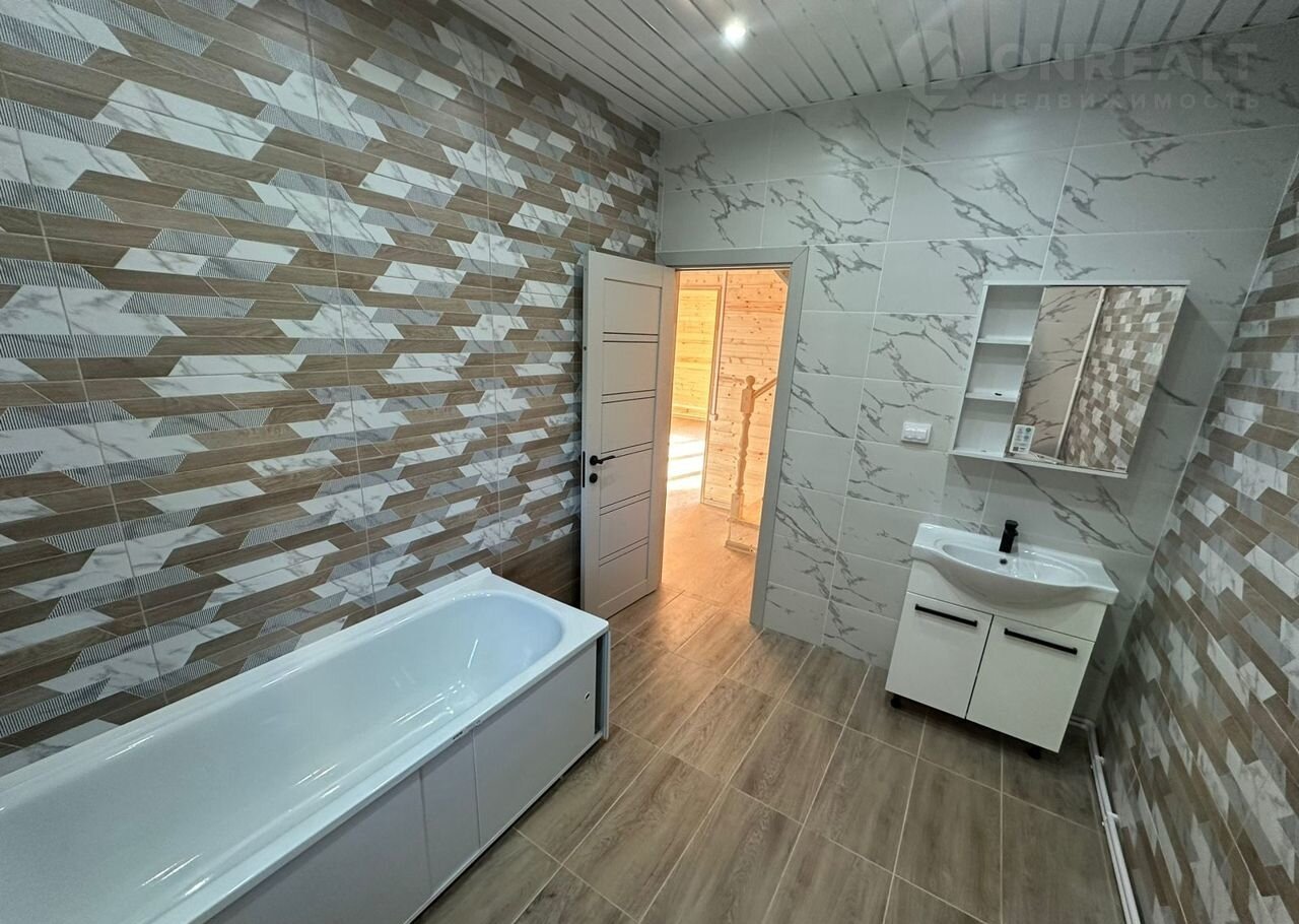 Внутри дом обшит вагонкой, снаружи имитация бруса. Ванная выложена плиткой и установлена сантехника и мебель.