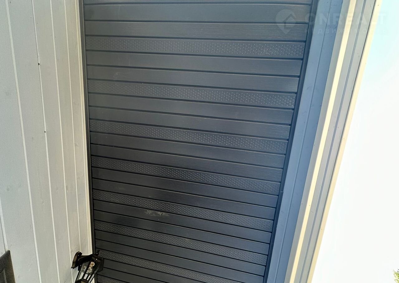 Дом обшит имитацией бруса и выкрашен.