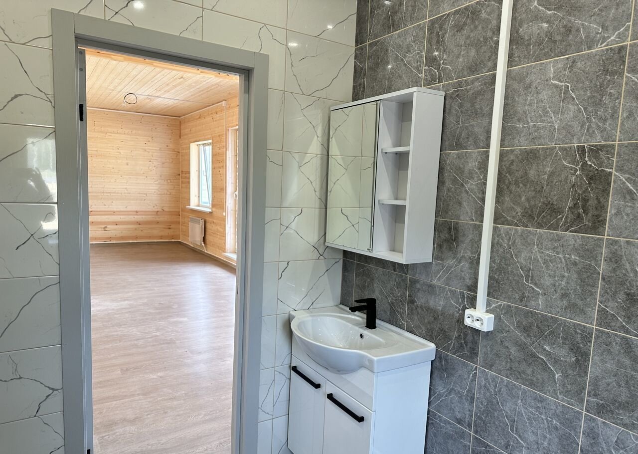 Внутри дом обшит вагонкой, снаружи имитация бруса. Ванная выложена плиткой и установлена сантехника и мебель.