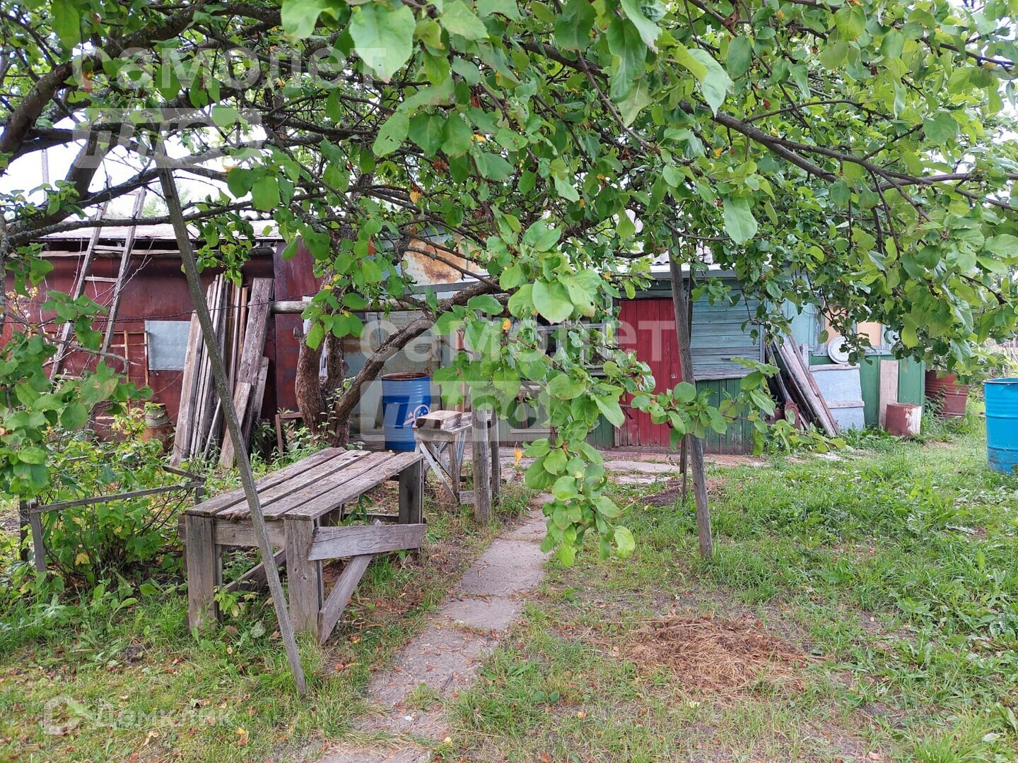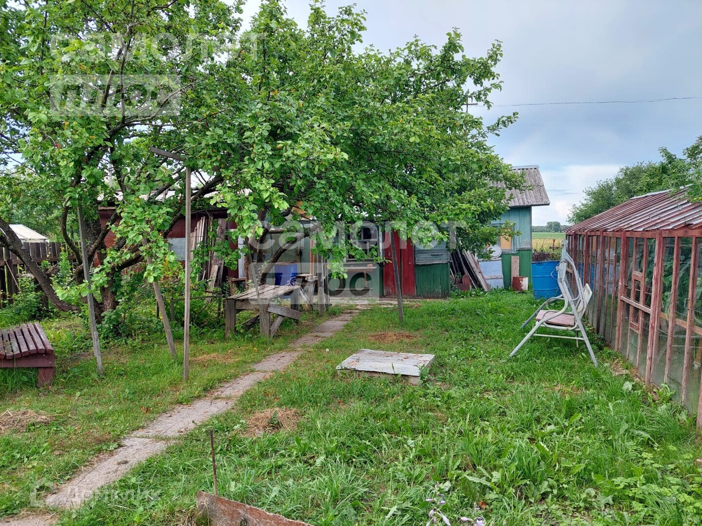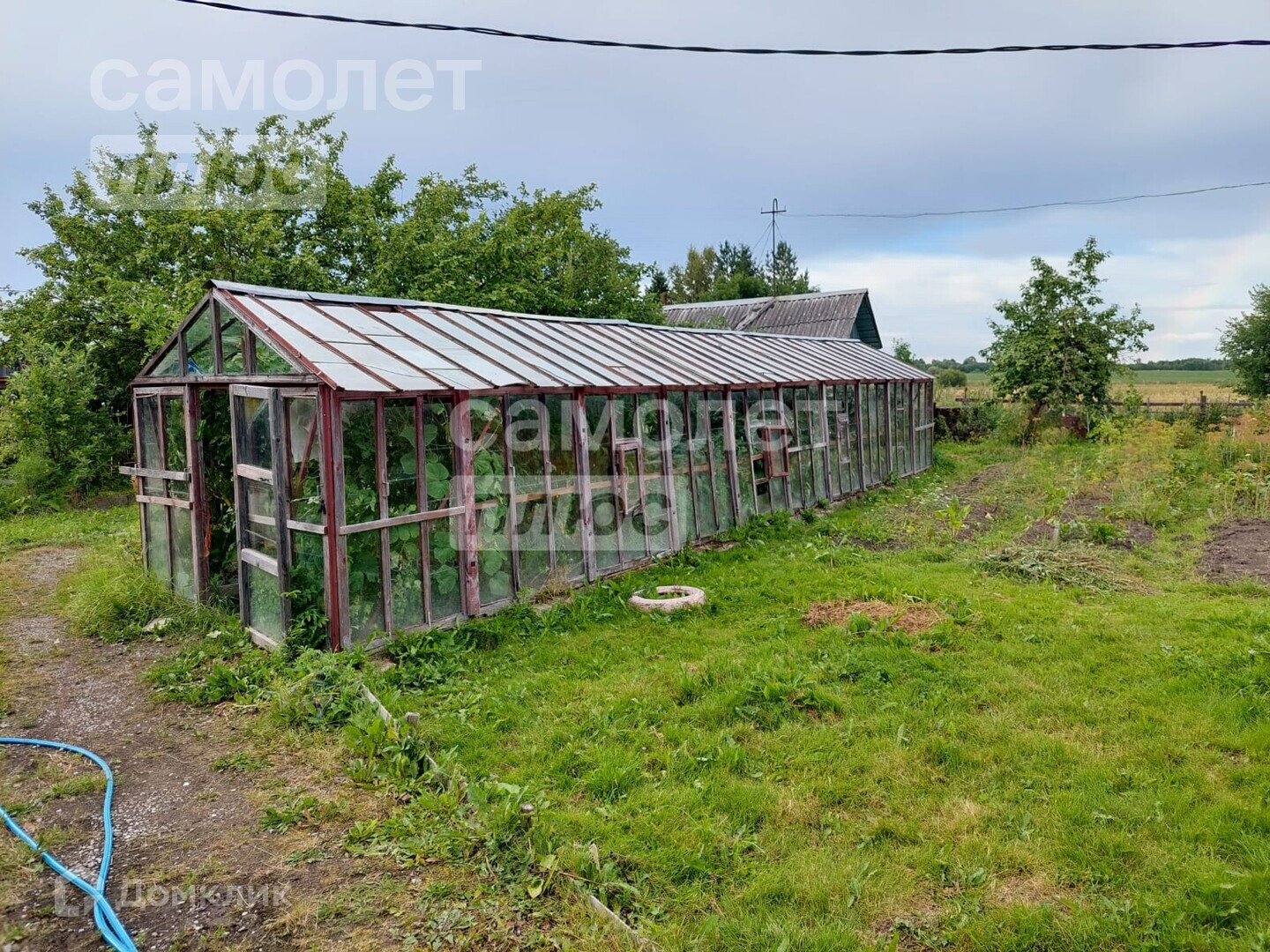 В большом доме 5 комнат. Внизу 3 комнаты и вверху 2 комнаты . Туалет в доме. Есть газ, в баллонах, привозной. Имеется русская печь, которая обогревает весь дом в холодный период. На территории участка есть баня, несколько сараек. Также есть колодец, теплицы.