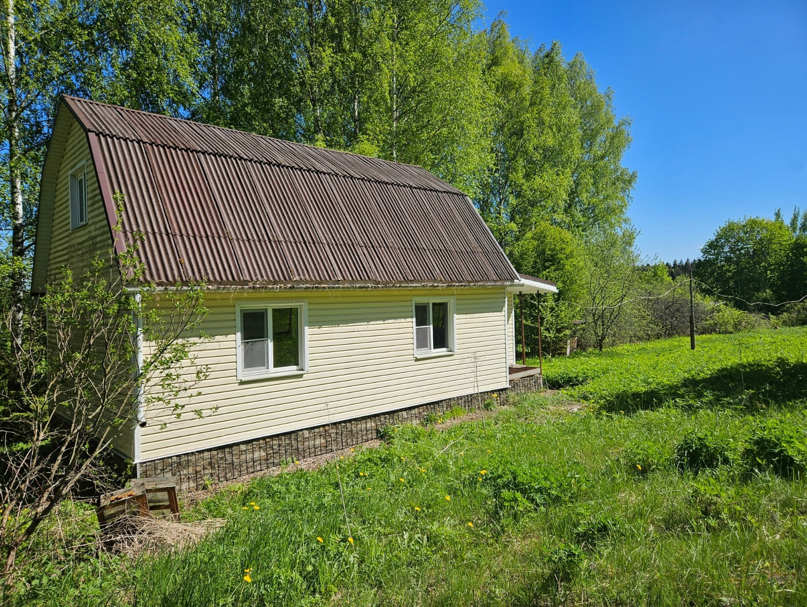 Московская область, городской округ Солнечногорск, деревня Фоминское. Продаю 2-х этажный  дом 65 кв.м.  на земельном участке 9 соток (ИЖС).  Участок с небольшим уклоном, огорожен забором. Дом из бруса, обшит сайдингом, утеплен. Планировка: утепленная веранда, кухня- гостиная, 2 комнаты, на втором этаже - помещение свободного назначения (можно сделать две комнаты). Электричество заведено в дом и разведено. Деревня находится в очень живописном месте в окружении леса, в шаговой доступности водоём. От автобусной остановки 20 минут пешком.