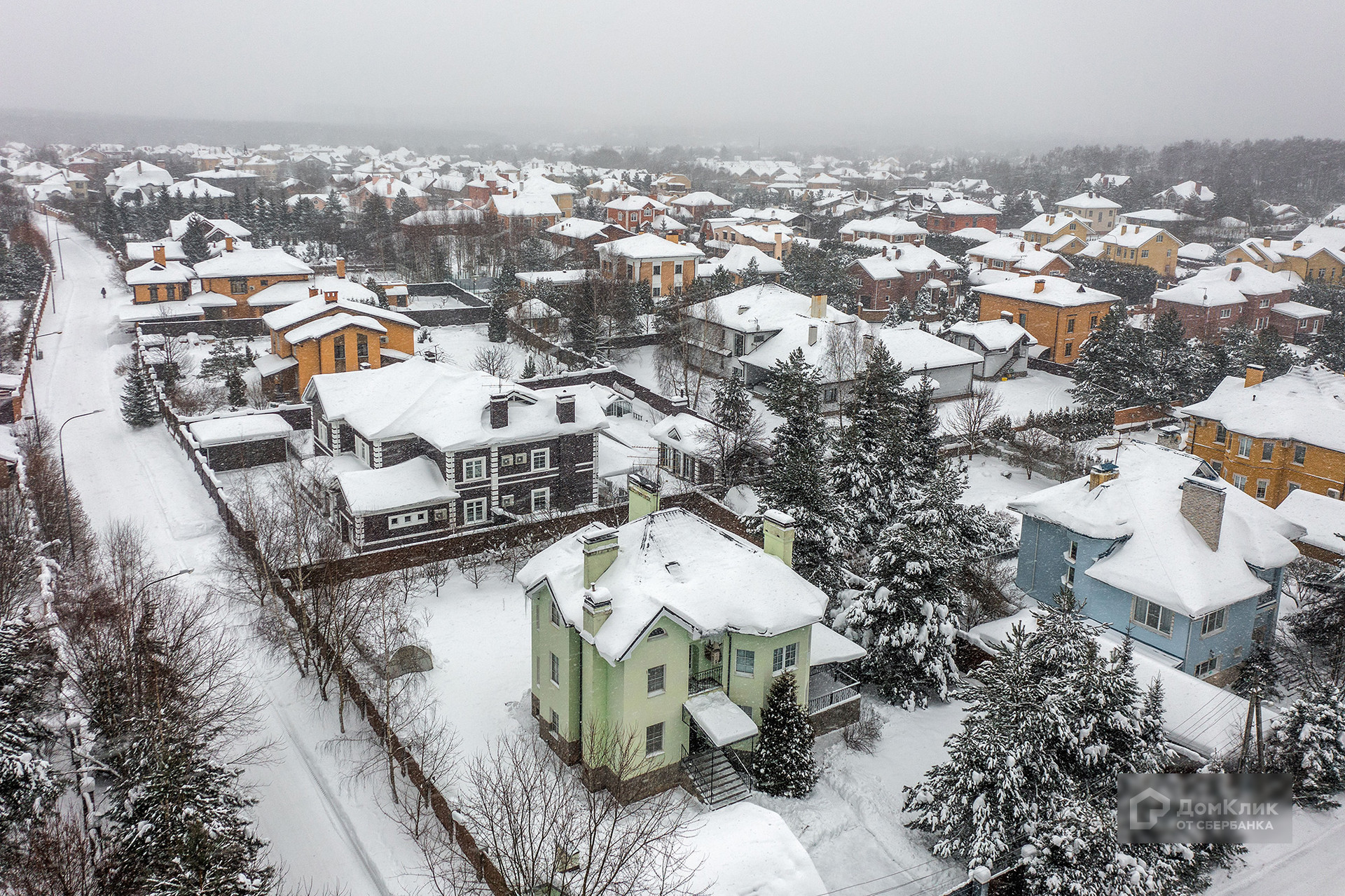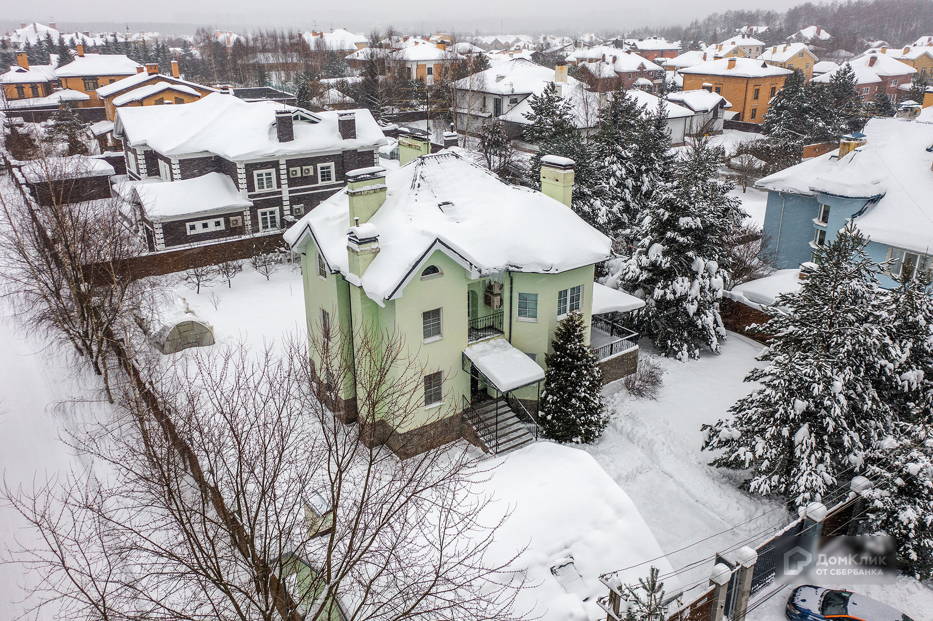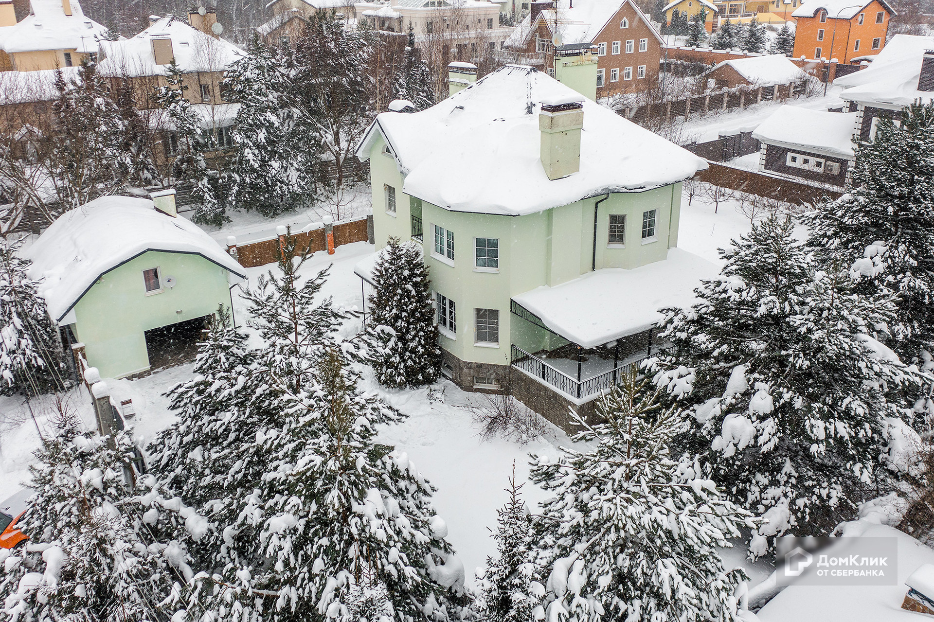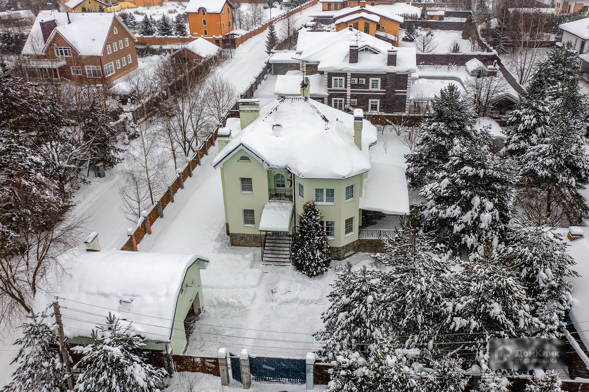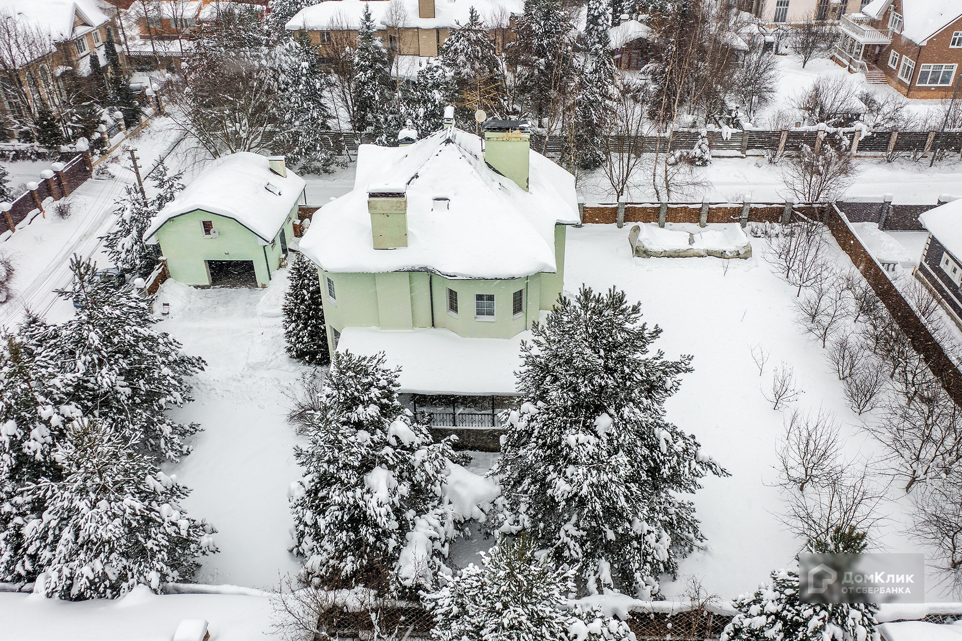 Дом расположен на ровном участке 15 соток, на участке растут взрослые сосны и кустарники. Помимо основного дома также на участке построен отдельно стоящий гараж с квартирой для персонала.