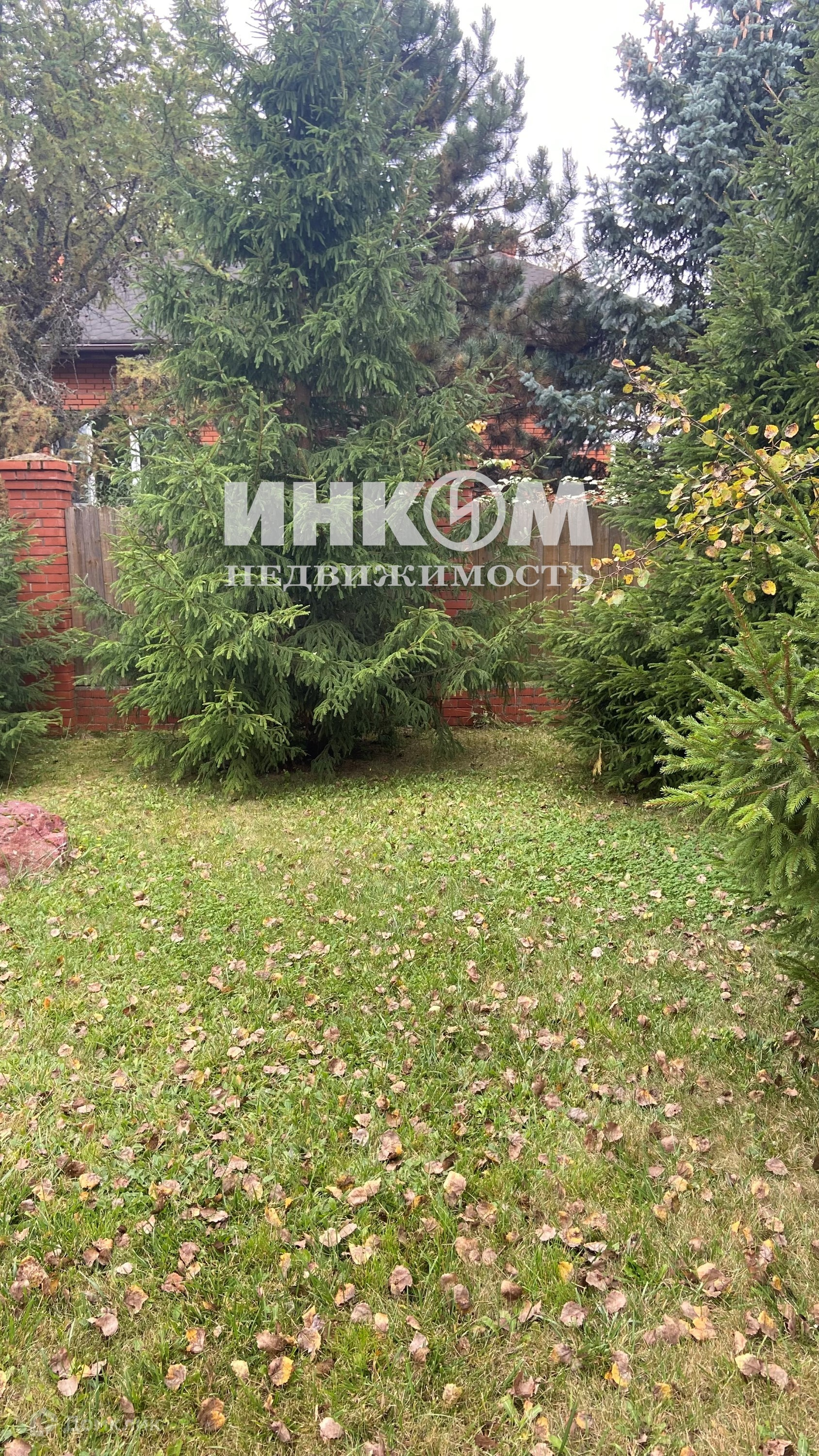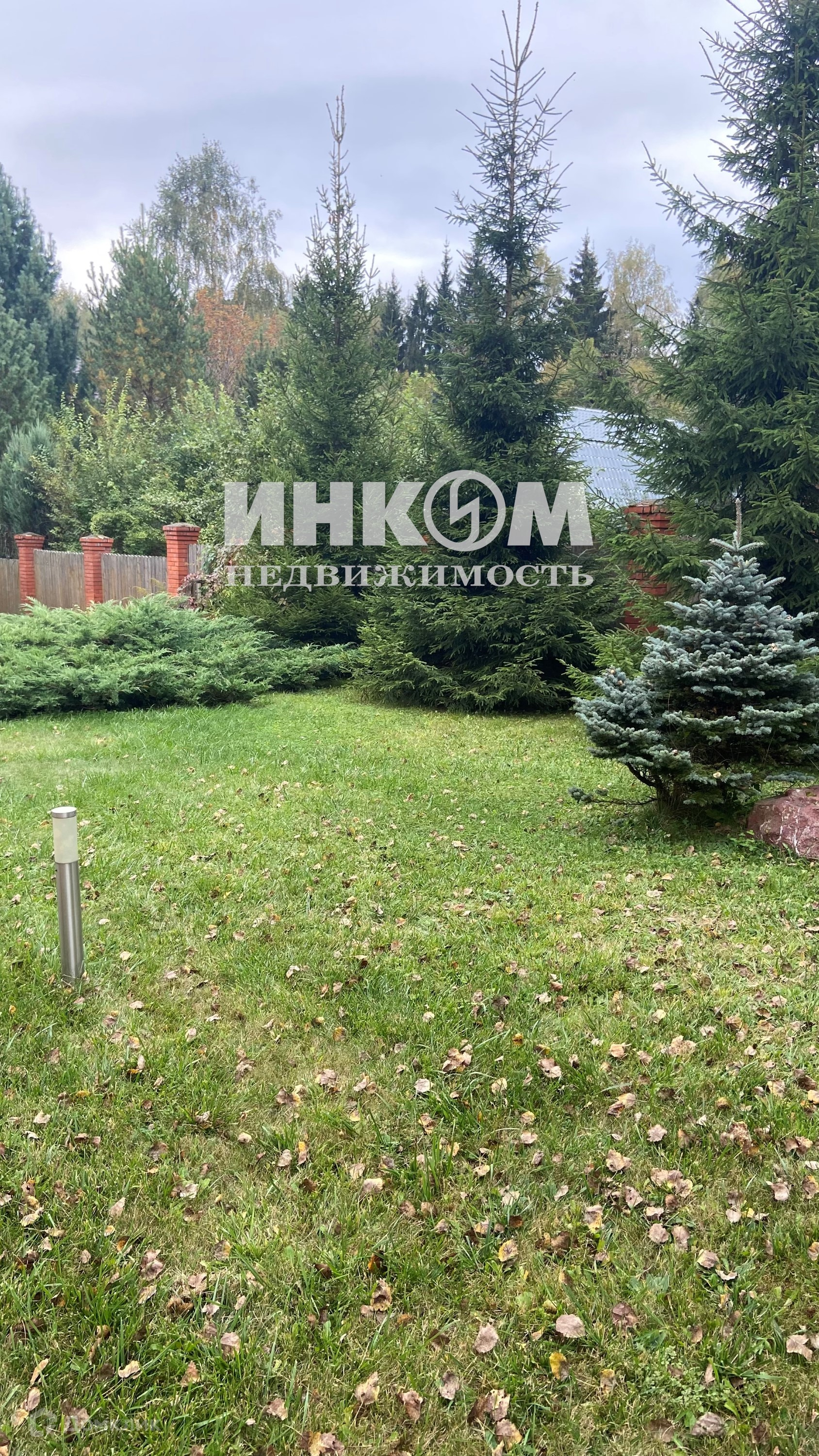 Участок с ландшафтным дизайном, ровный ухоженный, газон, дорожки, освещение, растут ели.