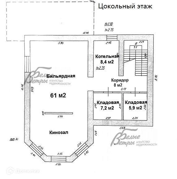 Цокольный этаж: бильярдная с кинозалом 61 кв.м, котельная 8.4 кв.м, кладовая 6 кв.м, кладовая 7 кв.м, коридор 8 кв.м.