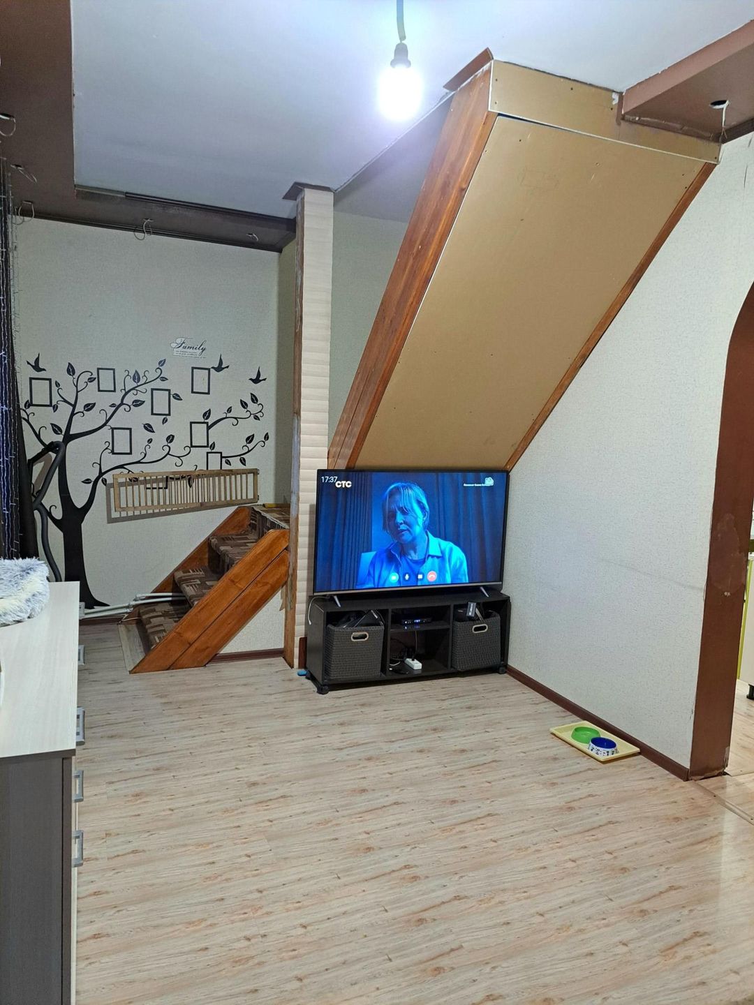 На первом этаже кухня, совмещённый с/у, тех. комната, гостиная.