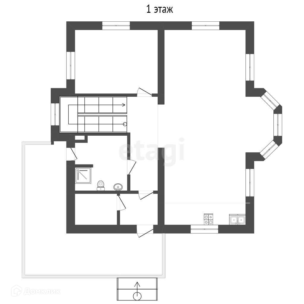На первом этаже: гардеробная, сан.узел, кухня-гостиная 68 кв.м( при желании можно разделить), гостевая комната, высота потолка 3м. выход в гараж через дом.