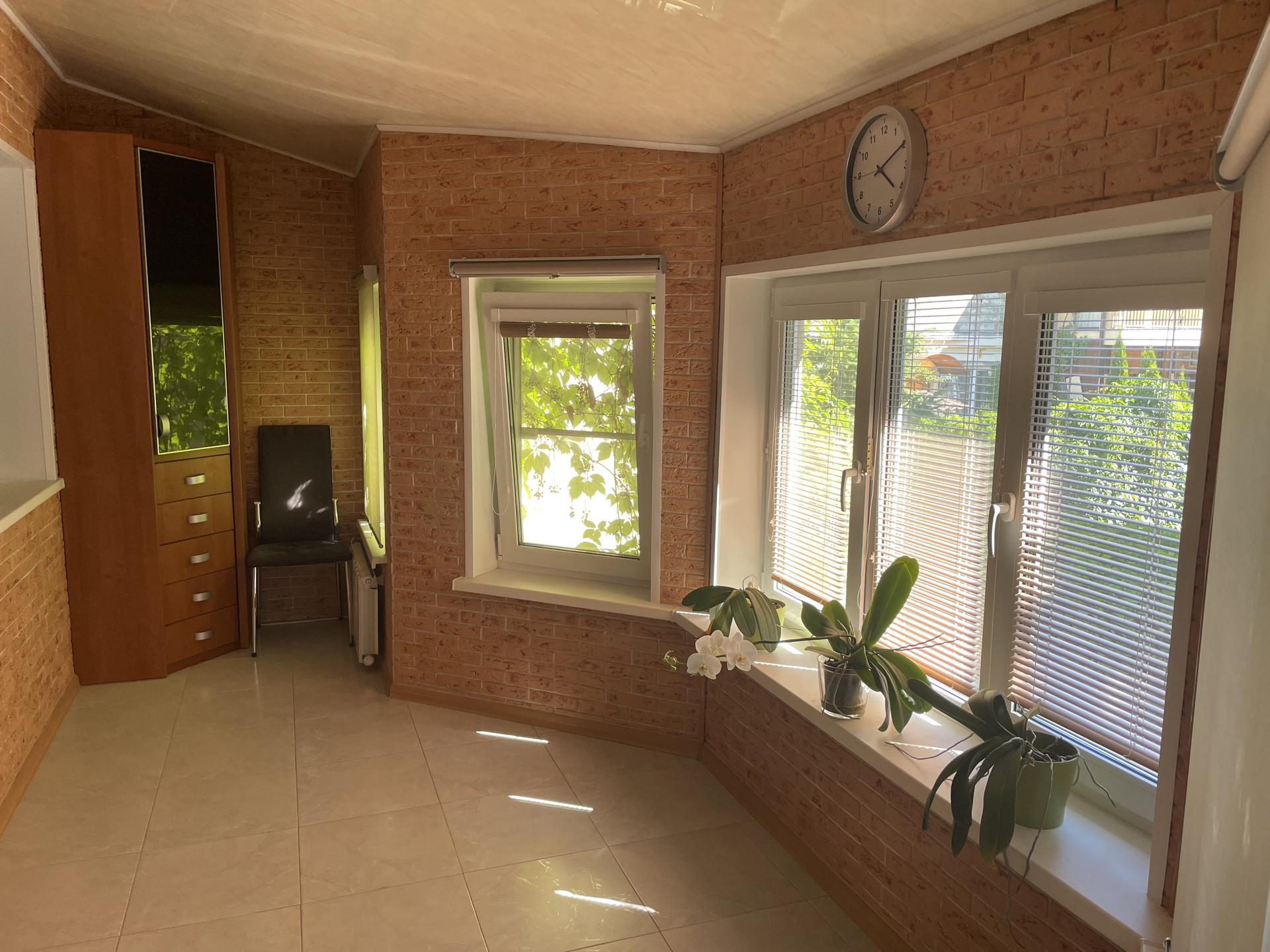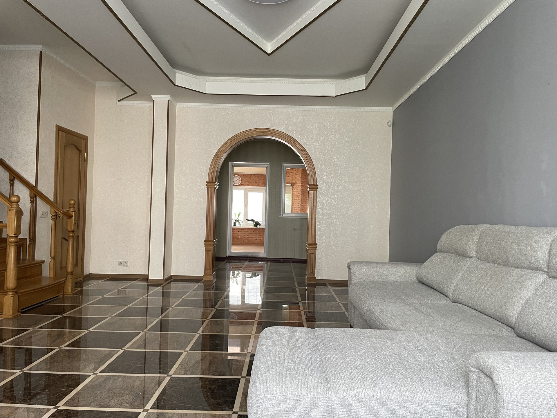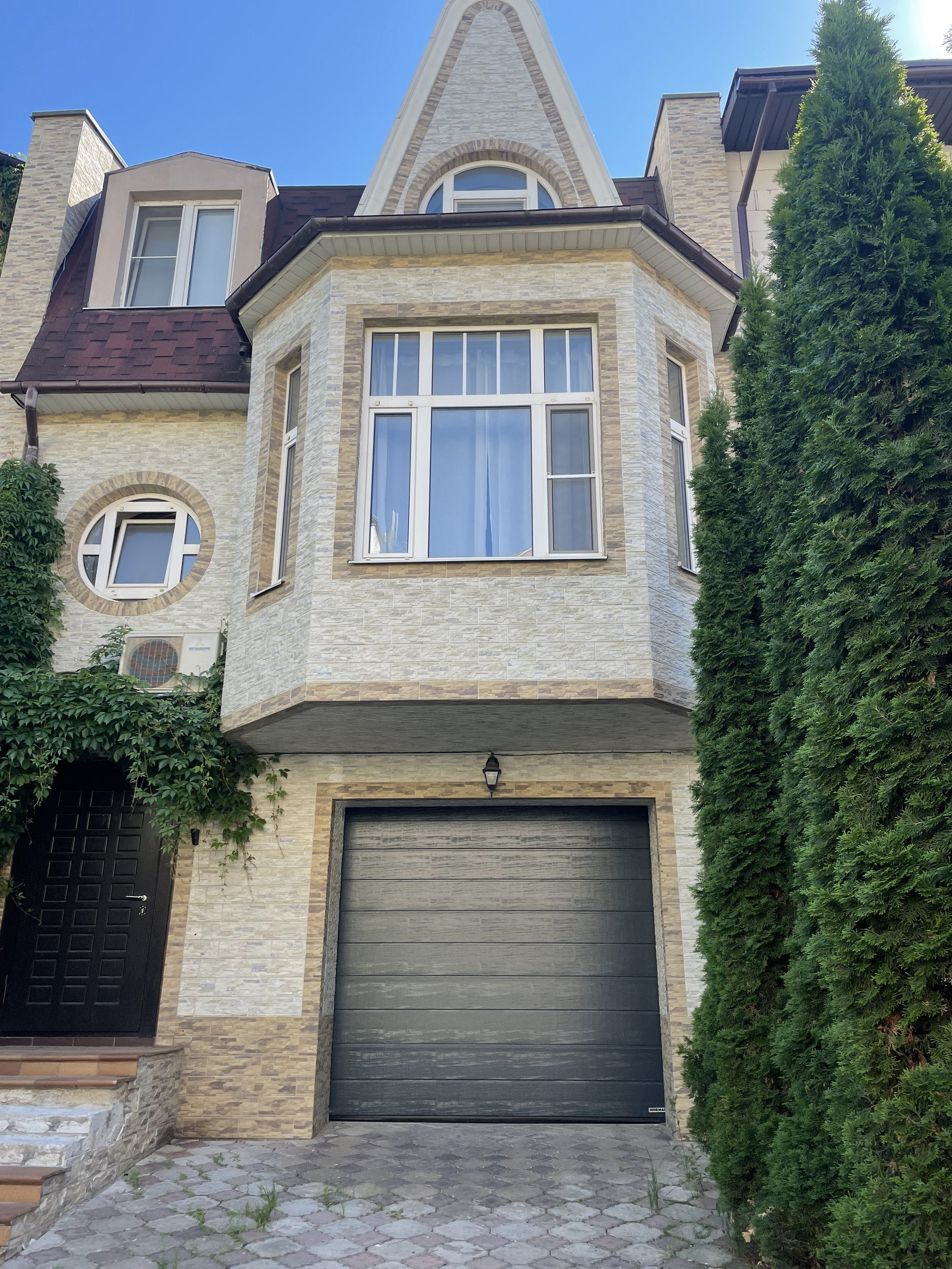 Планировка: Первый этаж: прихожая, просторный холл с гардеробом, комната свободного назначения с выходом на задний дворик с зоной барбекю и беседкой, котельная, гараж на 1 м/м. Второй этаж:  большая гостиная, кухня-столовая с выходом на застекленную веранду и зону отдыха, ванная комната.  Третий этаж: холл, 2 спальни, гардеробная, ванная комната. Перед домом парковка для автомобилей.