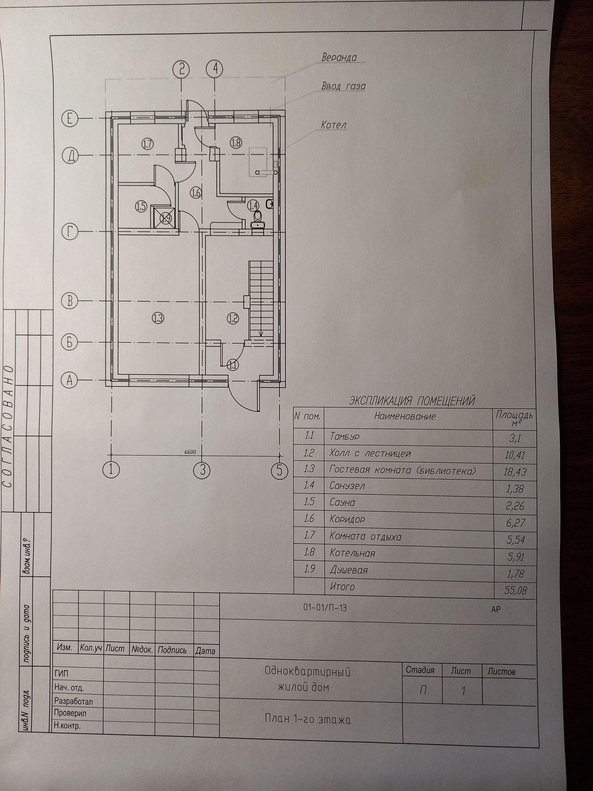 1-ый этаж: 55,8 м. кв., тамбур, холл с лестницей, гостевая комната, санузел, сауна, коридор, котельная, душевая.
