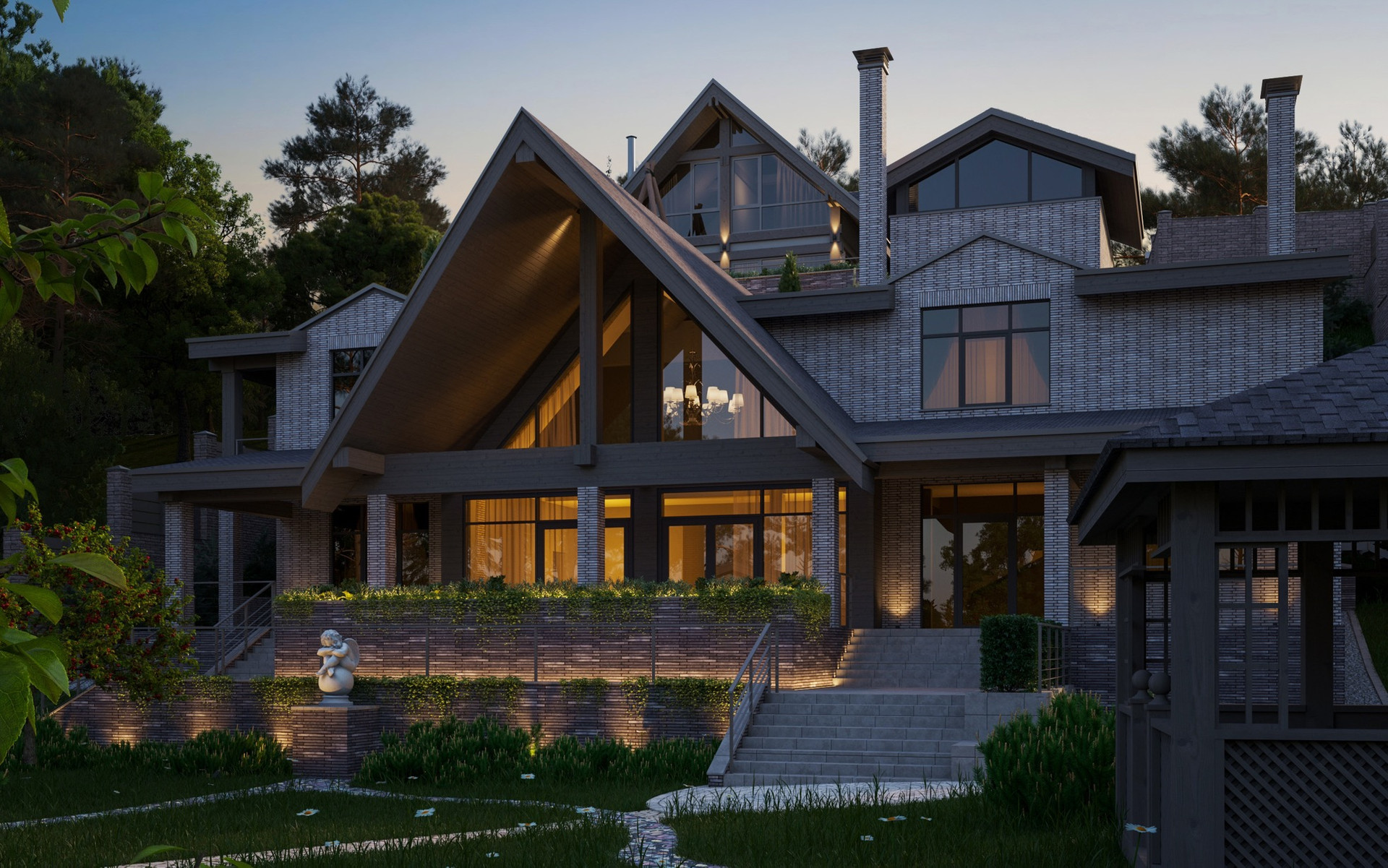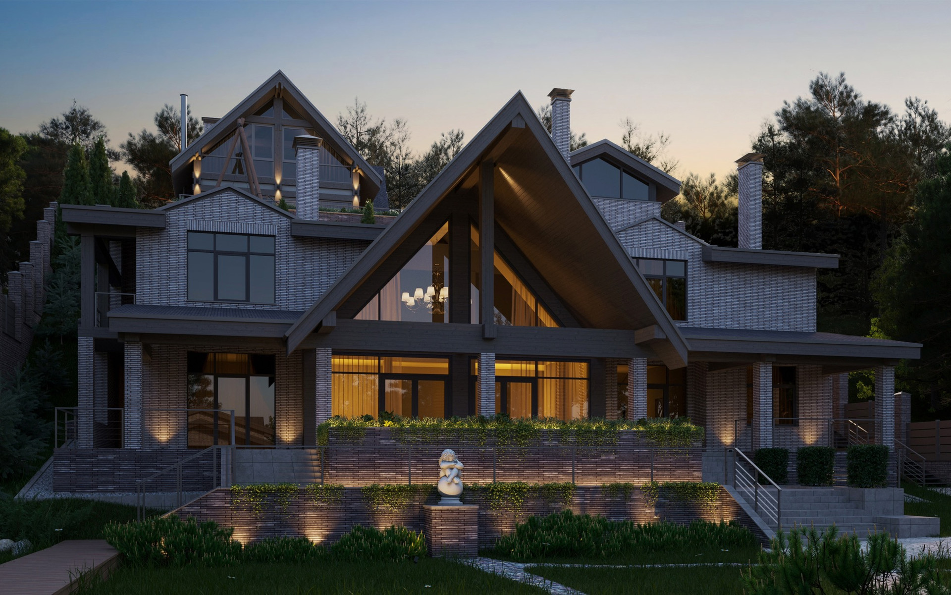 Готов проект от архитектурного бюро A+A в 2022 году на постройку дома с гаражом, гостевым домом и баней. Гостевой дом с баней и купелью располагаются на верхнем участке, где открывается живописный вид ( как в Красной Поляне)