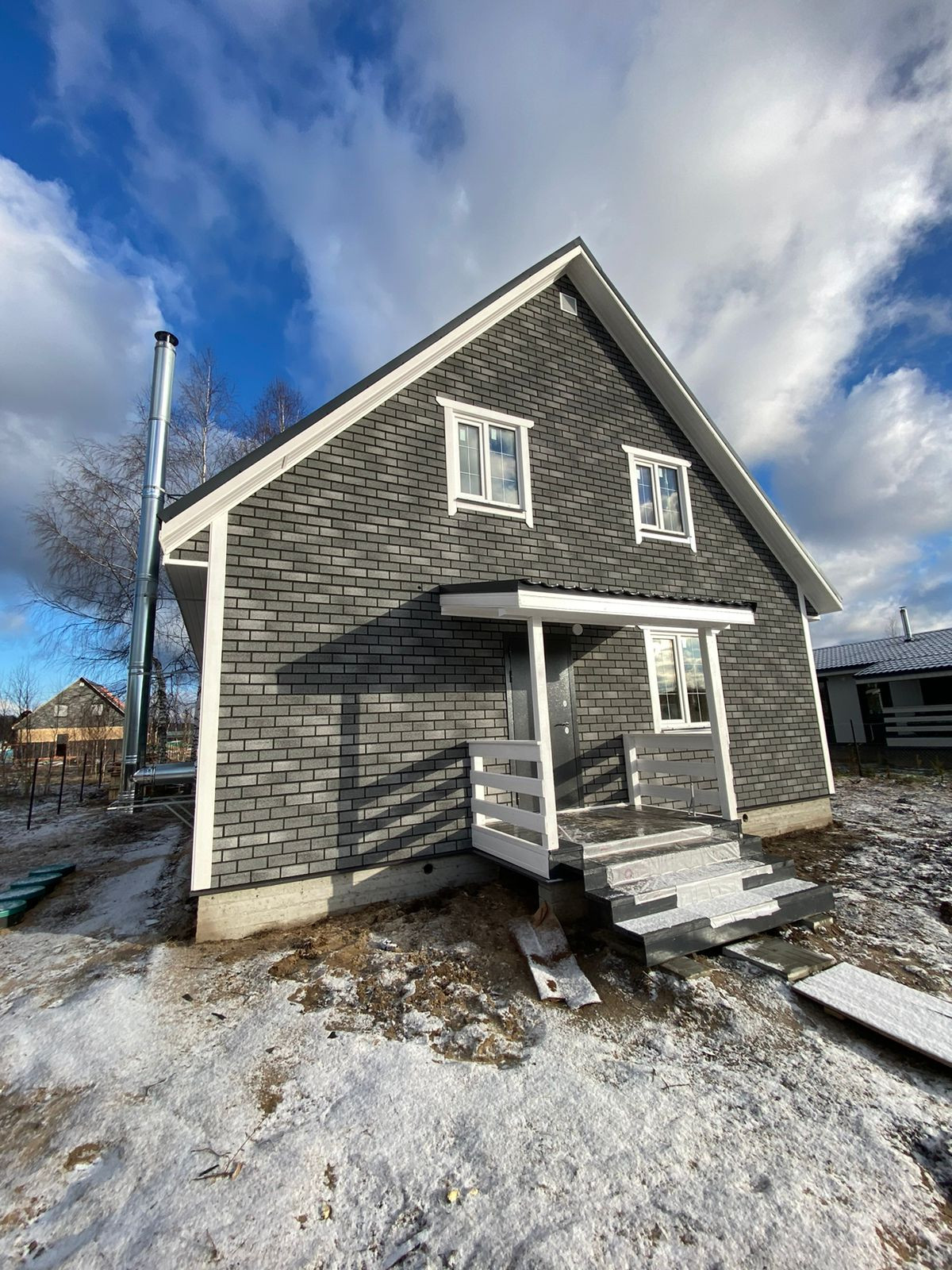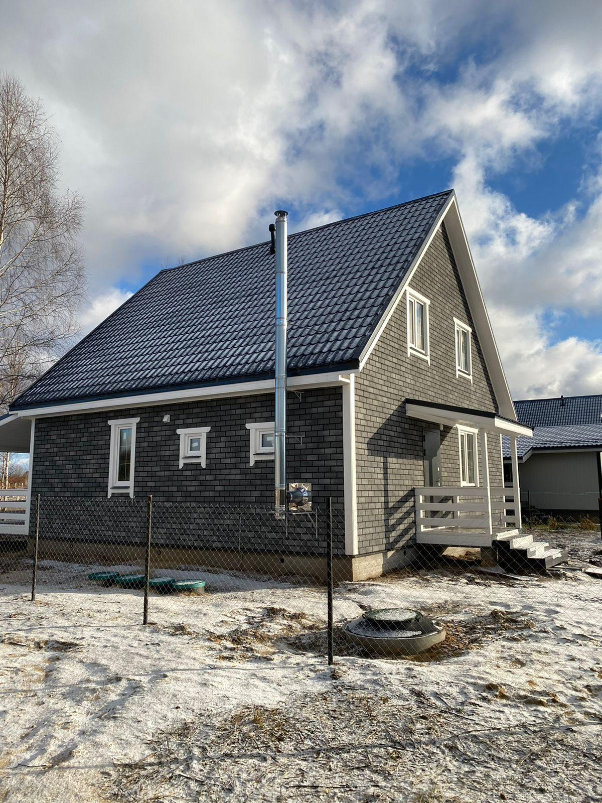 Дом площадью 156 кв. м на участке 6 соток. На 1 этаже - терраса площадью 27 кв. м, кухня - 16 кв. м, гостиная - 18 кв. м и комната - 18 кв. м, а также санузел, техническое помещение, холл и тамбур. На 2 этаже гостиная - 10 кв. м, три комнаты площадью 11 кв. м, 12 кв. м и 16 кв. м и санузел. Дом в готовности под ключ. Есть все необходимое для постоянного проживания круглый год.