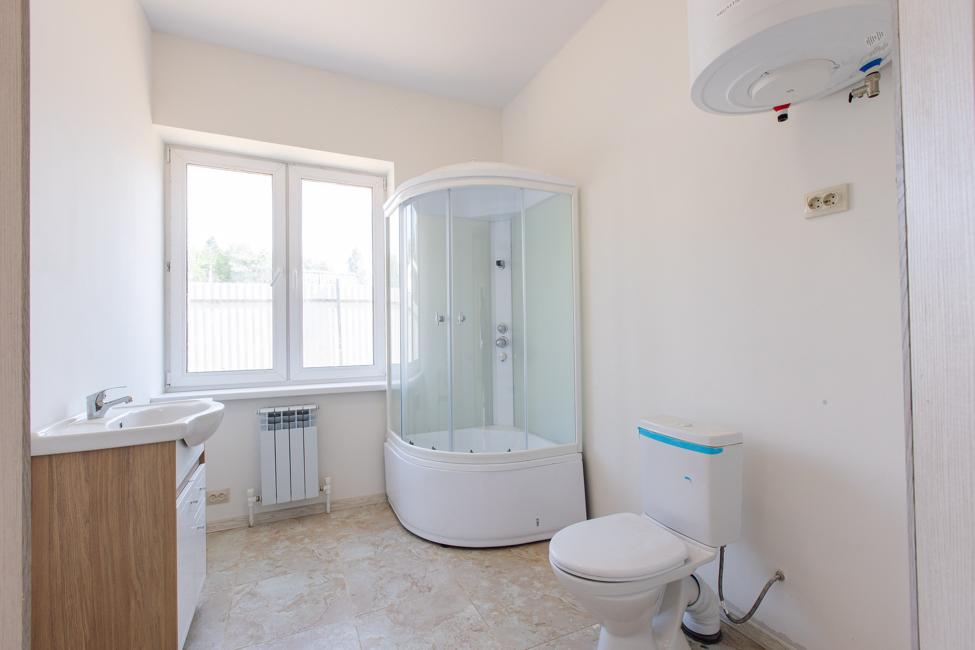 КОММУНИКАЦИИ: водоснабжение из собственной скважины (120 м), канализация био-септик (бак со спец. водорослями, который НЕ требует откачки), электричество 15 кВт, отопление - ВОДЯНОЕ ОТ ЭЛЕКТРОКОТЛА, Горячая вода - от КОСВЕННОГО нагревателя большого объема, теплые ВОДЯНЫЕ полы.