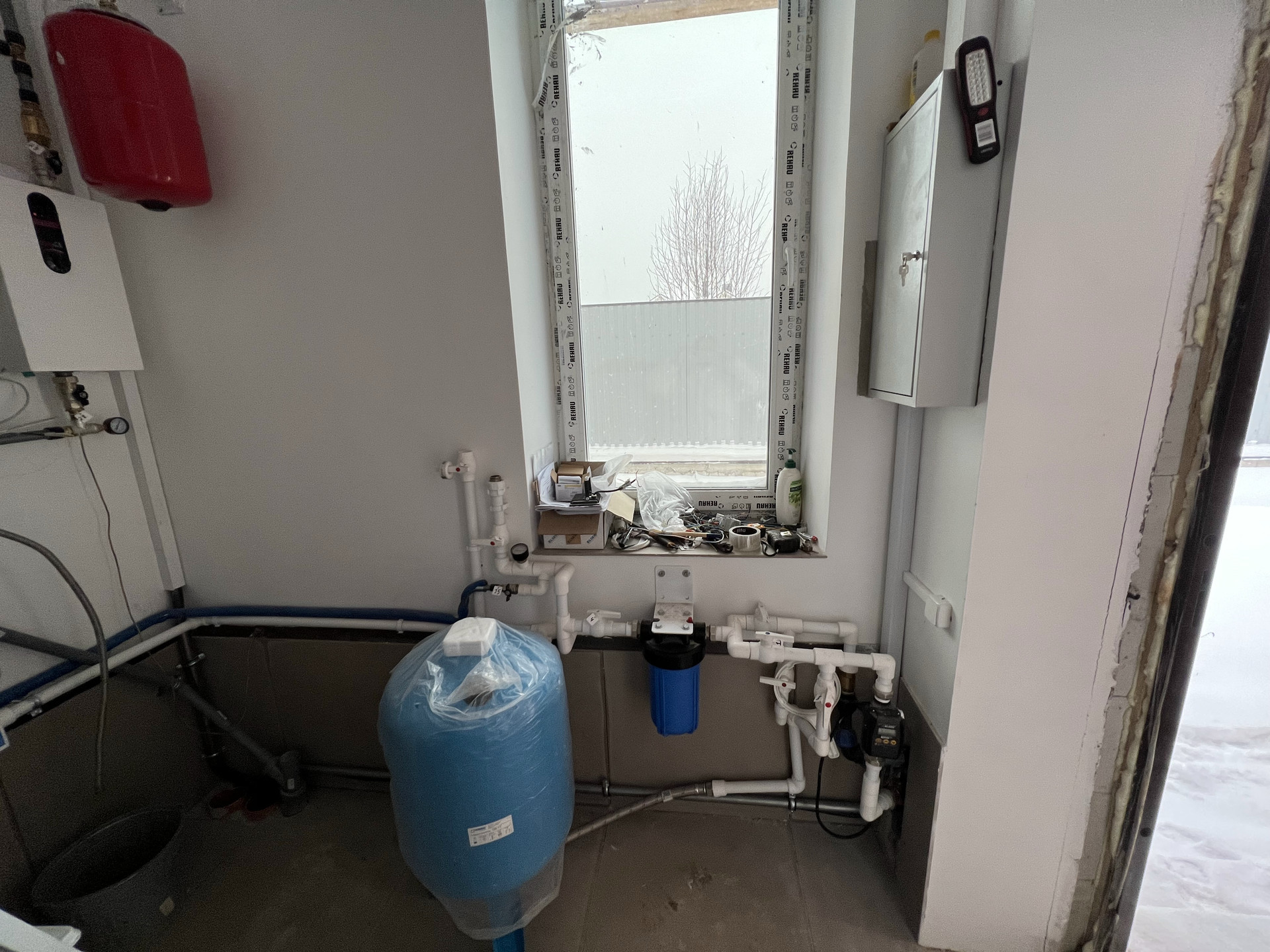 ВОДА. Два ввода воды. 1) Пробурена скважина 72 метра (артезианская). 2) центральная вода из поселка. Для очистки воды предусмотрено специальное место в бойлерной.