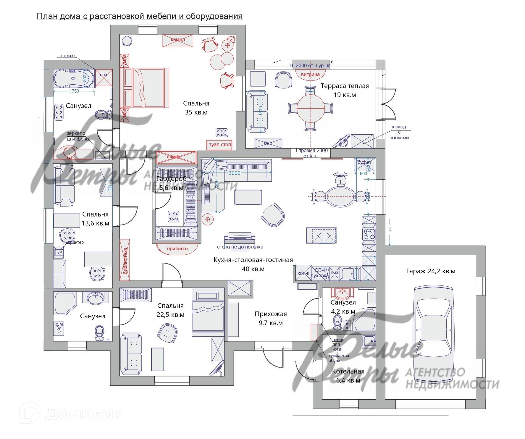1-ый этаж: прихожая 9,7 кв.м, санузел гостевой 4,2 кв.м, котельная 6.4 кв.м, гараж 24.2 кв. м, кухня-столовая-гостиная 40 кв.м, терраса застекленная теплая 19 кв.м, спальня с санузлом 22,5 кв.м, спальня 13,6 кв.м, гардеробная 5,6 кв.м, спальня 35 кв.м с санузлом..
