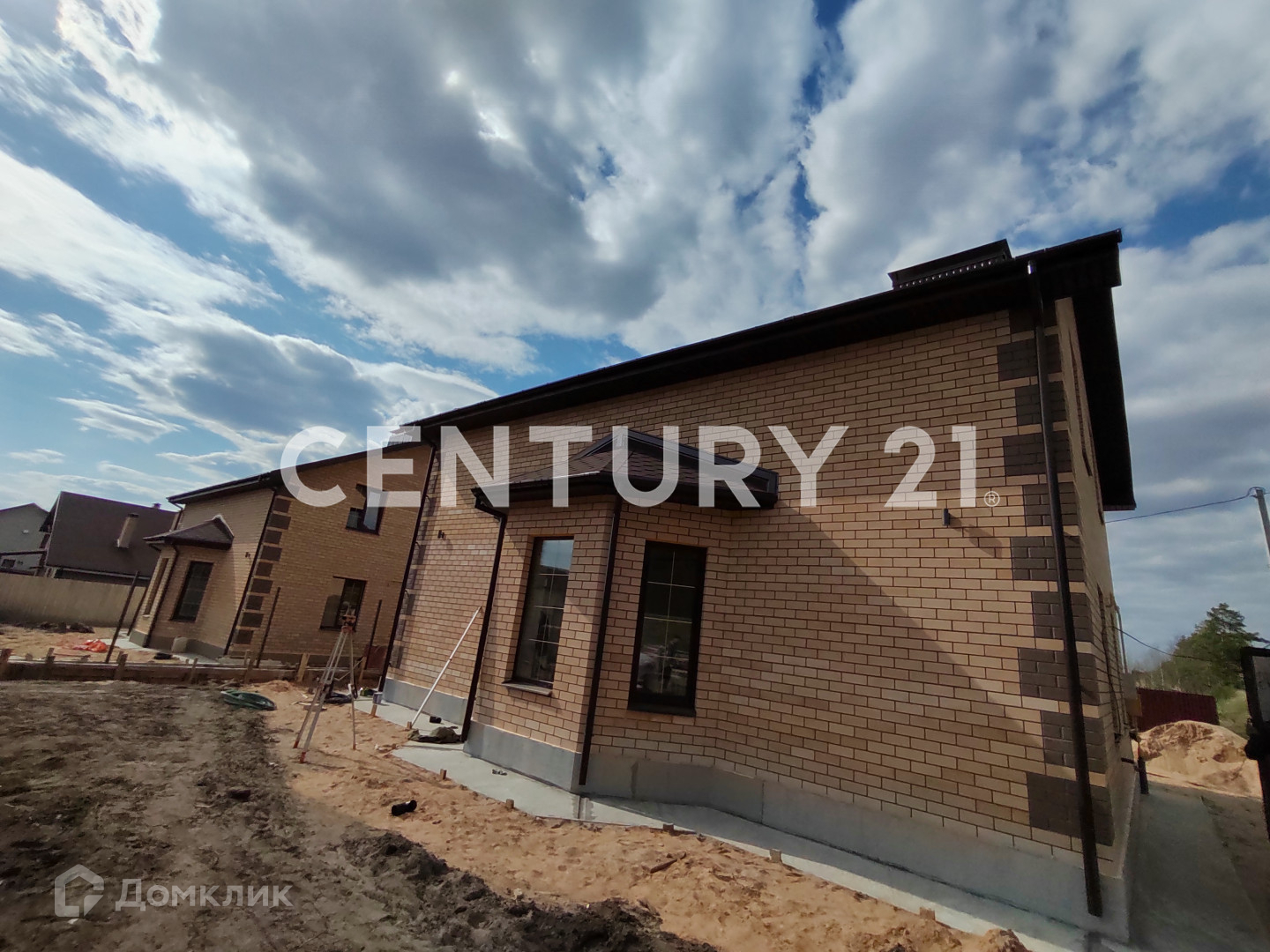 Стены дома - газосиликат, облицовка - керамический кирпич (Баварская кладка). Вокруг дома отмостка.