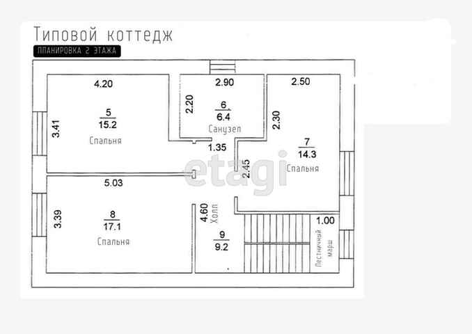 - На втором этаже расположены, холл – 9.2м2, комната- 15.2м2, комната – 14.3м2, комната – 17.1м2, ванная комната – 6.4м2