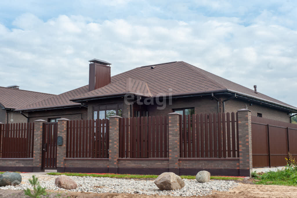 Одноэтажный дом - имеет общую площадь – 160м2. Современная и продуманная планировка дома: прихожая – 21.4м2, сан-узел-3,3м2, котельная-5.5м2, большая вместительная кухня - гостиная – 46.8м2., комната – 13.4м2. и две комнаты – по 16.3м2, еще один сан-узел – 7.13м2, кладовка – 4.13м2, стеклянная терраса – 20.8м2 – теплый пол, с выходом на задний двор, входная застекленная зона – 4м2.