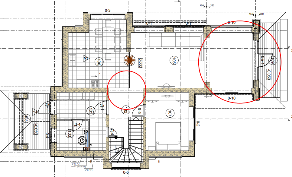 На первом этаже располагаются просторный тамбур, кухня, гостиная с обеденной зоной и выходом на участок, спальня, также есть техническое помещение и санузел.