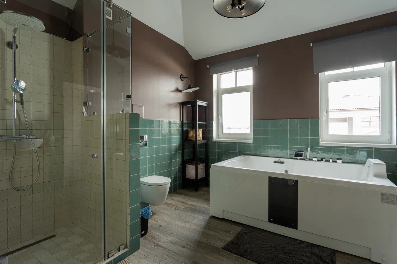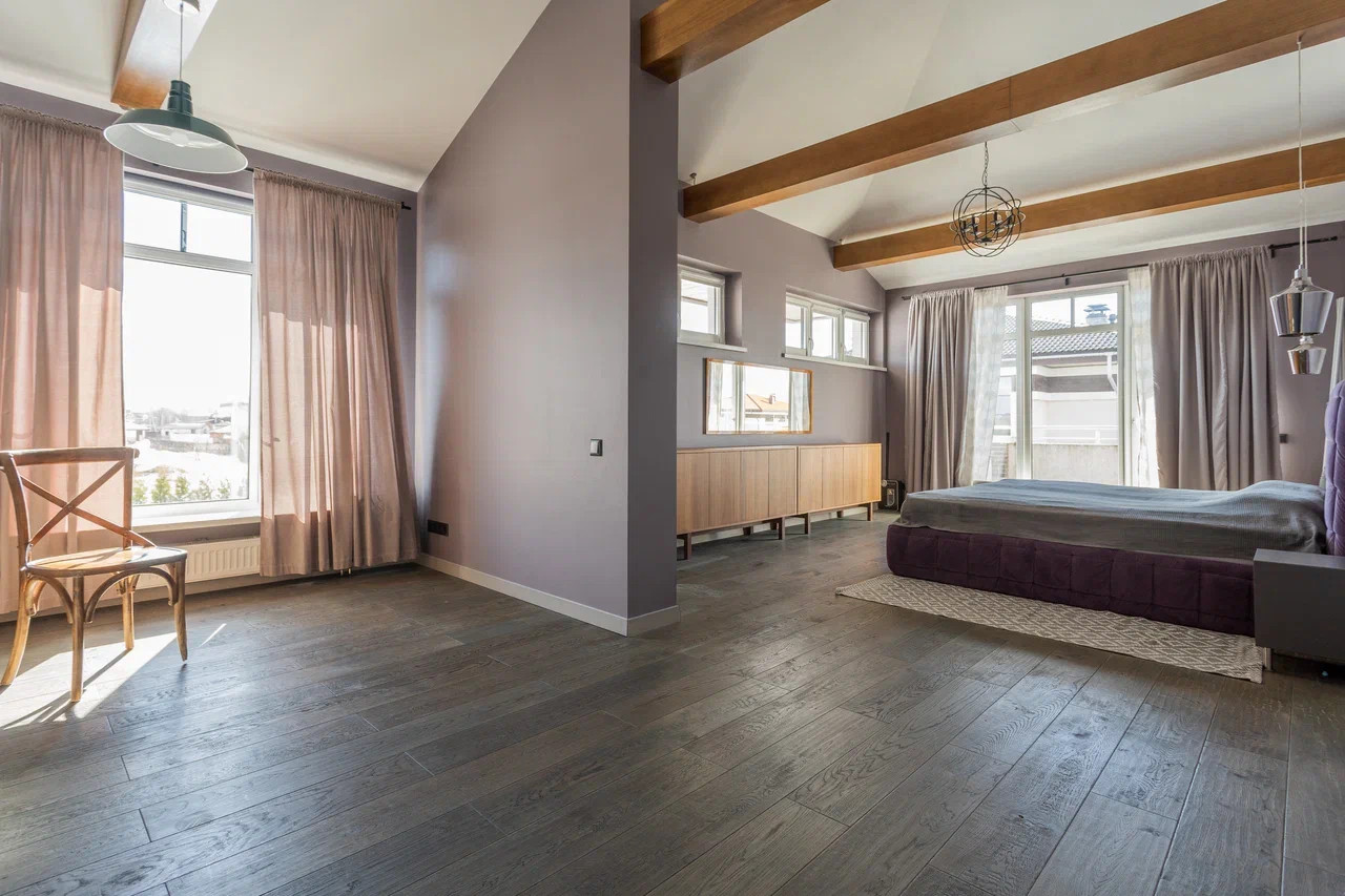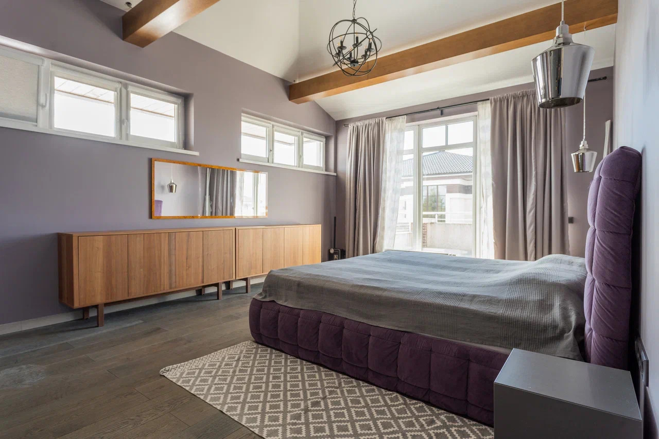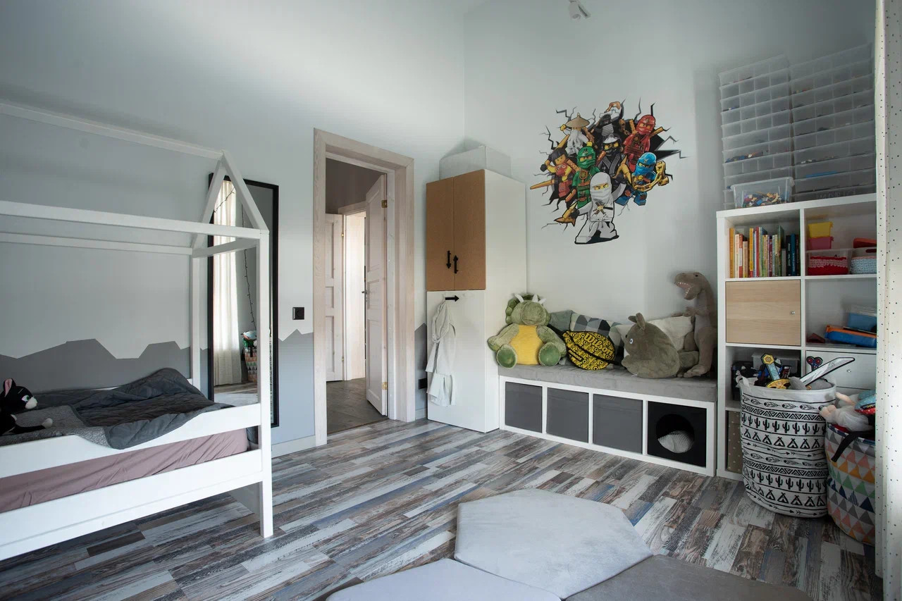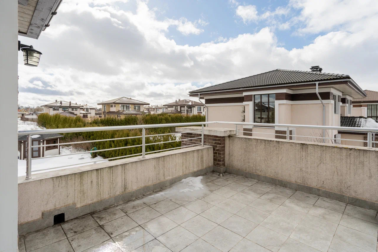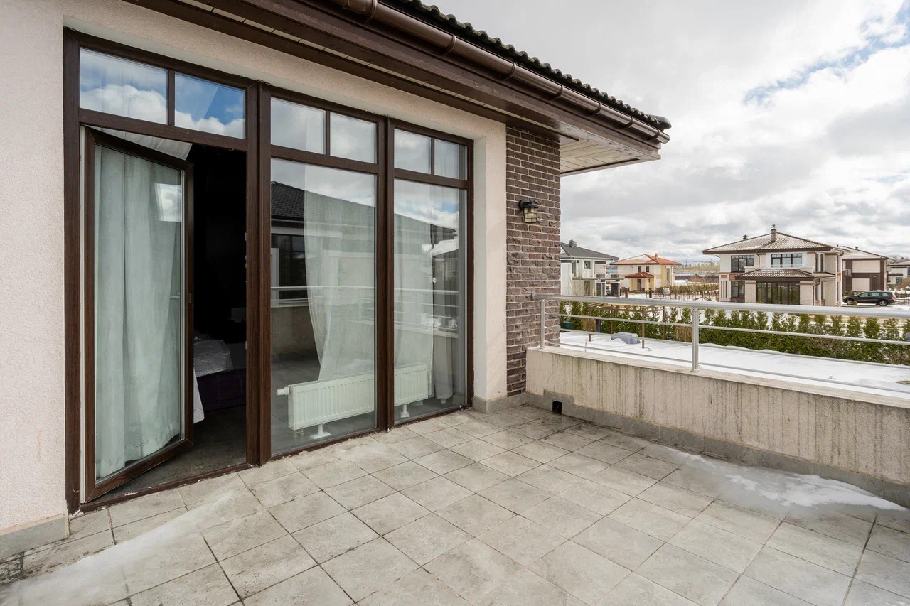 На втором этаже: детская комната и спальня с отгороженной гардеробной зоной, совмещенный санузел с ванной и душевой кабиной. Из спальной комнаты есть выход на балкон-террасу.