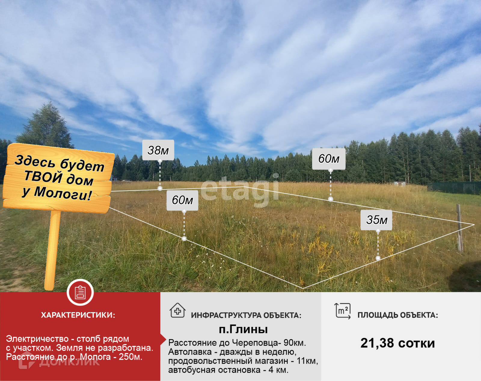 В живописном месте, в 200м от р. Молога продается участок площадью 21,38 соток. Месторасположение участков в п.Глины отличается уединением и природной красотой благодаря близости лесного массива и реки. Здесь одинаково понравится и любителям рыбалки и охотникам. СНТ Молога - это сообщество единомышленников. На территории есть своя волейбольная площадка, общественный пляж, даже часовня! Вы приобретаете не только участок в шикарном месте, но и приятных, уважительных и ответственных соседей, а это, согласитесь, бесценно! На отворотке в д.Староречье с трассы А-114 - остановка общественного транспорта, обеспечивающая удобное сообщение с центром города. Электрический столб находится возле участка. Земля не разработана. Постройки отсутствуют. Категория земель: сельскохозяйственного назначения, назначение: дачное строительство. Спешите приобрести этот замечательный перспективный объект загородной недвижимости! Компания ЭТАЖИ поможет с одобрением ипотеки на самых выгодных условиях. Мы работаем с лучшими, зарекомендовавшими себя застройщиками. Бесплатно подберем один из десятков проектов домов наших партнеров!