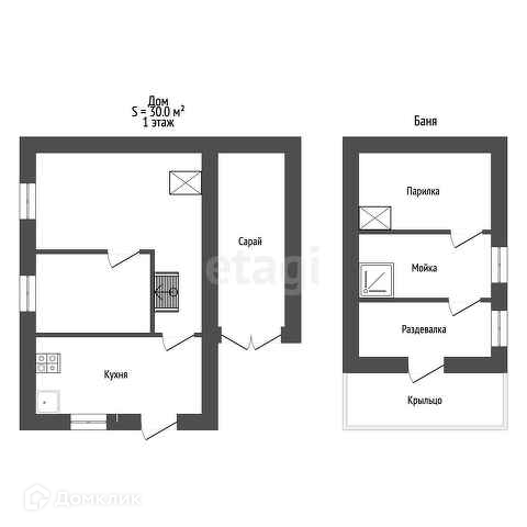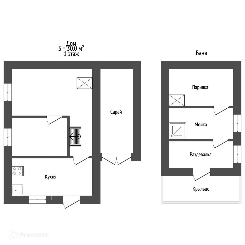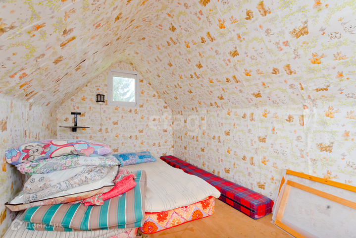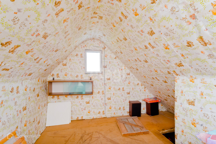 Дом построен по каркасной технологии, обшит сайдингом. На первом этаже располагается кухня, две комнаты. На мансарде располагается спальня.