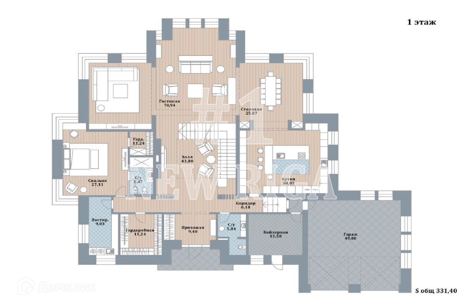 1 этаж - прихожая, гардеробная, кухня-столовая-гостиная со вторым светом, спальня с с/у и гардеробной, котельная, постирочная, с/у, гараж на 2 м/м,