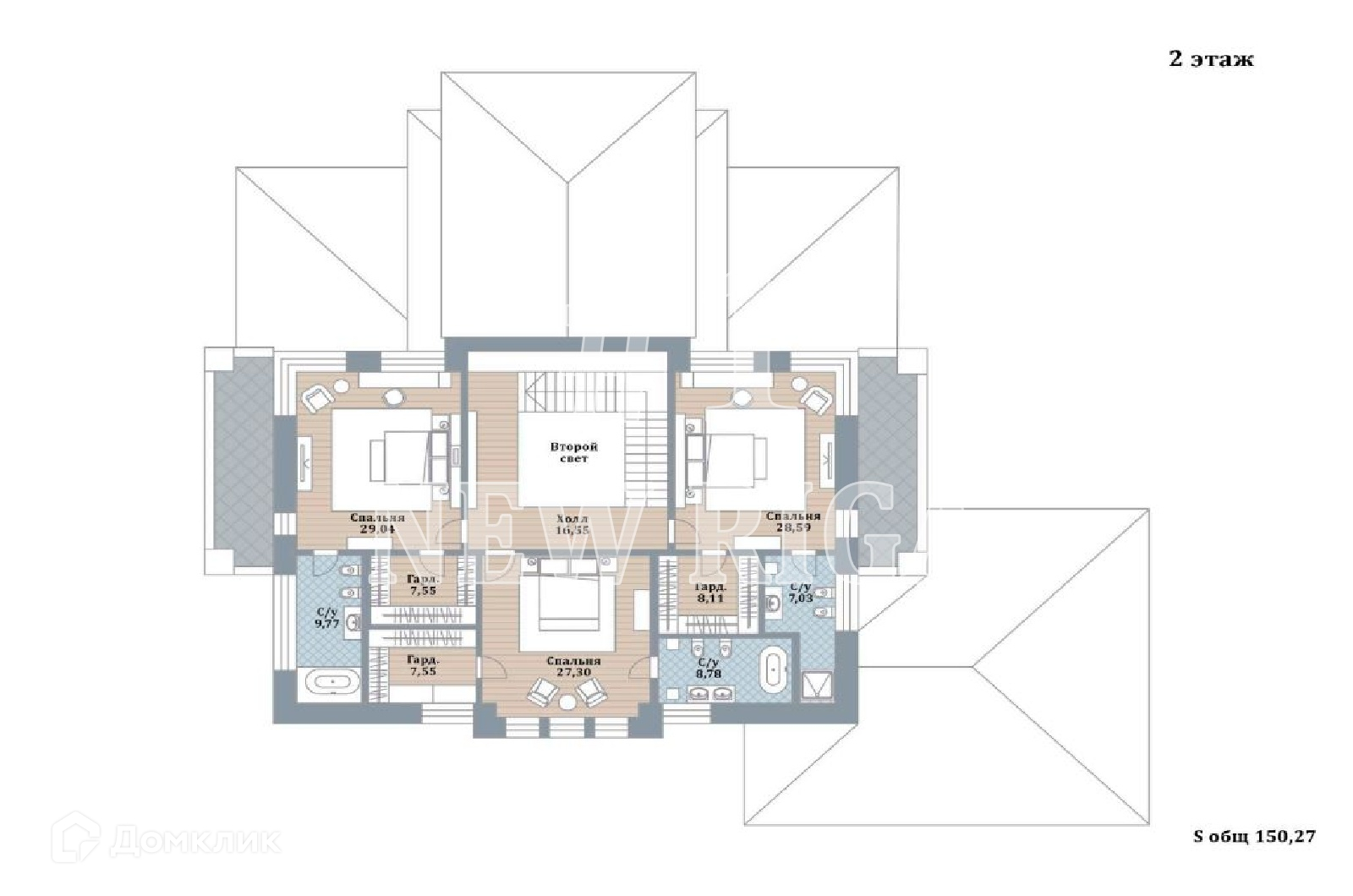 2 этаж - холл, 3 спальни с с/у и гардеробными и 2 балконами.