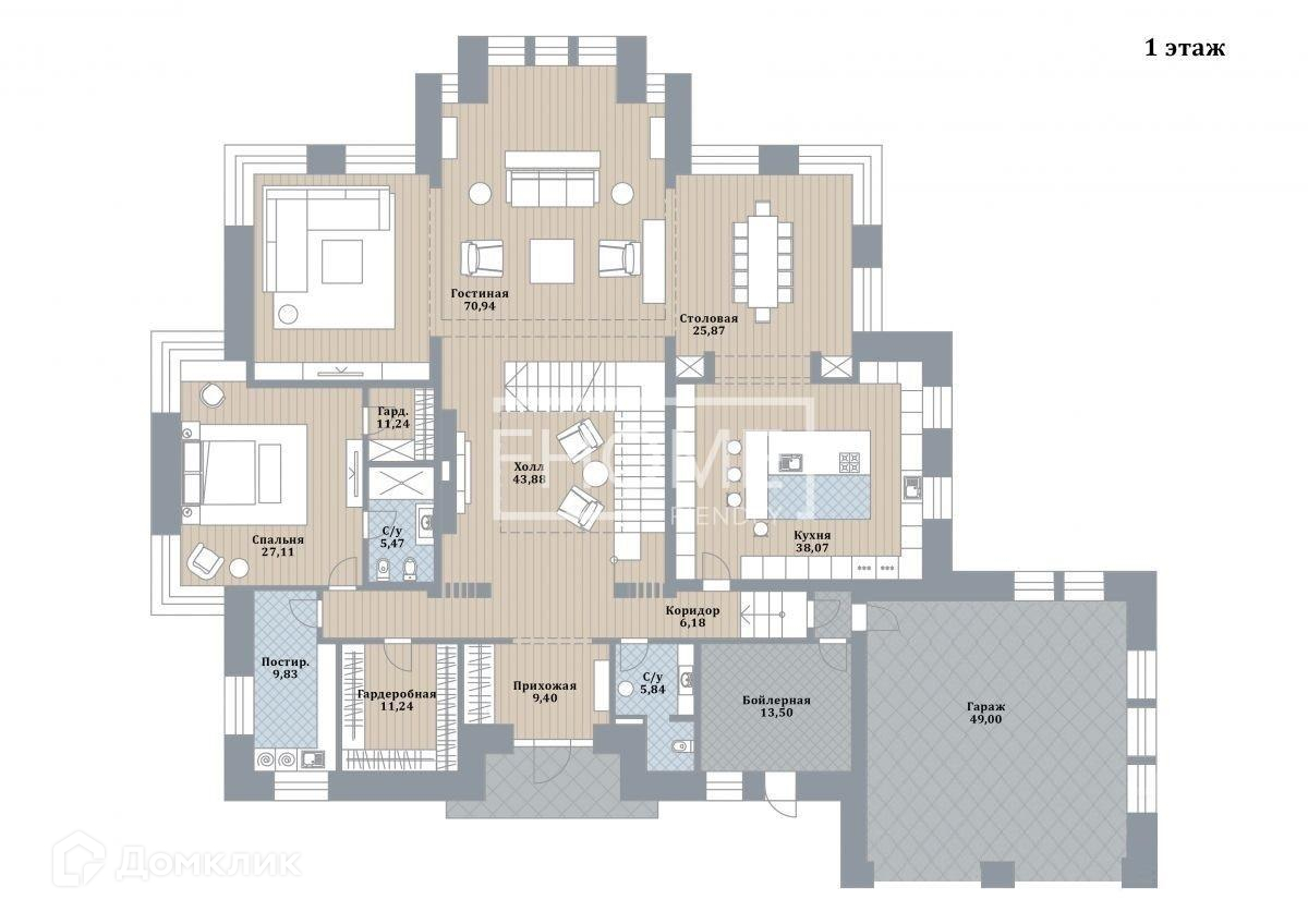 1 этаж. Просторная гостиная с камином, помещение свободного назначения (гостиная, кинозал), кухня с большой столовой и выходом на патио. На кухне техника NEFF. Гостевая спальня 27 м2 со своими гардеробной и санузлом. Холл, гостевой санузел, большая гардеробная, постирочная, котельная.