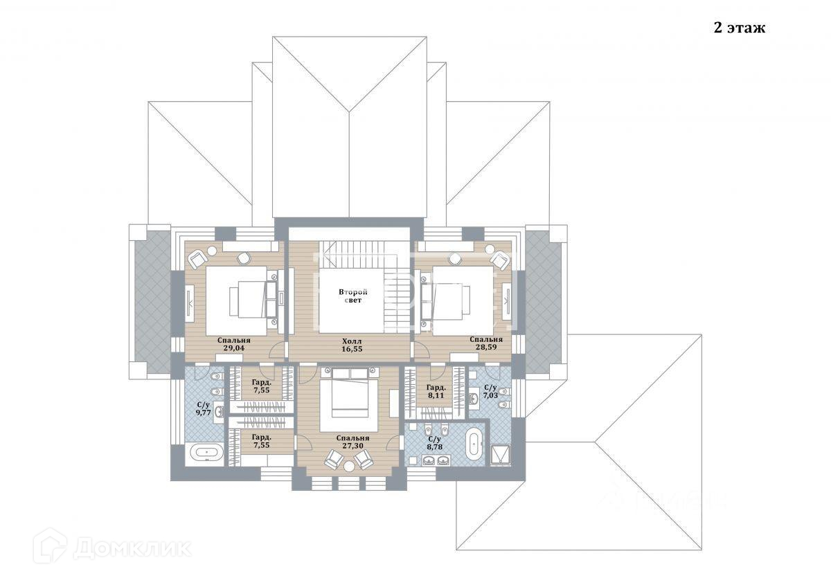 2 этаж. 3 спальни от 27 м2 со своими гардеробными и санузлами, 2 террасы.