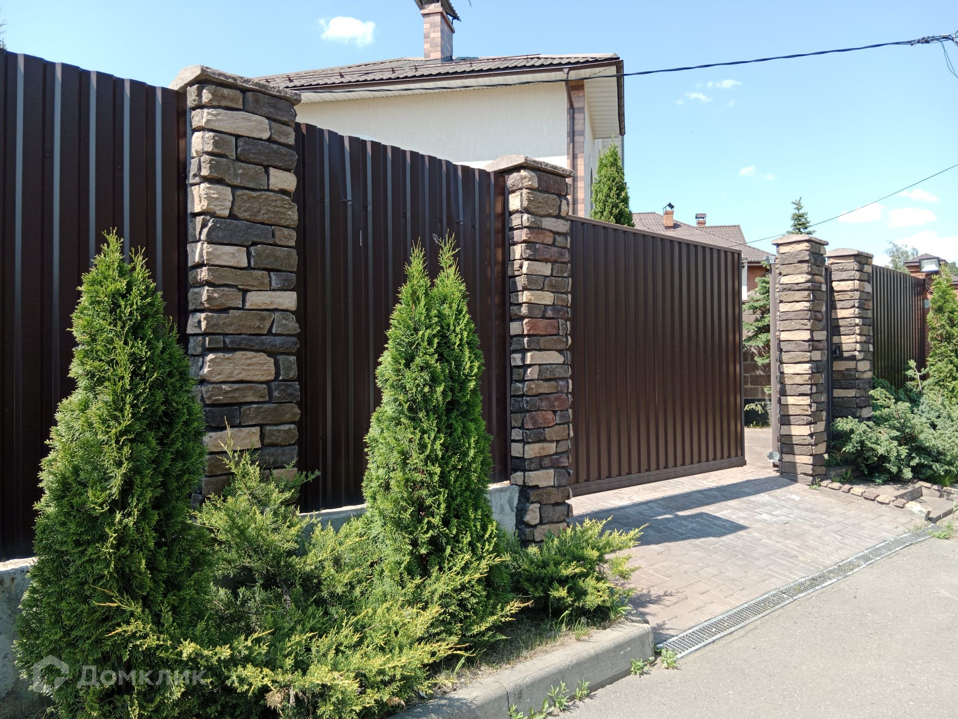 На улице ландшафтный дизайн, взрослые деревья, площадка на 4 машины, автоматические ворота.
