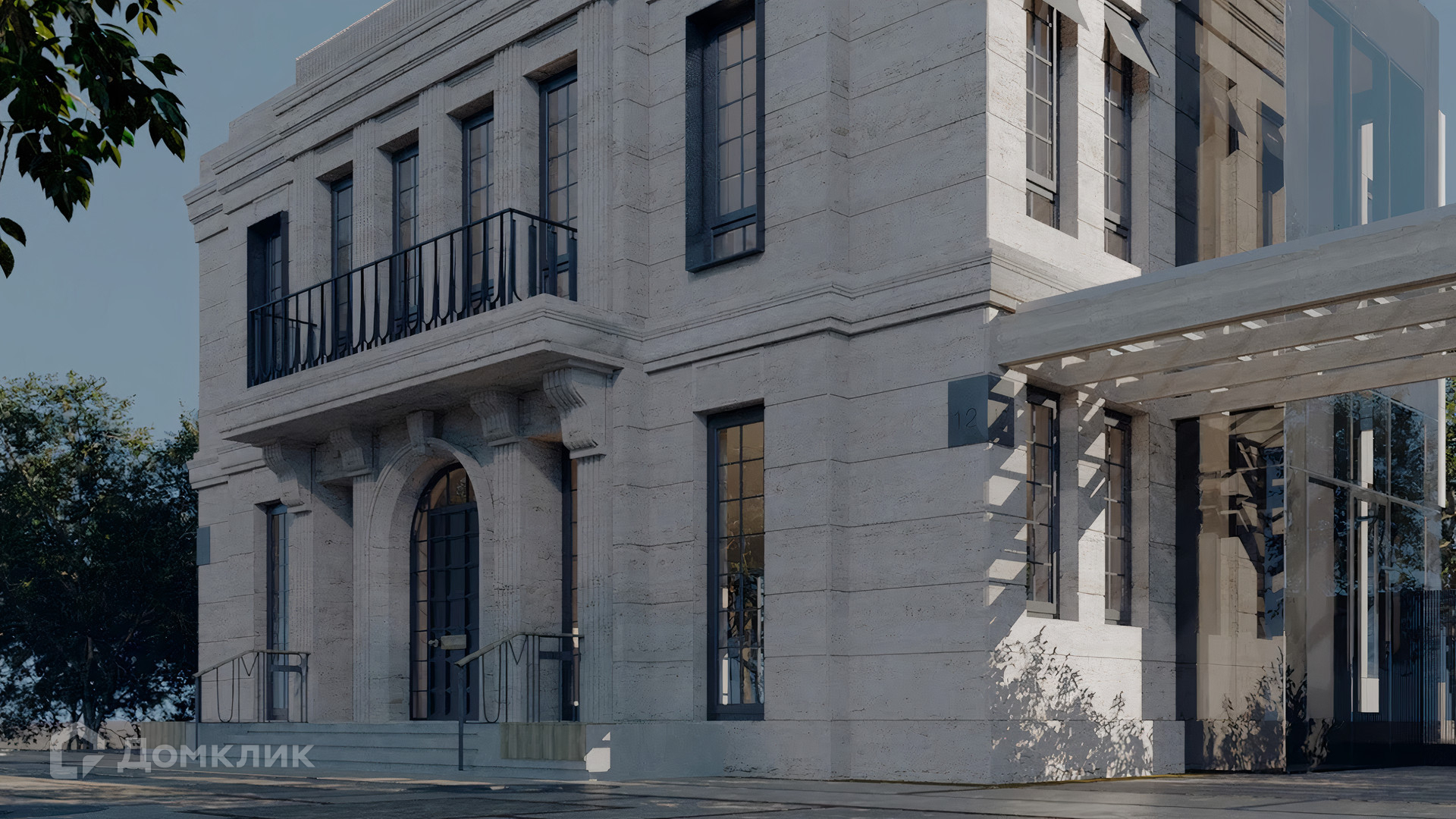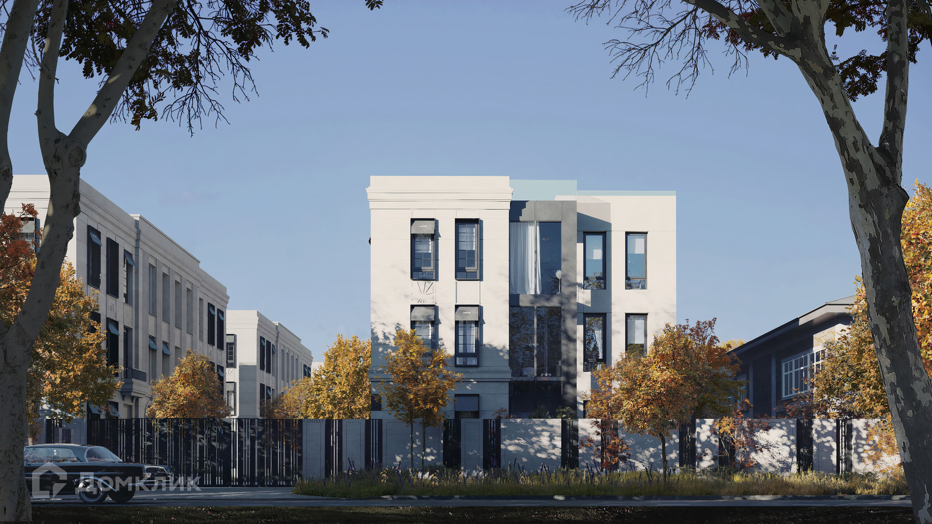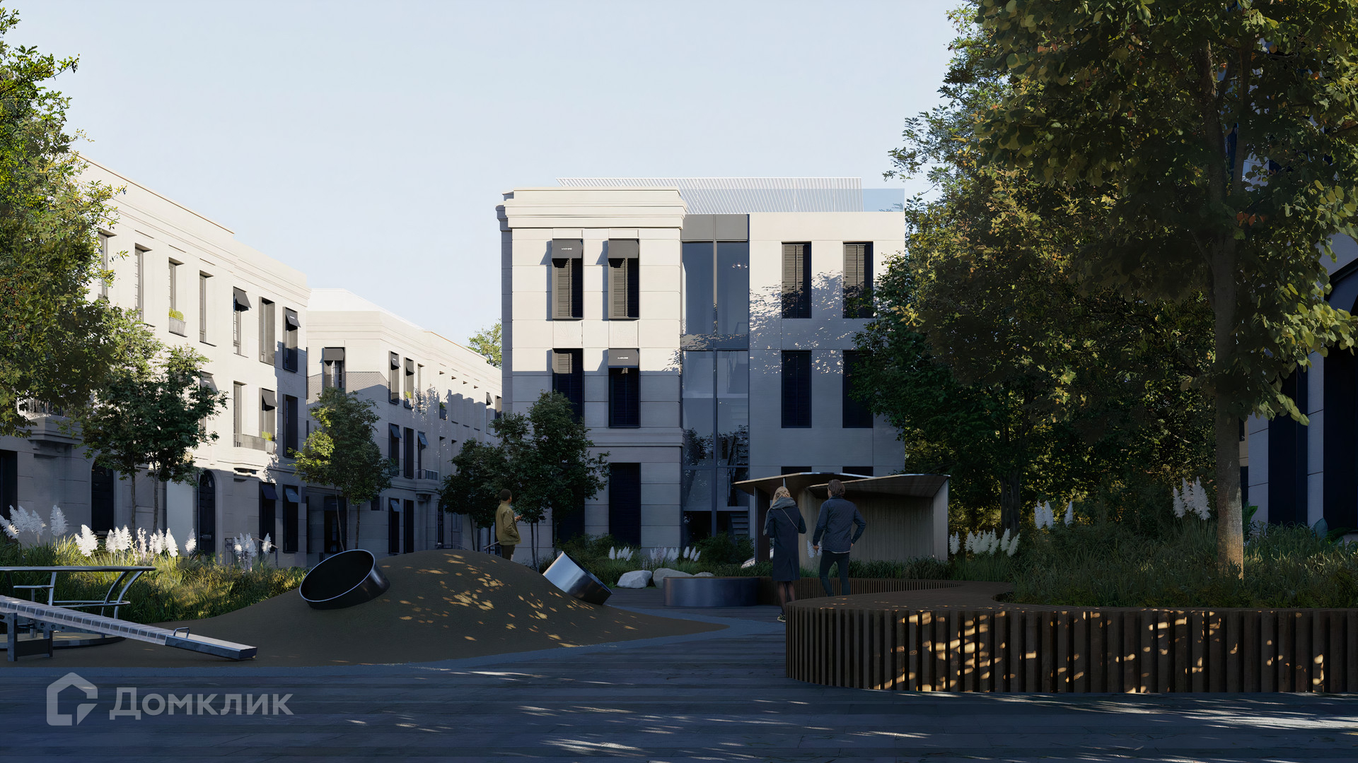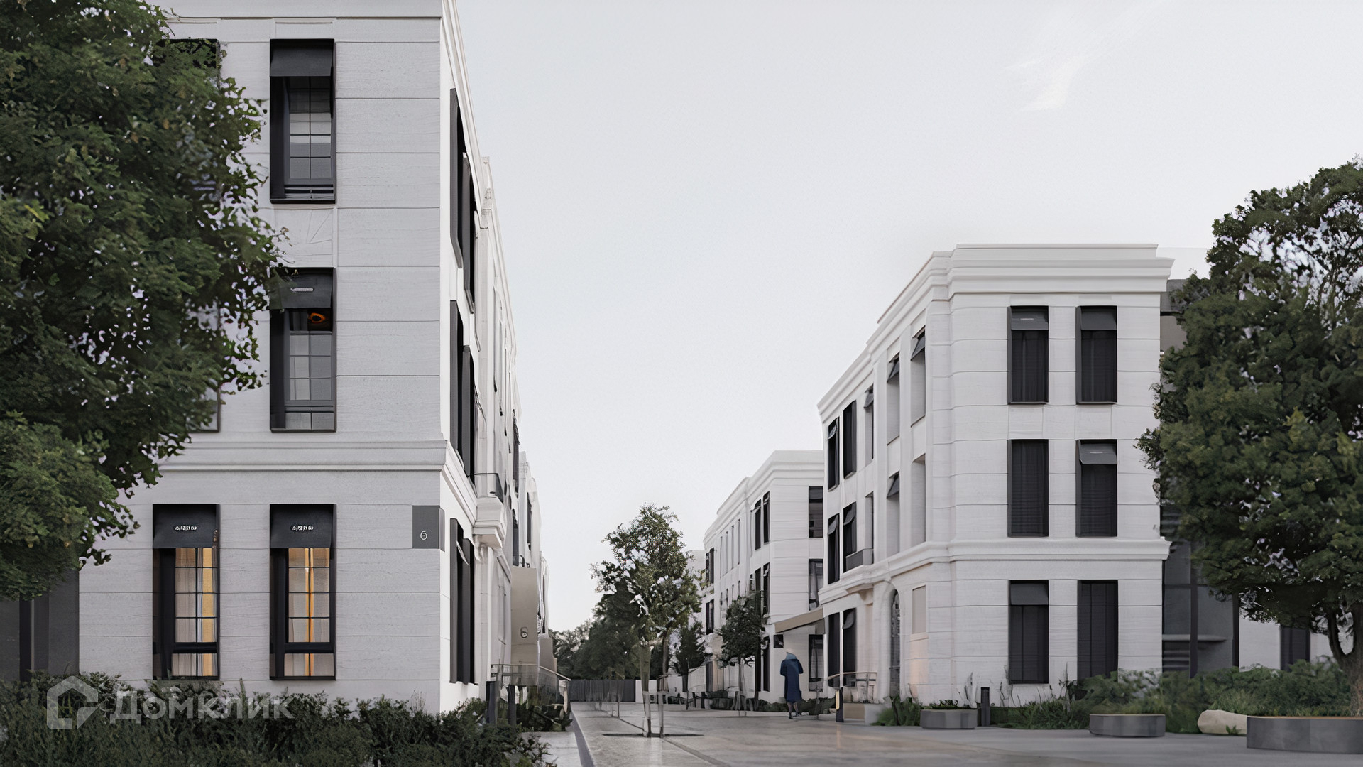ID 10 808. Lumiere. Таунхаус площадью 264 м² расположен на участке 2,5 сотки. Белый фасад в неоклассическом стиле облицован натуральным камнем — песчанником. Дом без отделки подходит для реализации индивидуального дизайн-проекта. Внутри разместили 4 спальни, кухню-столовую, гостиную, 2 кабинета, а на эксплуатируемой крыше оборудована крытая терраса. На участке с газоном можно обустроить зону барбекю.