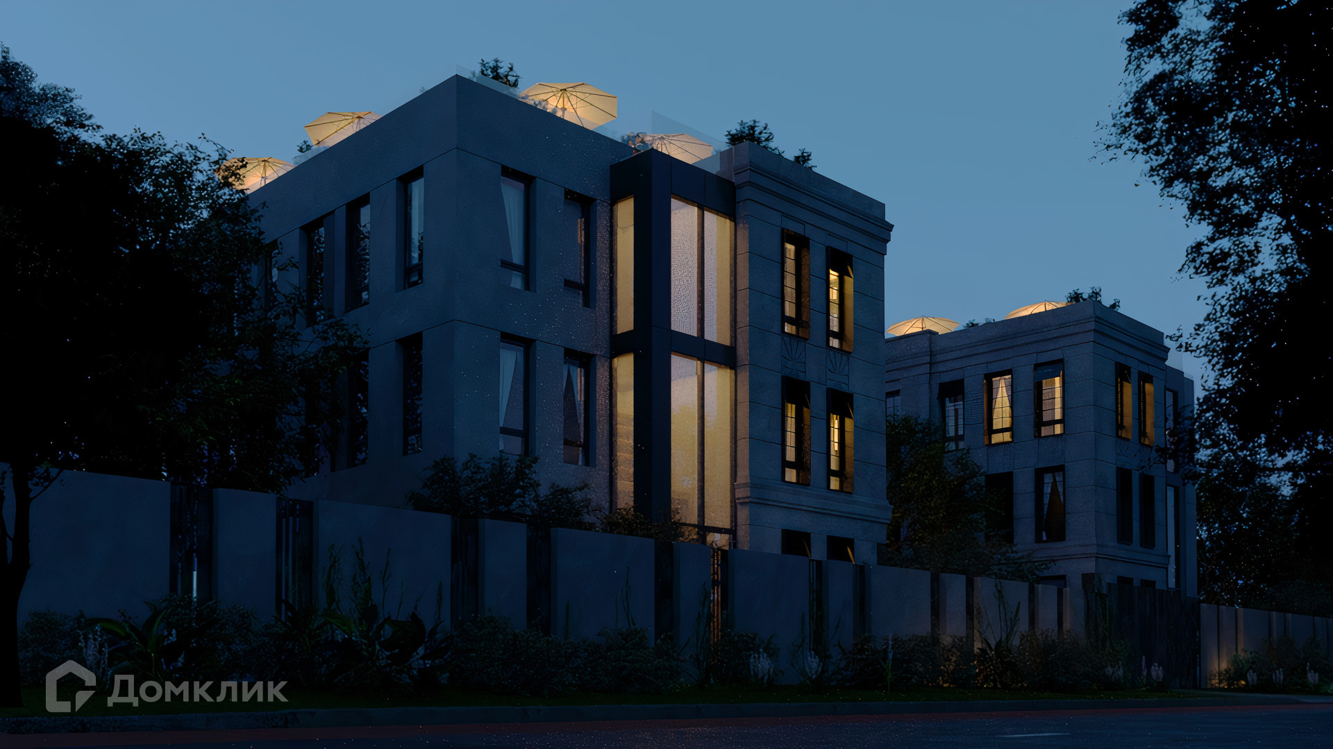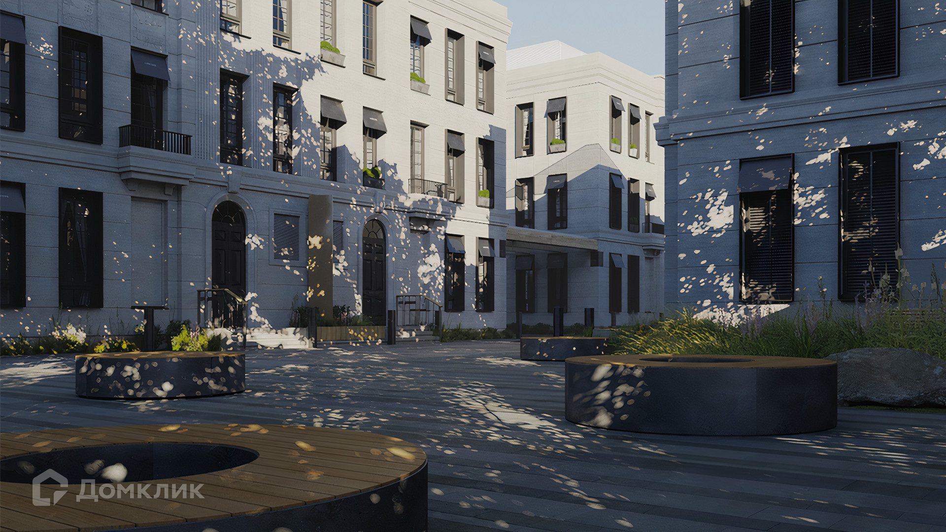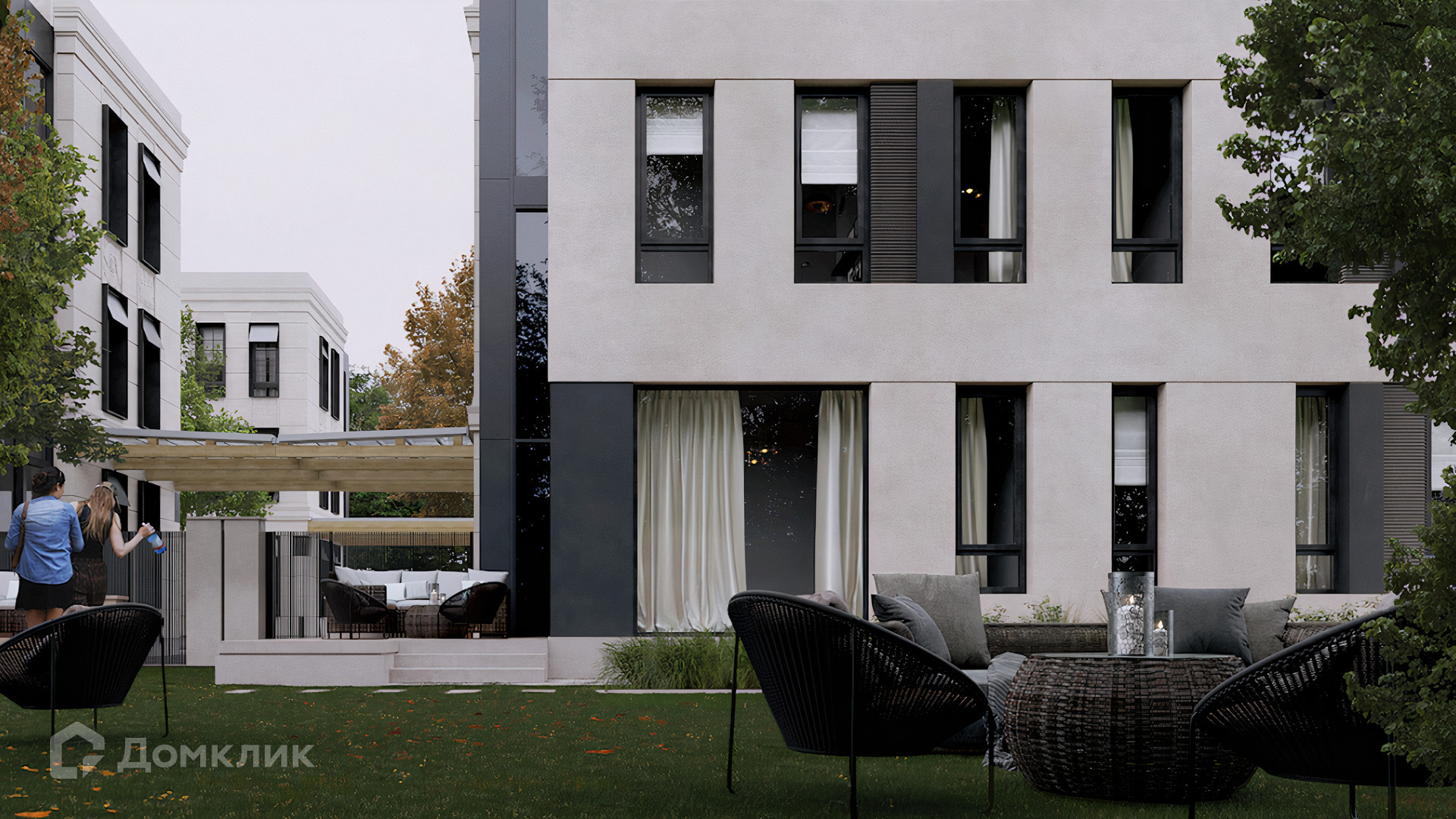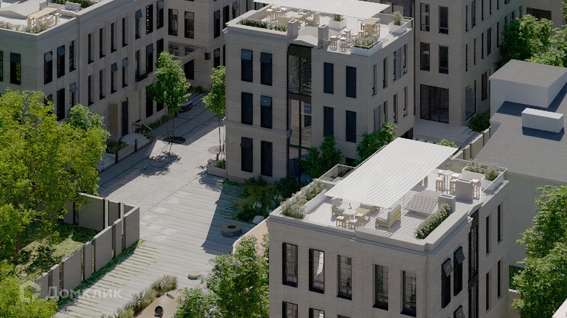 ID 10 808. Lumiere. Таунхаус площадью 264 м² расположен на участке 2,5 сотки. Белый фасад в неоклассическом стиле облицован натуральным камнем — песчанником. Дом без отделки подходит для реализации индивидуального дизайн-проекта. Внутри разместили 4 спальни, кухню-столовую, гостиную, 2 кабинета, а на эксплуатируемой крыше оборудована крытая терраса. На участке с газоном можно обустроить зону барбекю.