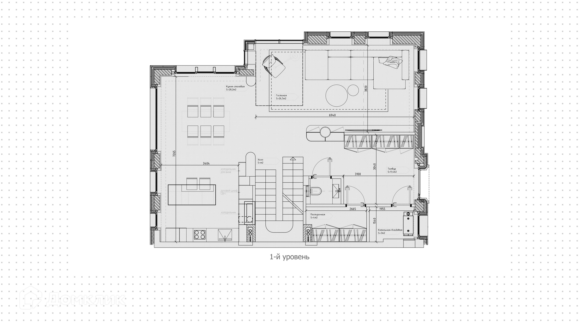 1-й уровень: холл, кухня-столовая, гостиная, тамбур, постирочная, котельная-кладовая.