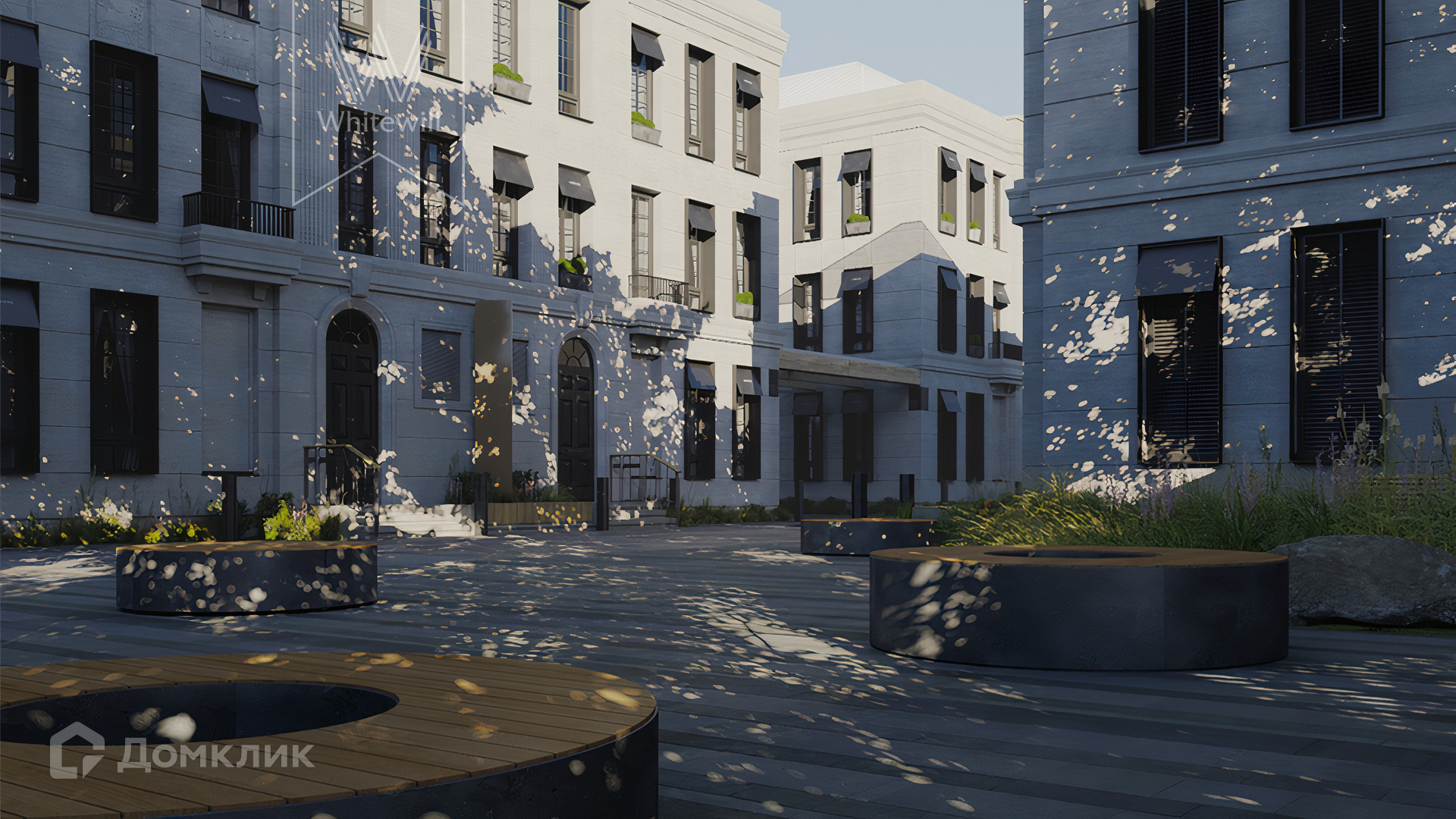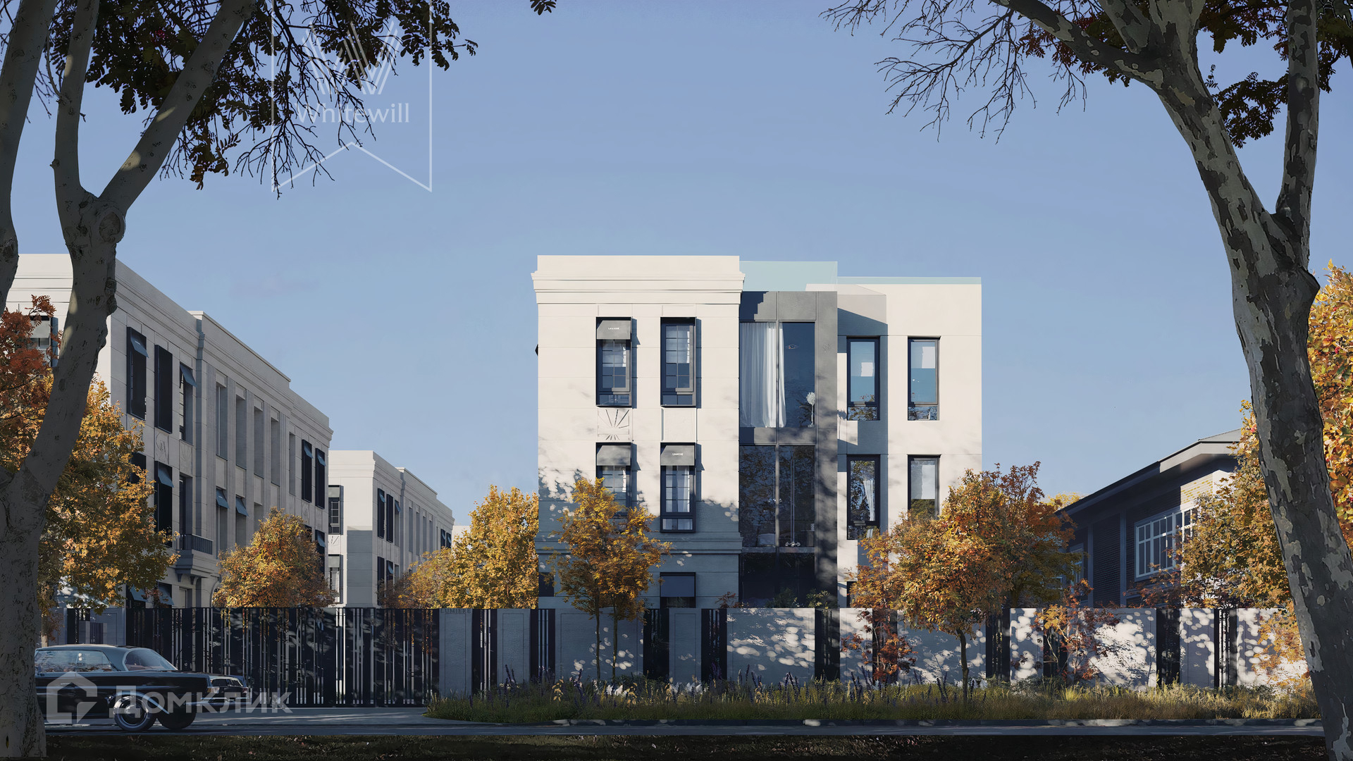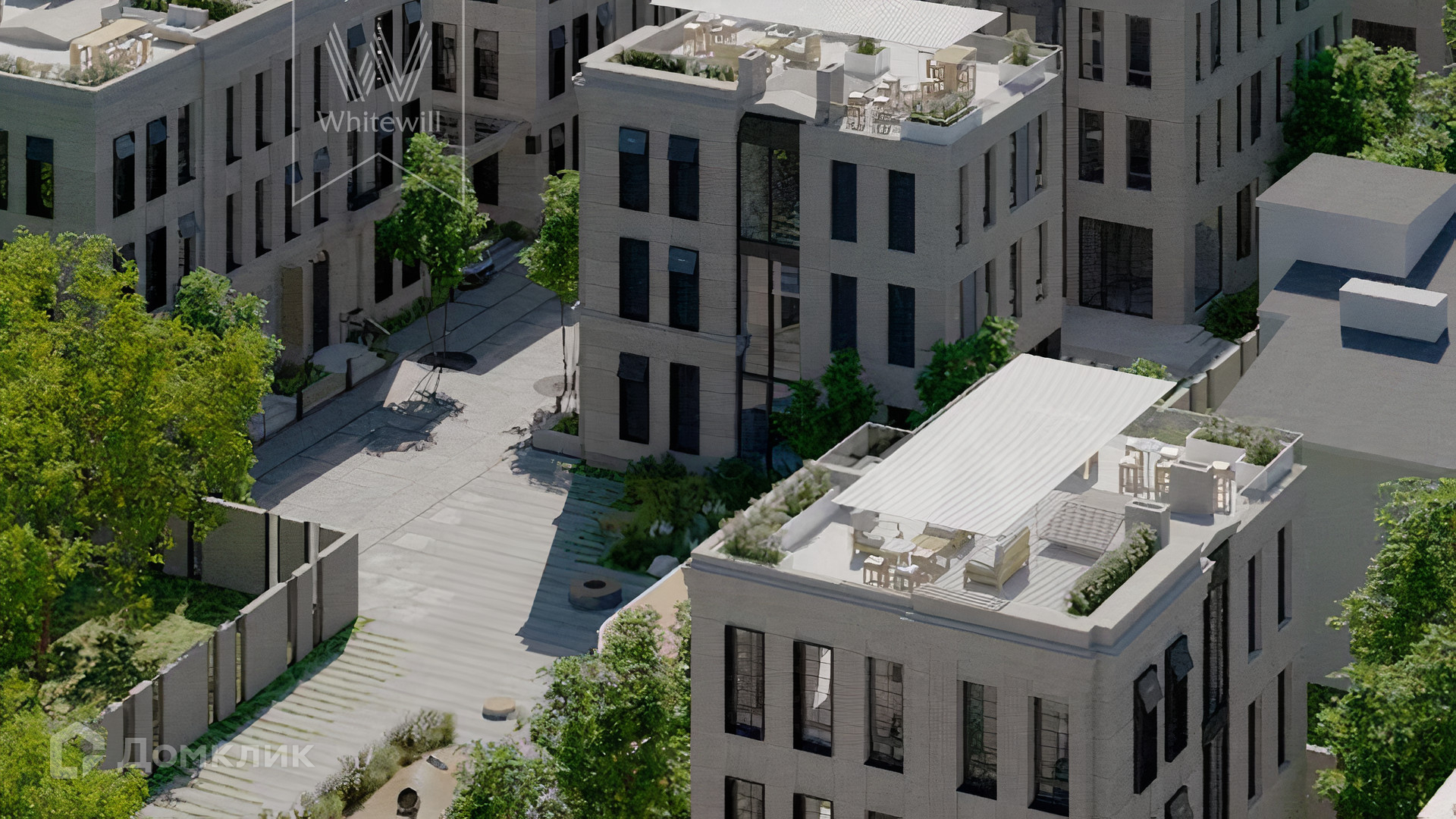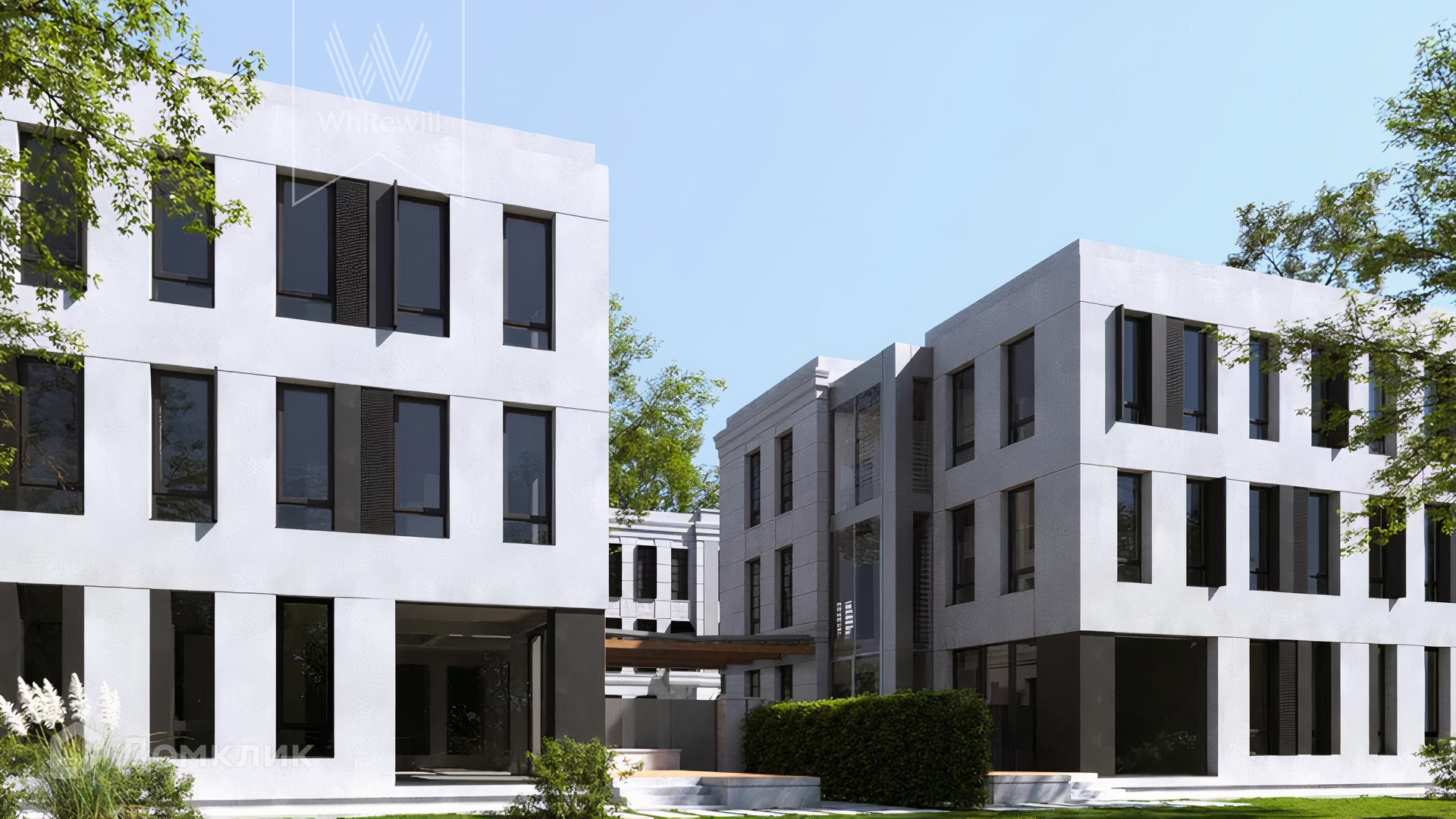 ID 10 808. Lumiere. Таунхаус площадью 264 м² расположен на участке 2,5 сотки. Белый фасад в неоклассическом стиле облицован натуральным камнем — песчанником. Дом без отделки подходит для реализации индивидуального дизайн-проекта. Внутри разместили 4 спальни, кухню-столовую, гостиную, 2 кабинета, а на эксплуатируемой крыше оборудована крытая терраса. На участке с газоном можно обустроить зону барбекю.