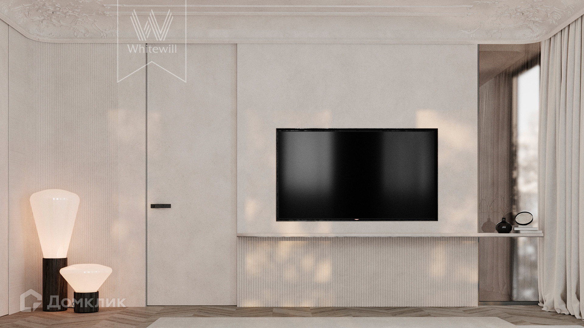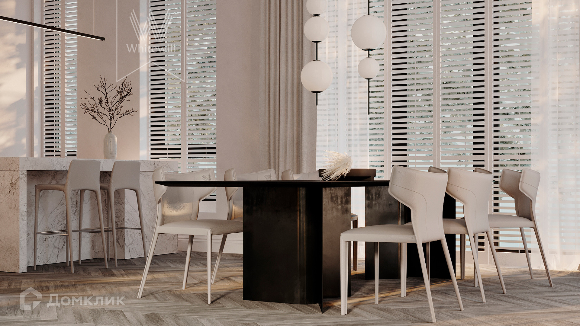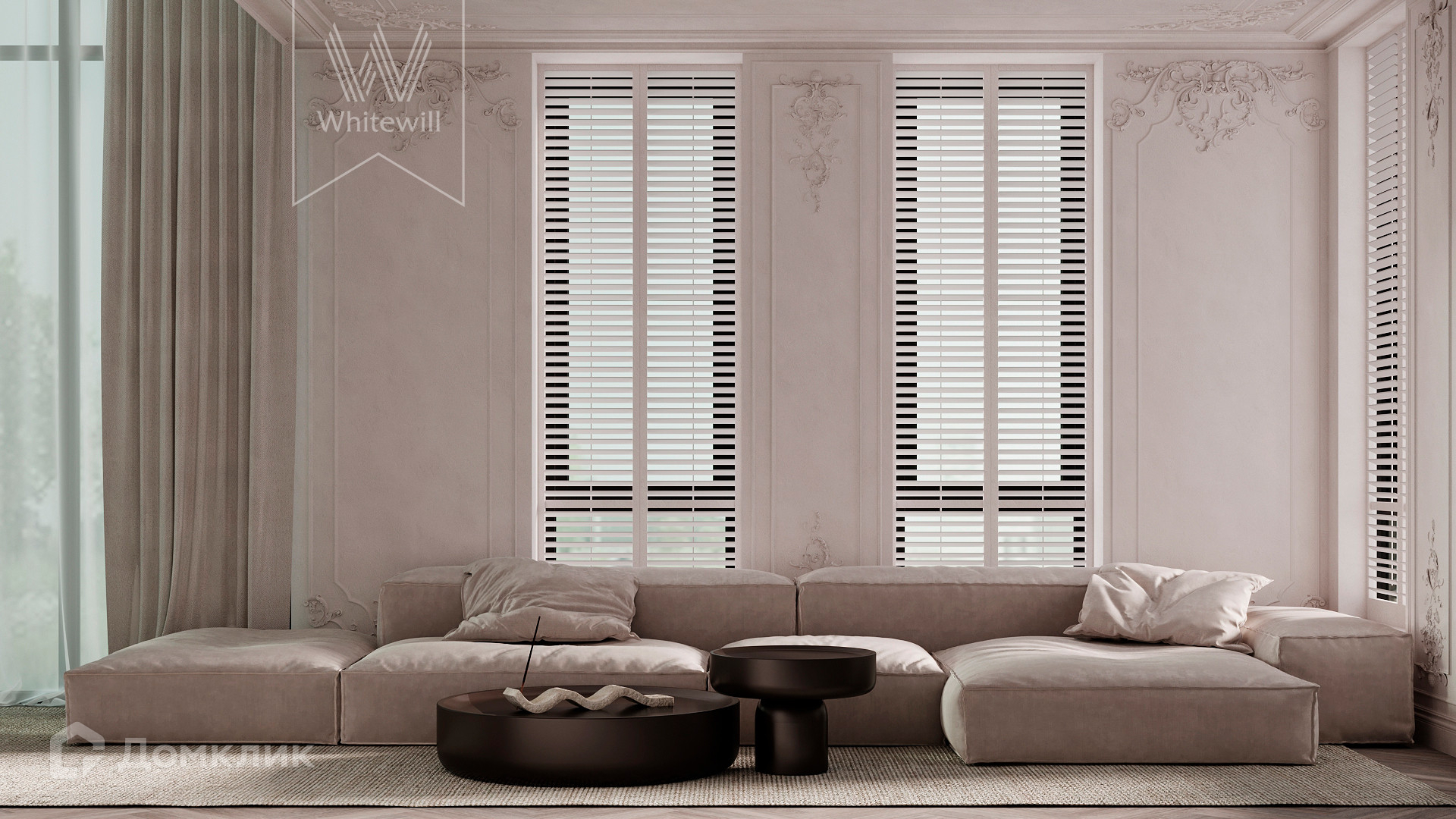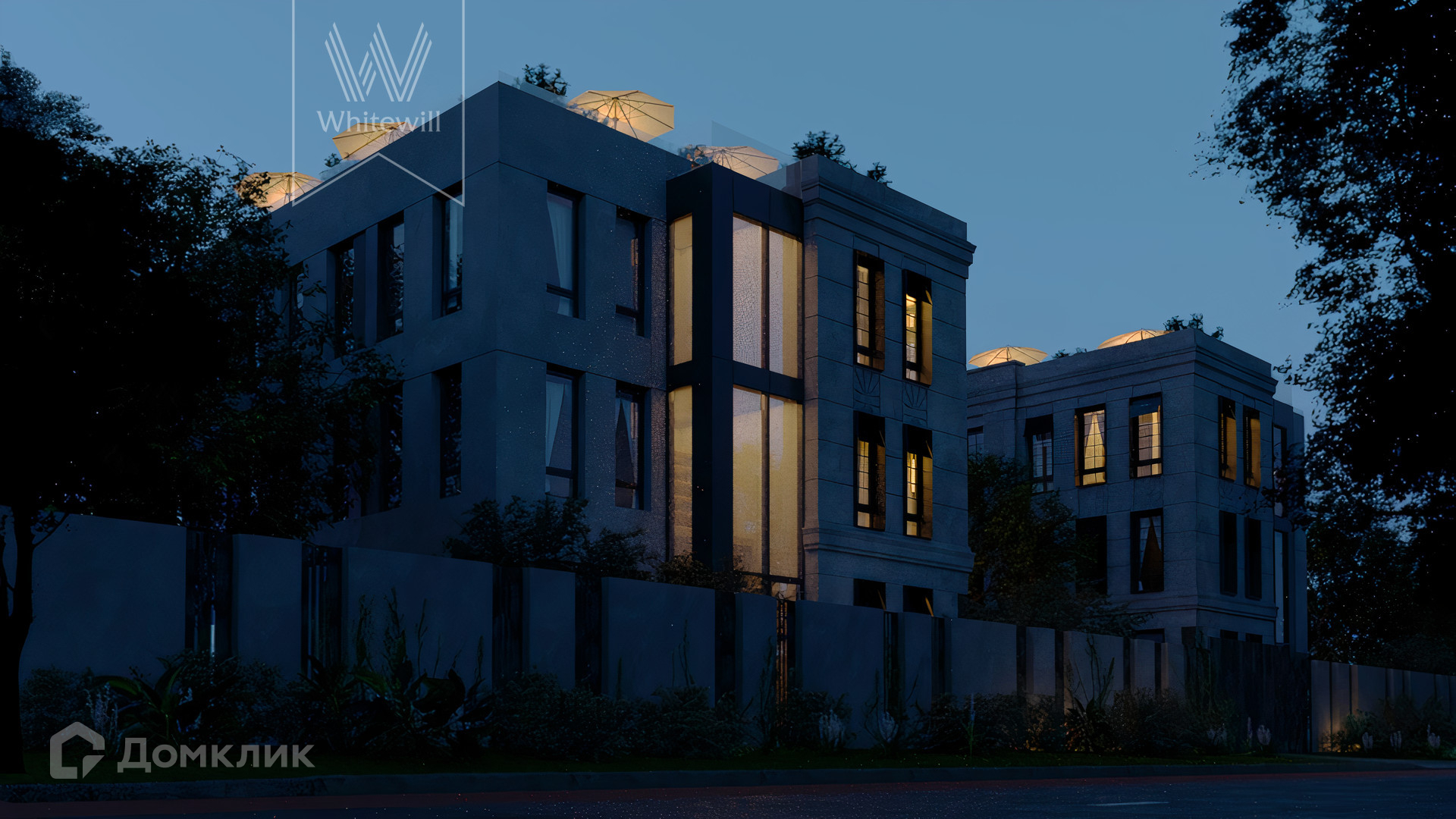 ID 10 808. Lumiere. Таунхаус площадью 264 м² расположен на участке 2,5 сотки. Белый фасад в неоклассическом стиле облицован натуральным камнем — песчанником. Дом без отделки подходит для реализации индивидуального дизайн-проекта. Внутри разместили 4 спальни, кухню-столовую, гостиную, 2 кабинета, а на эксплуатируемой крыше оборудована крытая терраса. На участке с газоном можно обустроить зону барбекю.