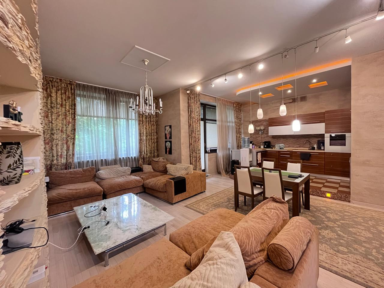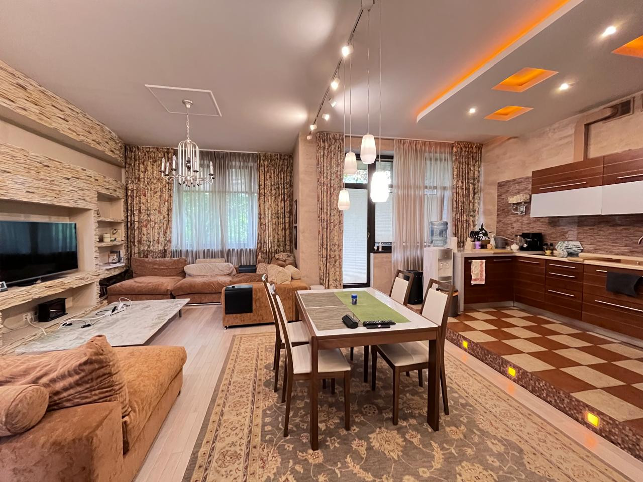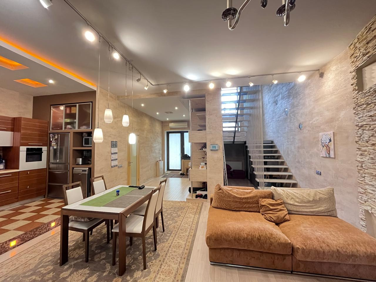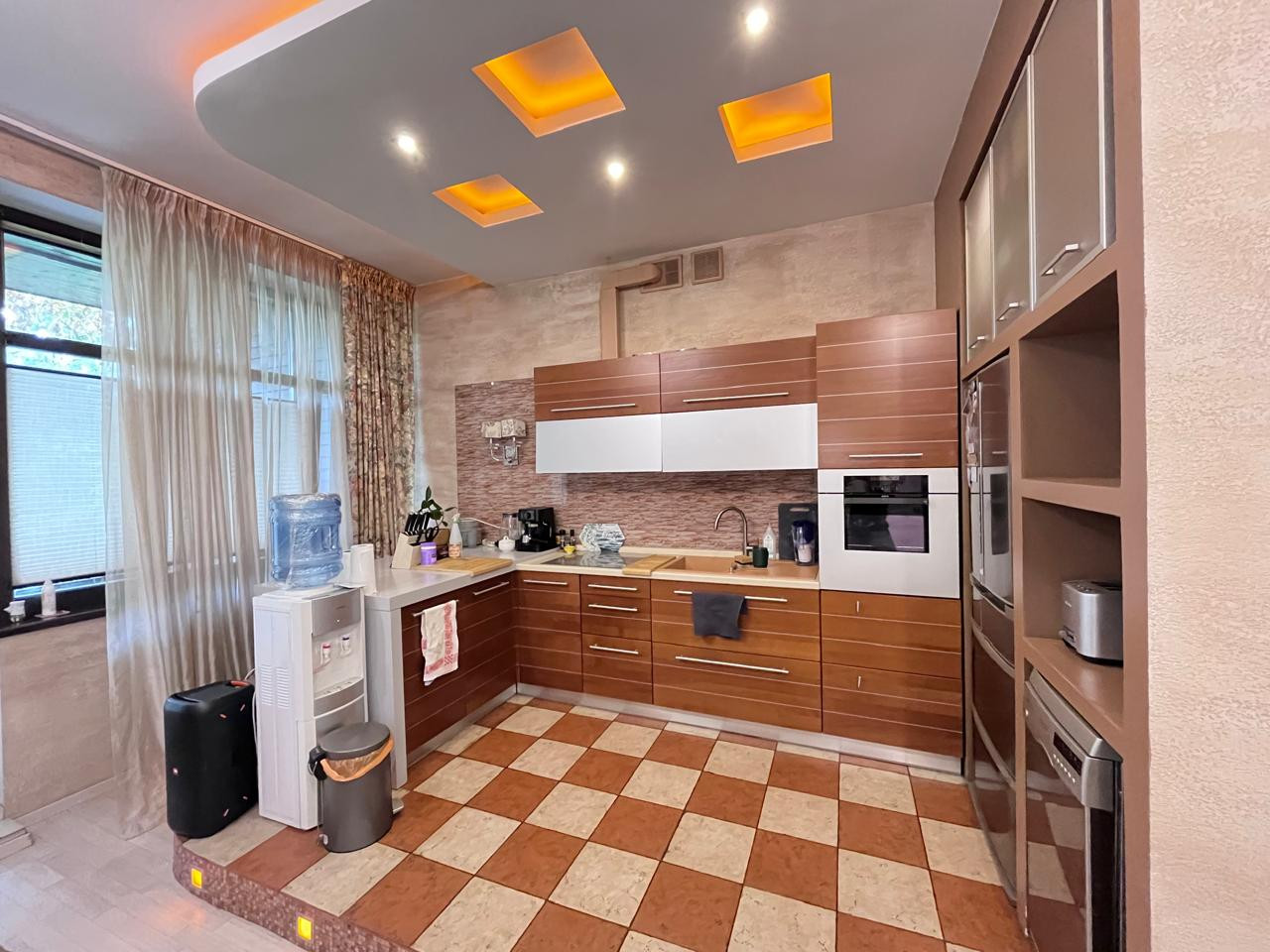 На первом этаже расположена просторная кухня-гостиная, холл, кладовая, с/узел, котельная с отдельным входом и оборудована великолепная открытая терраса для. отдыха в летний и зимний периоды с выходом на свой красивый небольшой участок.