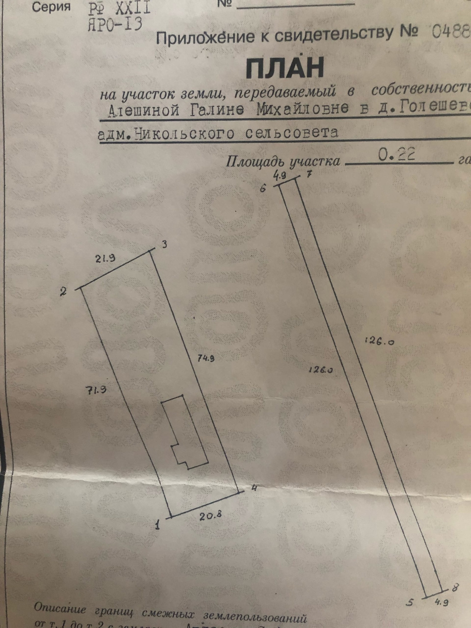 Дом бревенчатый, год постройки где-то 1937, две жилых комнаты : большая комната 16,2, малая комната 11,5. Газ на участке через болоны, есть плита подведенная к газовому посту. Отопление печное, вода на участке проведена на маленькую колонку (вода только холодная). Вся земельная площадь разделена на два участка: основной участок где стоит дом площадью 15,7 соток, вторая часть земли за домом площадью 6,3 соток. Туалет на улице, вода на улице, есть погреб, крыша была поменяна (новая, шифер), двор переделан под гараж, имеется два сарая (в хорошем состоянии), фундамент на кирпичных столбах (отремонтирован).