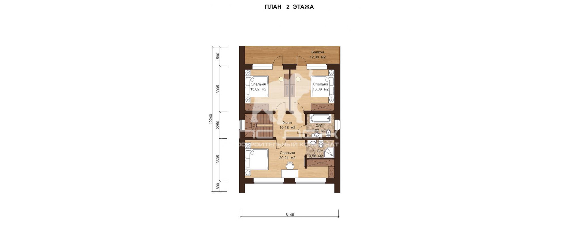 2-й этаж: 3 комнаты, общий санузел, гардеробная + санузел в мастер спальне.