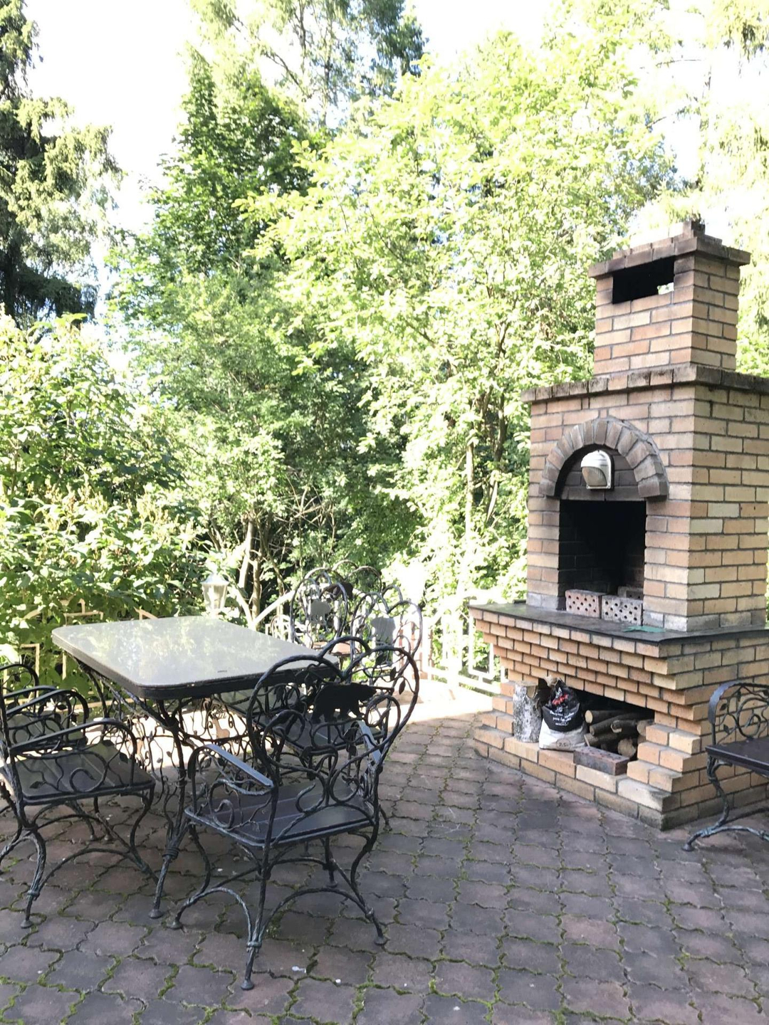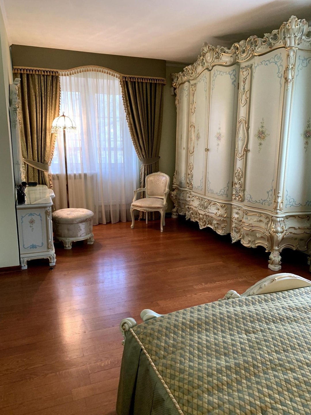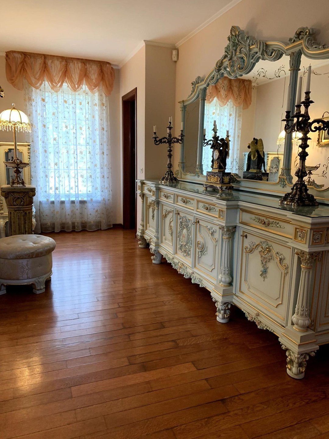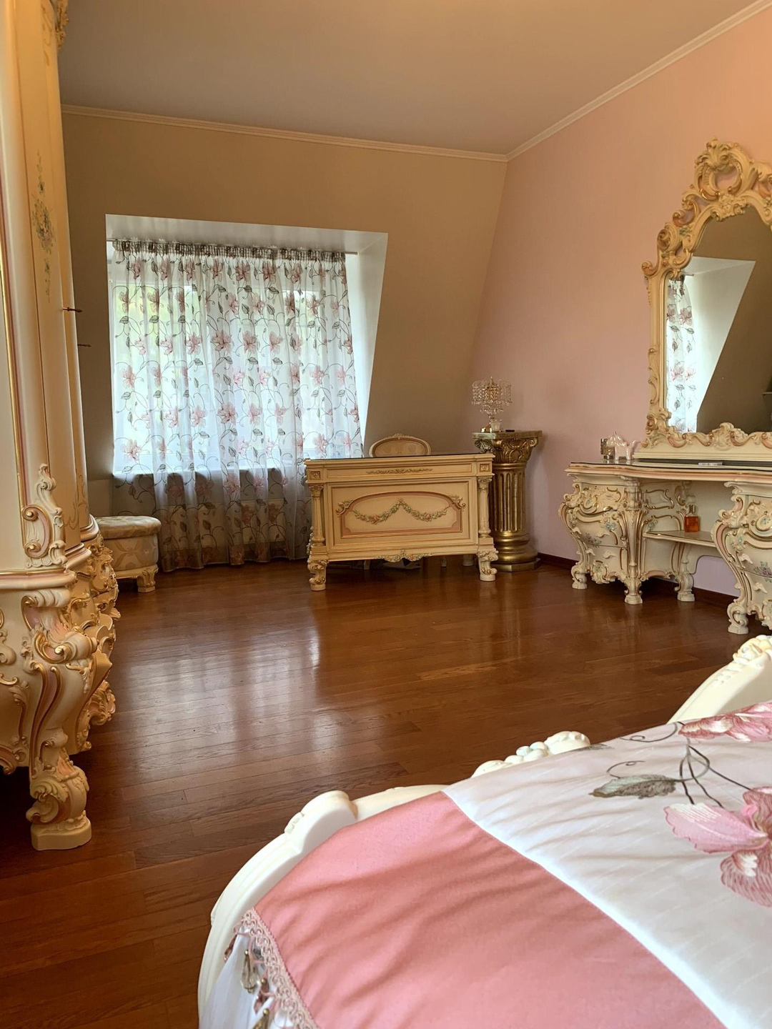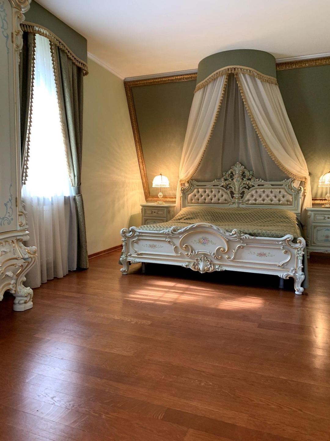 Основной дом выполнен из кирпича, состоит из 3 этажей, имеет настоящую черепичную крышу, меблирован в стиле барокко.