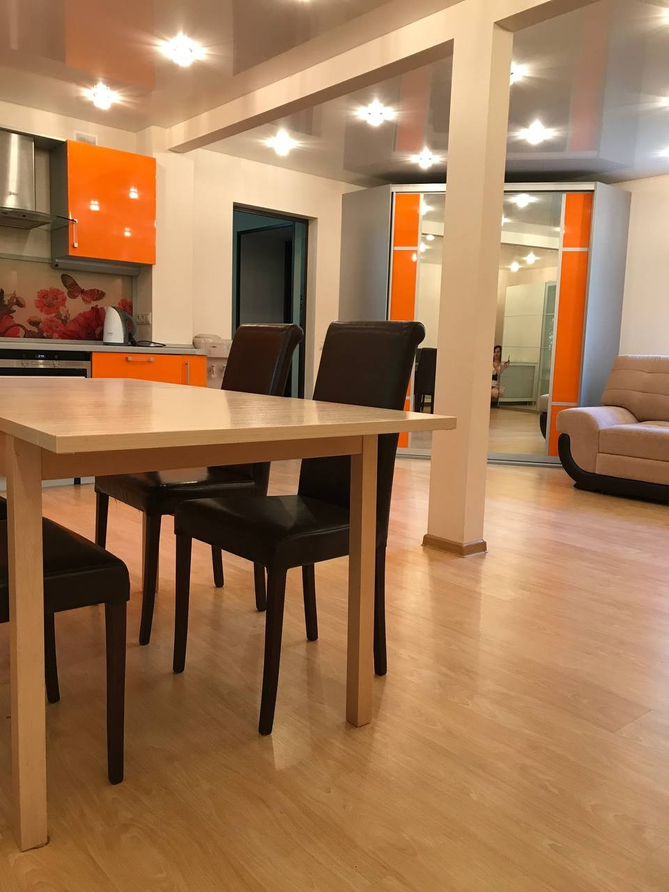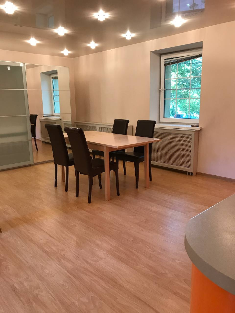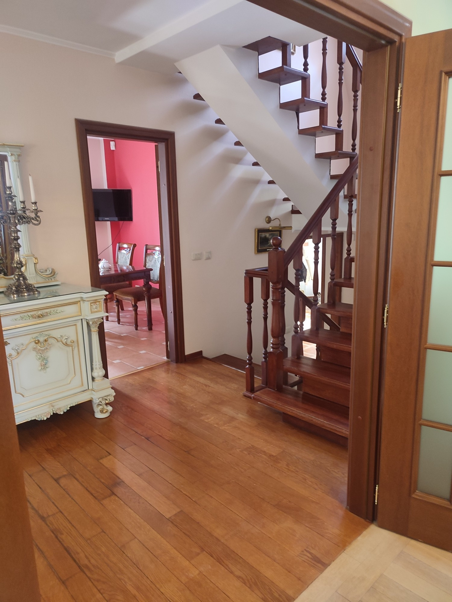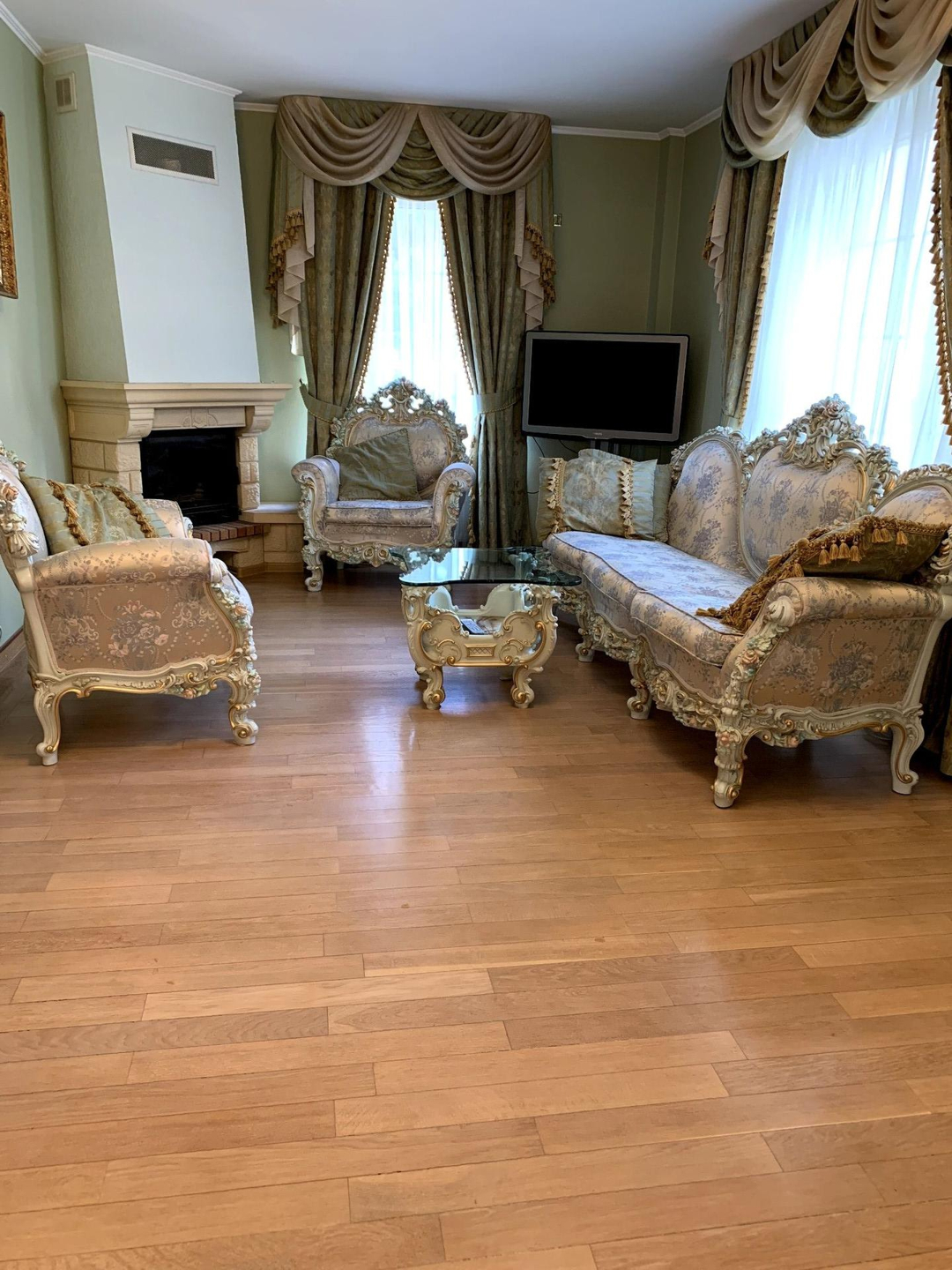 1 этаж- уютная, светлая гостиная с камином, просторный холл, кухня- столовая и санузел.