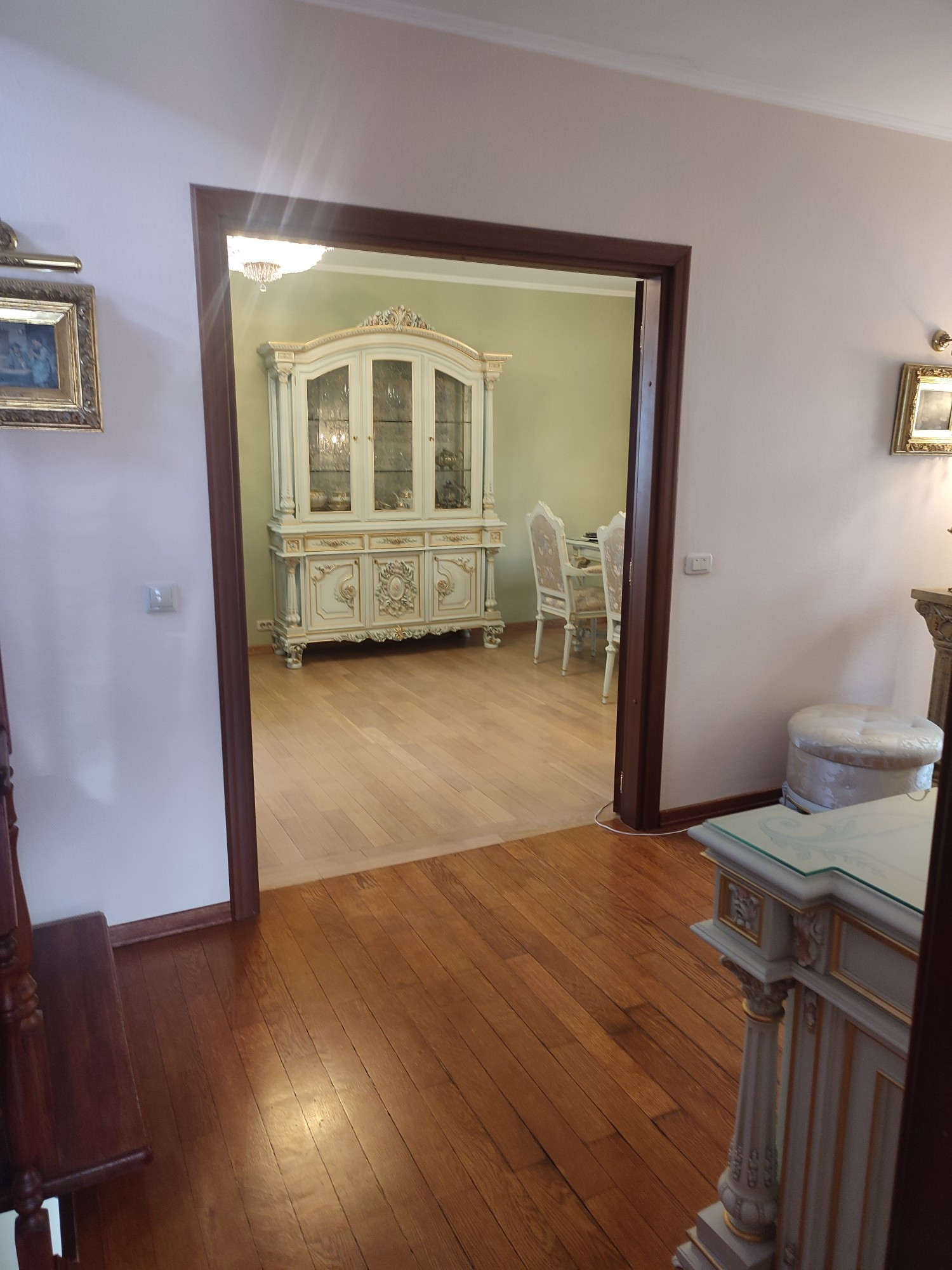 На Цокольном этаже находится выход на площадку барбекю, оборудованная кухня с кухонным гарнитуром из натурального дерева. Вместительная гардеробная комната, сауна, санузел, постирочная