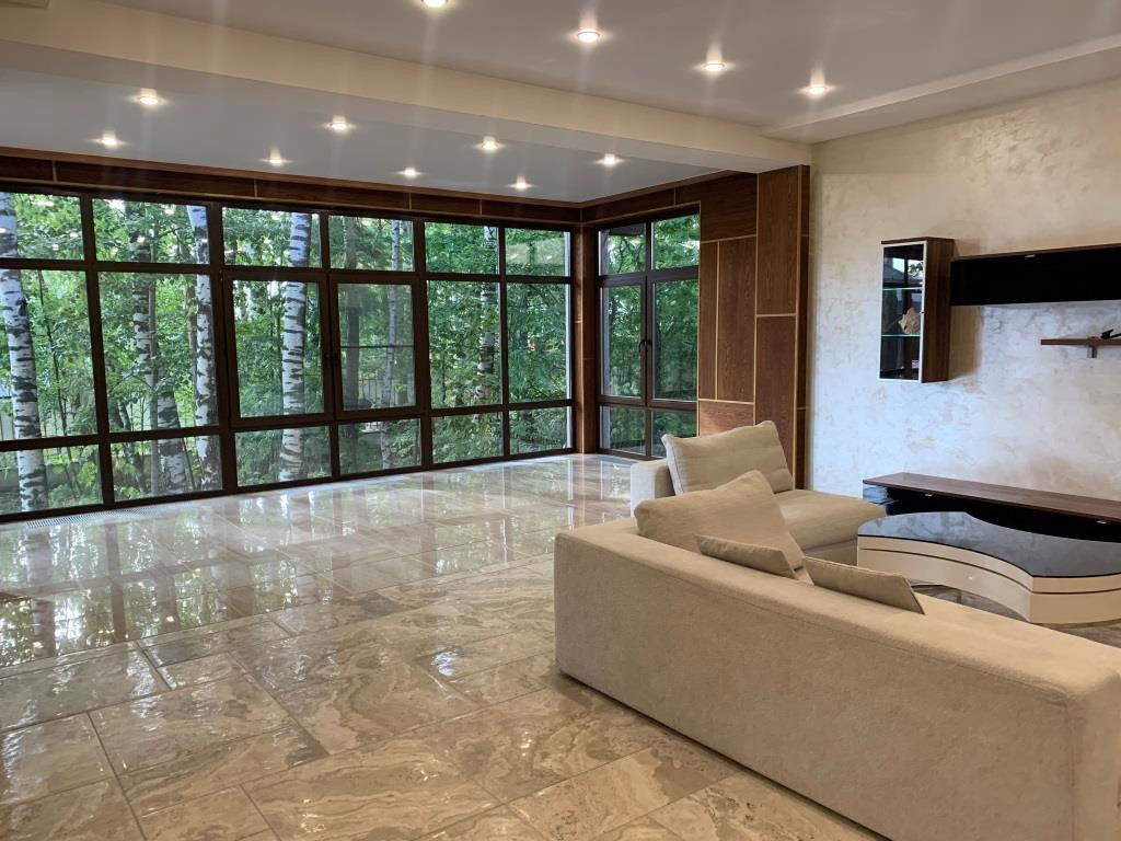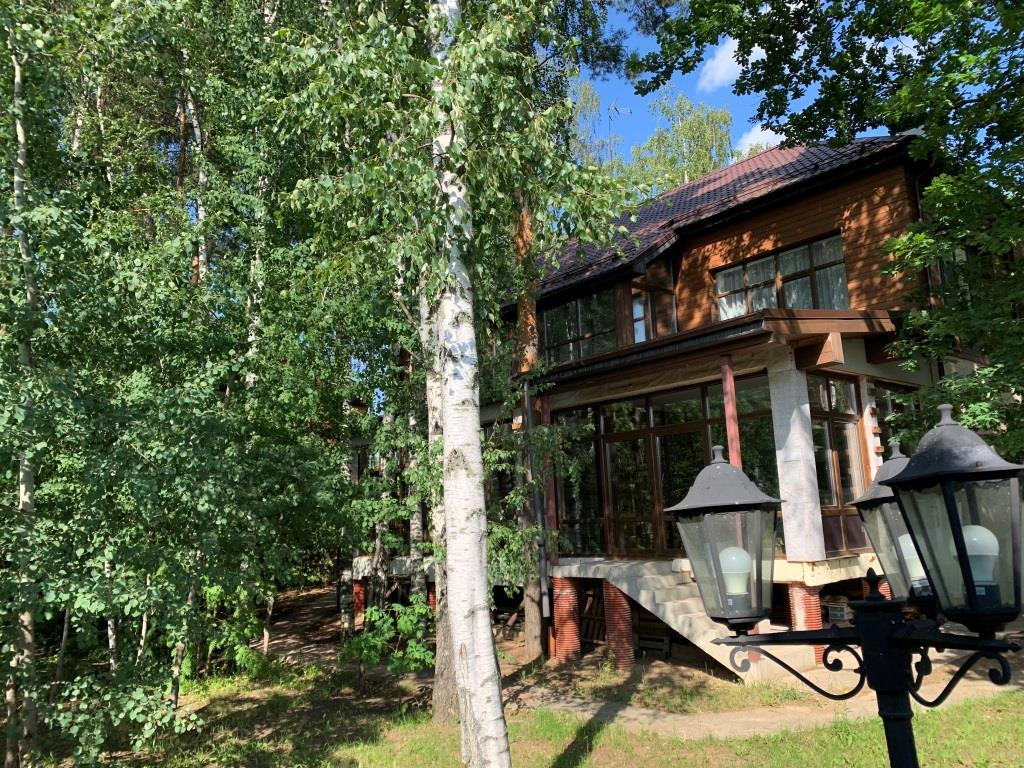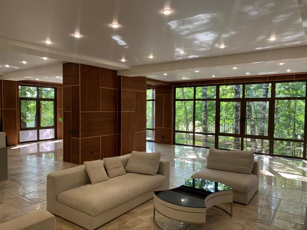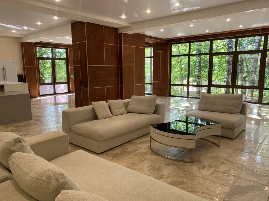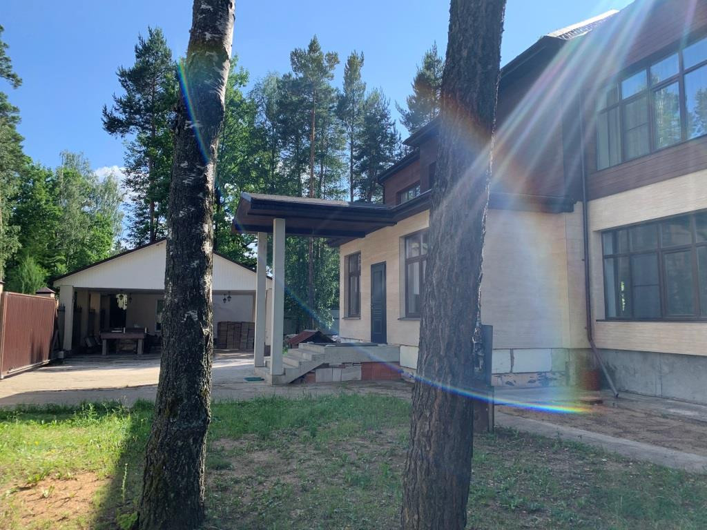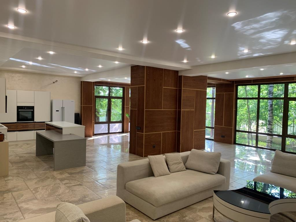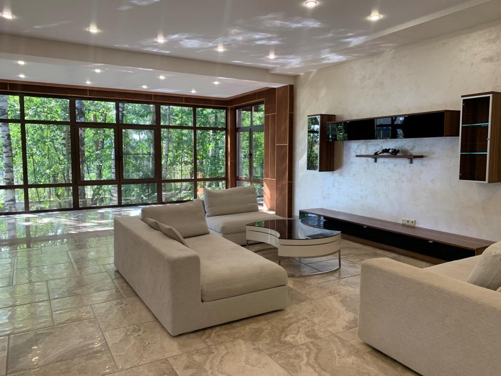 Дом с мебелью и дизайнерской отделкой в современном стиле на лесном участке в элитном охраняемом поселке Фэмили Клаб. Панорамное остекление, встроенная итальянская кухня с техникой, 5 спален, 4 с/у, гардеробные, кабинет, бассейн, сауна, СПА зона, спортзал. много деревьев (дорожки натуральный камень), дренаж, спорт площадка, На участке дом для персонала с навесом для машин, автоматич. ворота.
