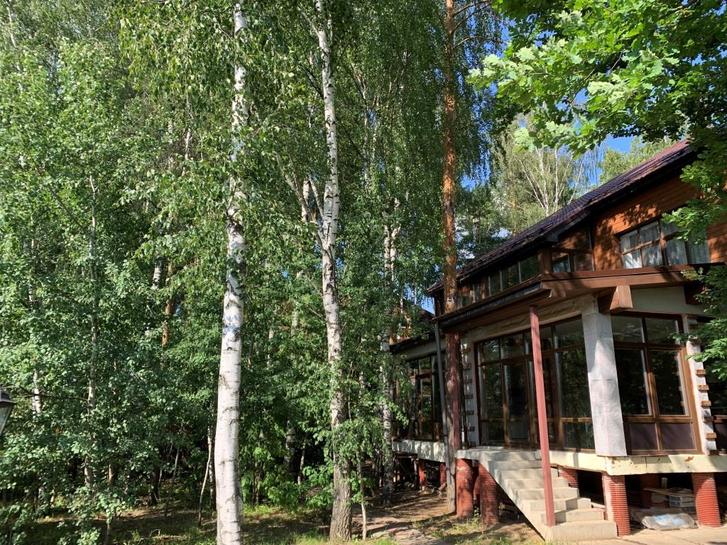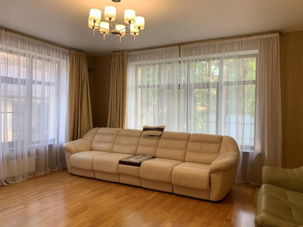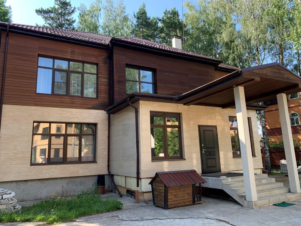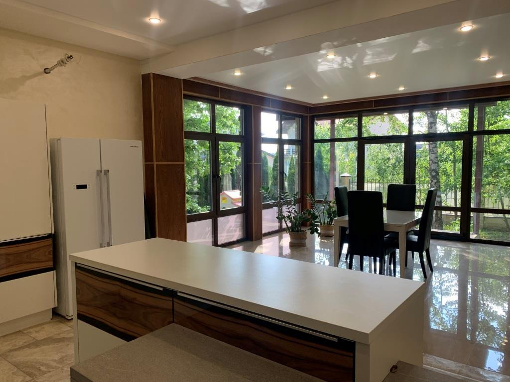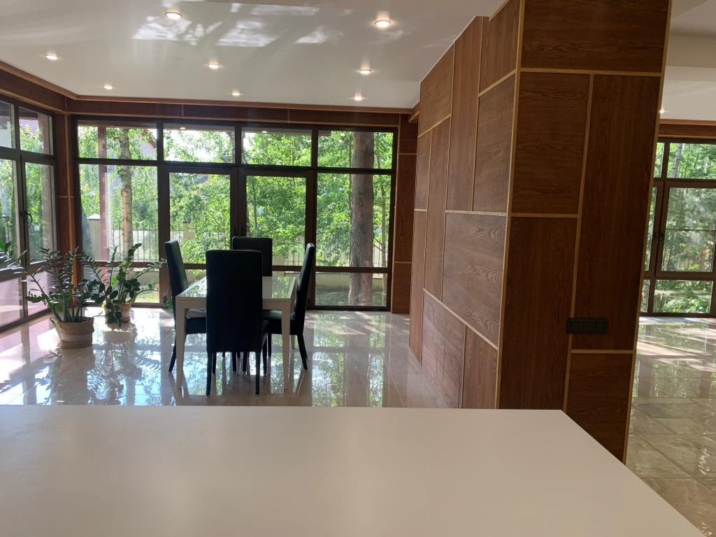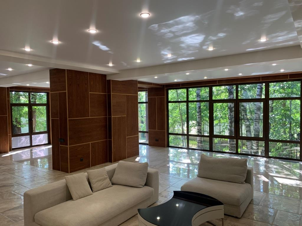 Дом с мебелью и дизайнерской отделкой в современном стиле на лесном участке в элитном охраняемом поселке Фэмили Клаб. Панорамное остекление, встроенная итальянская кухня с техникой, 5 спален, 4 с/у, гардеробные, кабинет, бассейн, сауна, СПА зона, спортзал. много деревьев (дорожки натуральный камень), дренаж, спорт площадка, На участке дом для персонала с навесом для машин, автоматич. ворота.