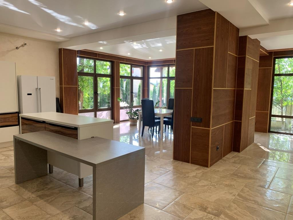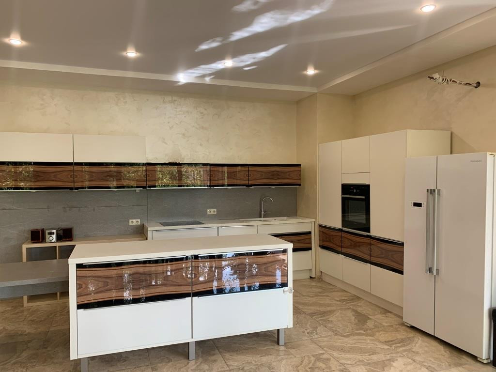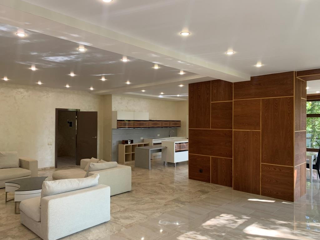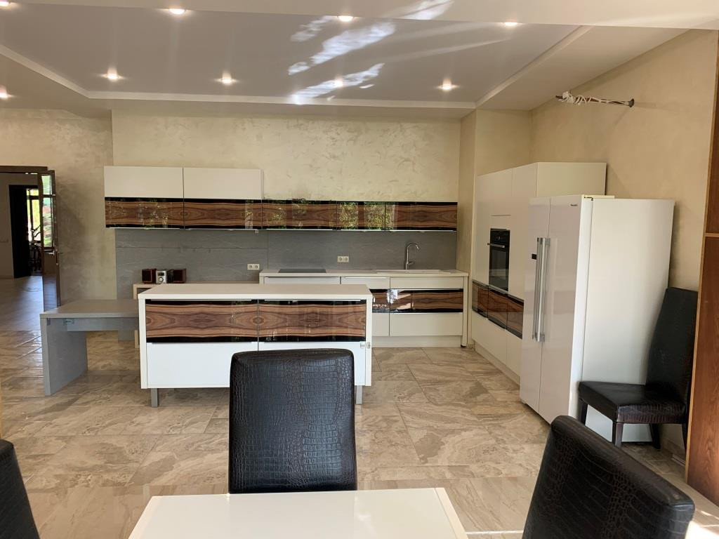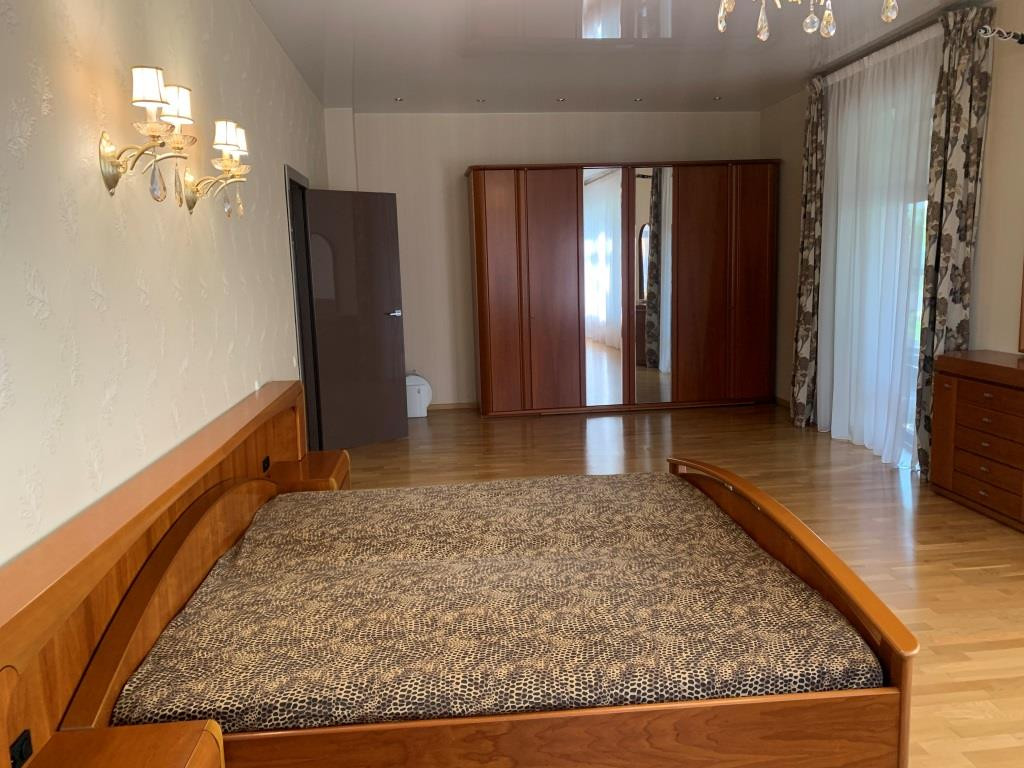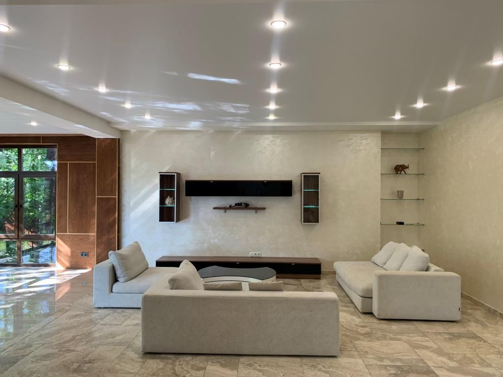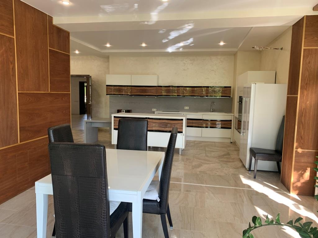 Дом с мебелью и дизайнерской отделкой в современном стиле на лесном участке в элитном охраняемом поселке Фэмили Клаб. Панорамное остекление, встроенная итальянская кухня с техникой, 5 спален, 4 с/у, гардеробные, кабинет, бассейн, сауна, СПА зона, спортзал. много деревьев (дорожки натуральный камень), дренаж, спорт площадка, На участке дом для персонала с навесом для машин, автоматич. ворота.