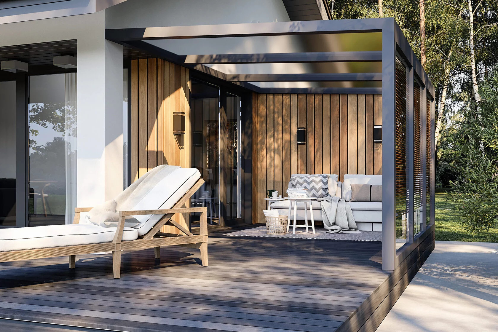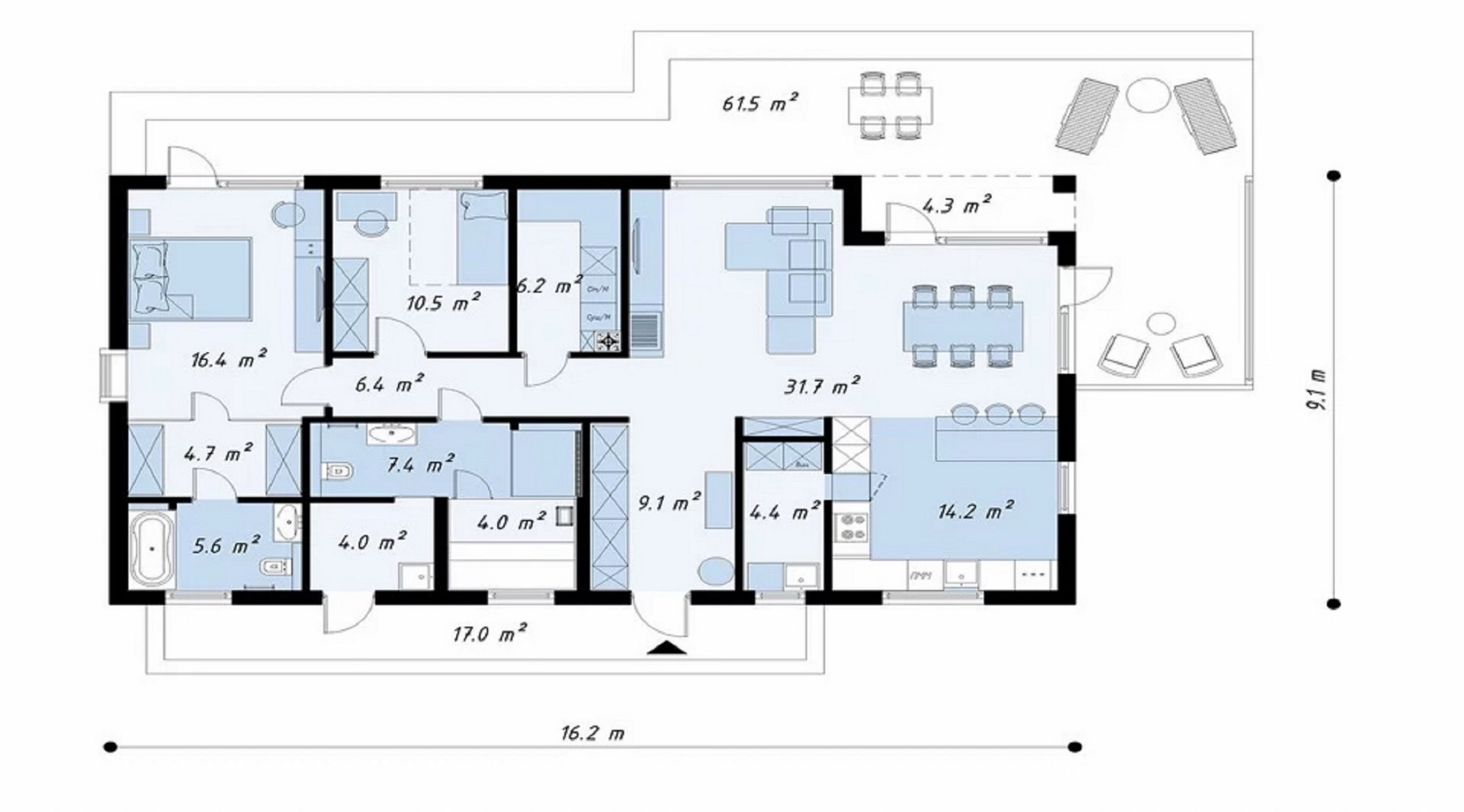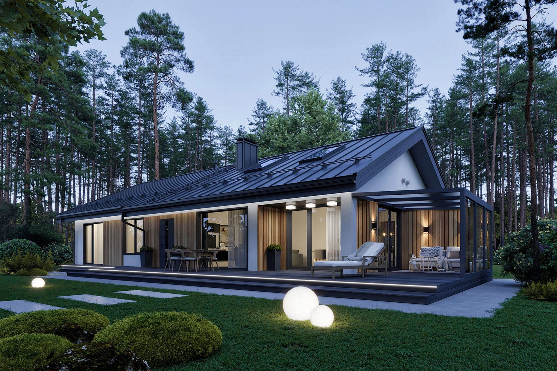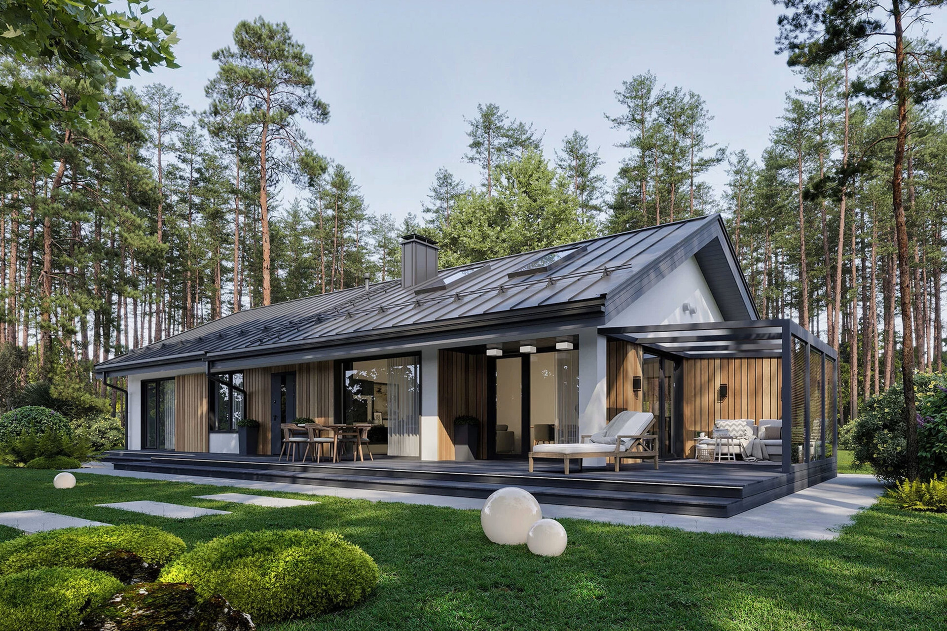 Наш дом простой, но одновременно элегантный в модном архитектурном стиле и отвечает современным представлениям о загородном жилье. Будущий владелец может смоделировать базовый проект дома: менять расположение и размер комнат, количество и тип окон и дверей. Возможны варианты с панорамными окнами и дверьми и выходом из спальни прямо на открытую веранду. Цикл строительства дома от нашей компании составит не более двух месяцев. При этом мы строим качественно и навсегда.